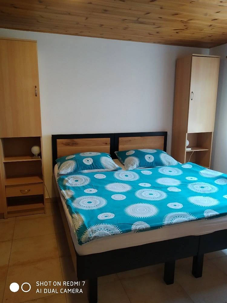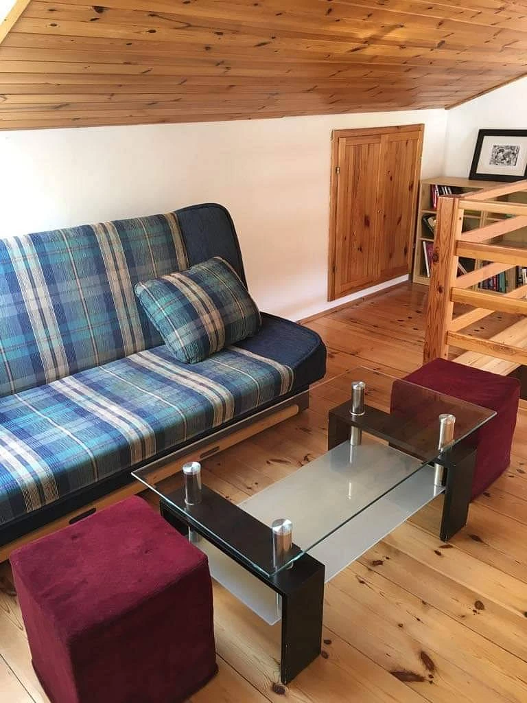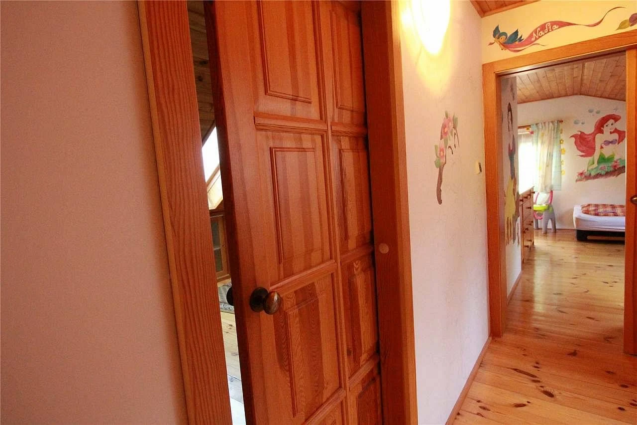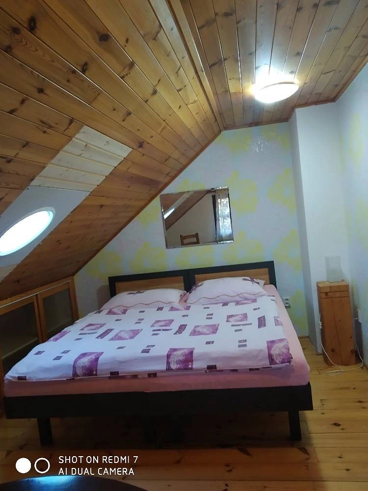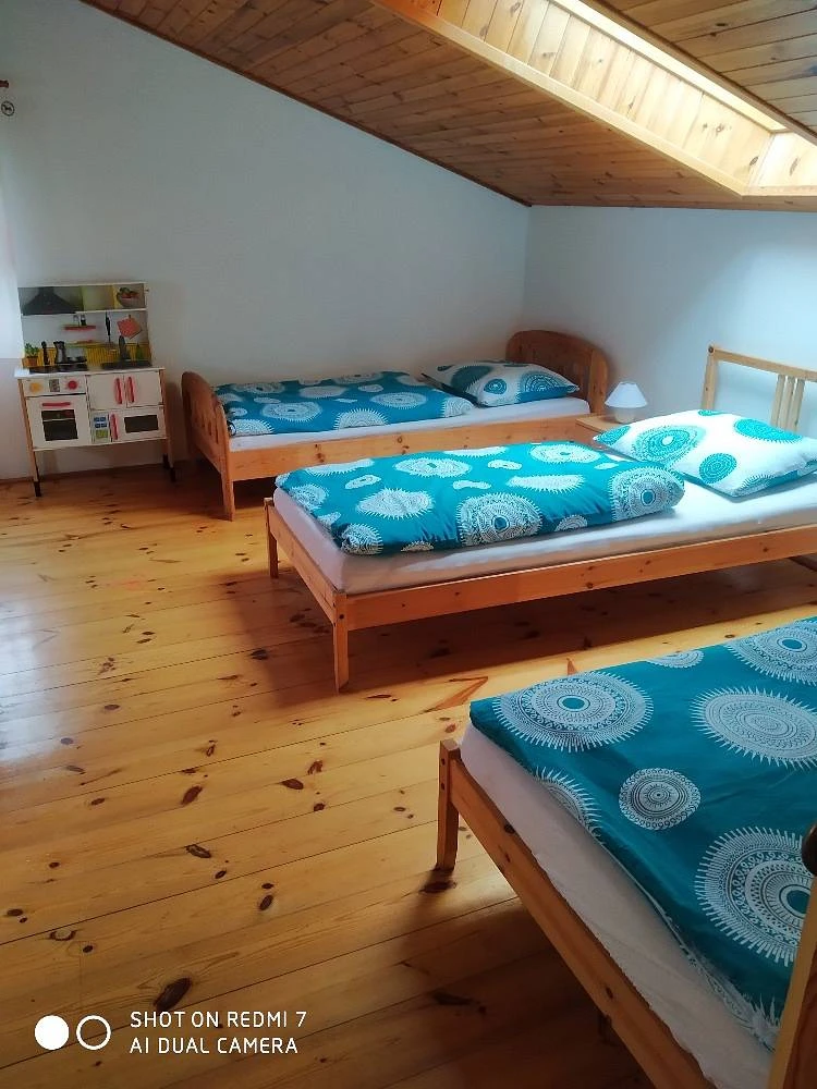 V patře se nachází 3 ložnice: 1x 2-lůžkový pokoj s manželskou postelí, 1x 4-lůžkový pokoj s oddělenými postelemi a 1x 4-lůžkový pokoj s manželskou postelí a dvěma dvoupatrovými postelemi.