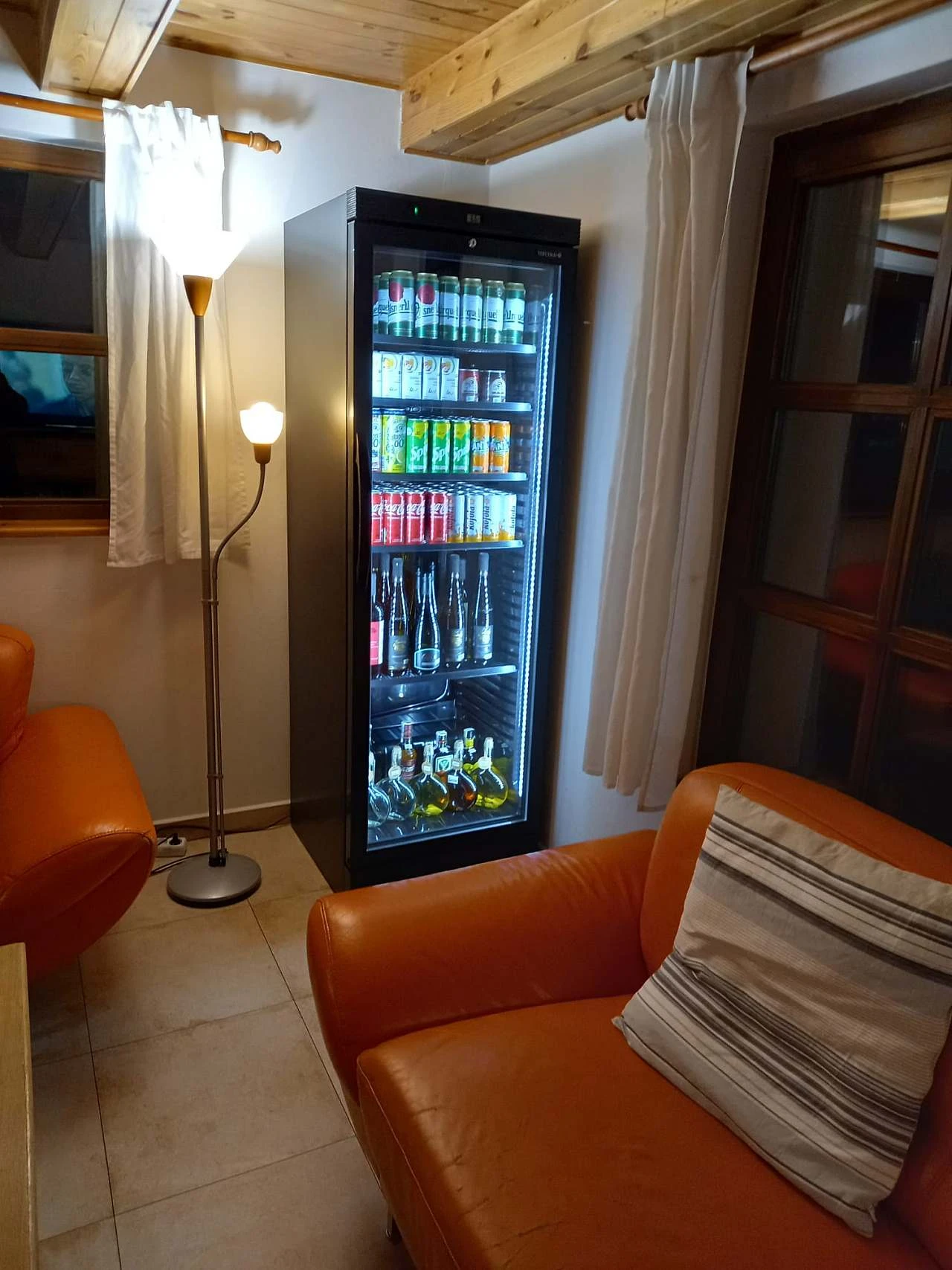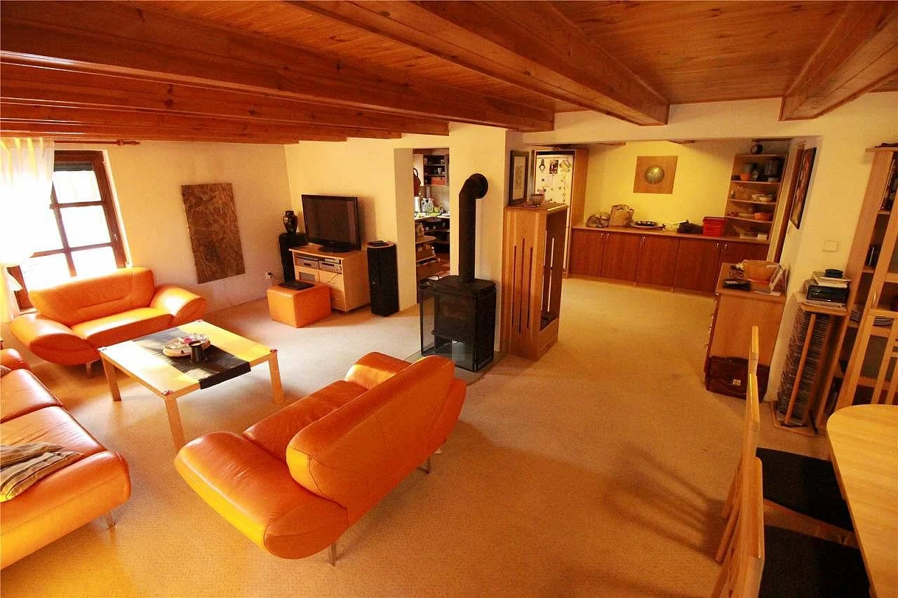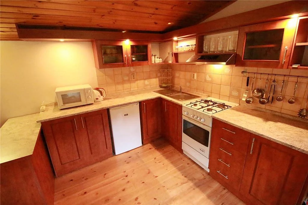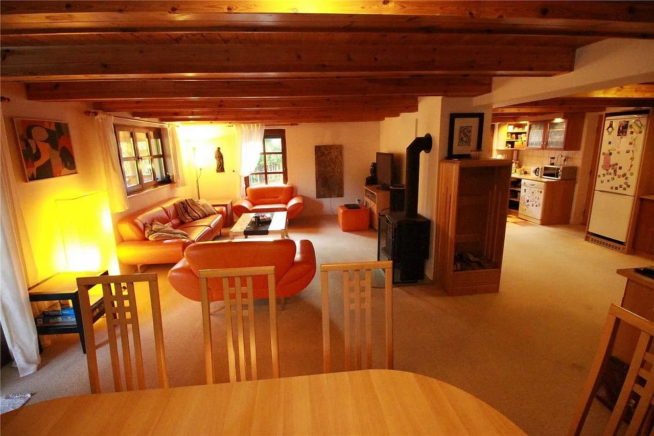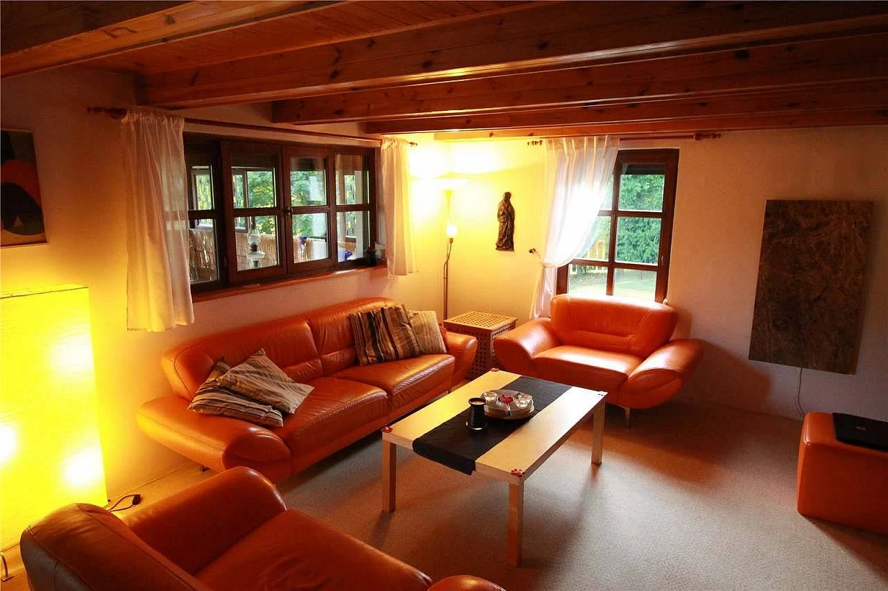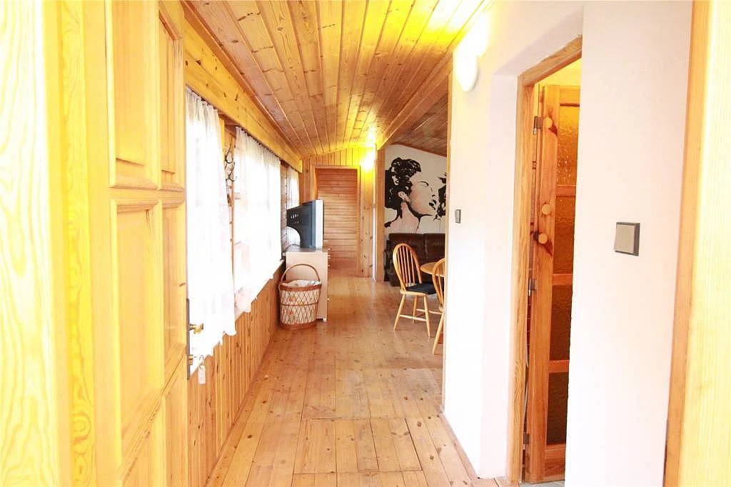 Větší chata poskytuje pohodlné ubytování pro 11 osob. V přízemí najdete prostornou obývací místnost s krbovými kamny, LCD televizí, HiFi soupravou a jídelním stolem. Součástí je kuchyňský kout vybavený elektrickou troubou, plynovým sporákem, mikrovlnnou troubou, ledničkou s mrazničkou, rychlovarnou konvicí a myčkou na nádobí.