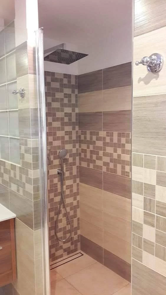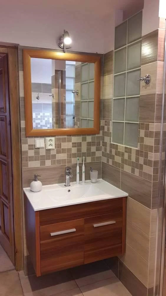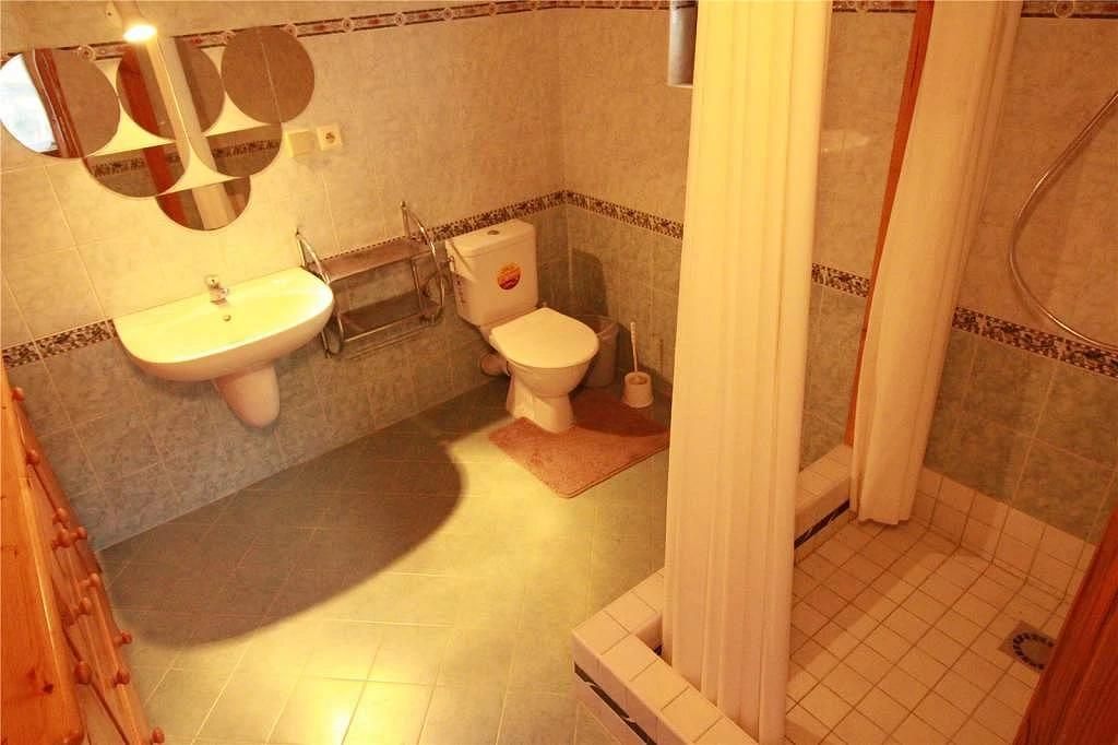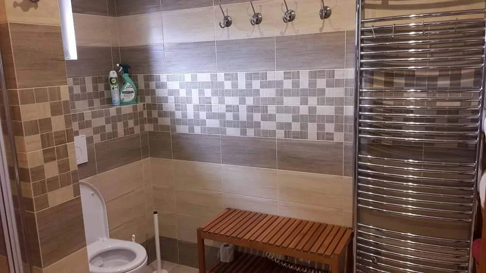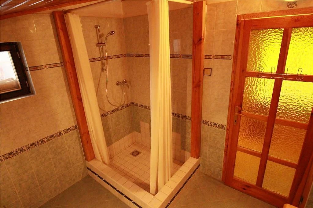 Chata má také koupelnu se sprchovým koutem, bidetem, umyvadlem a toaletou.