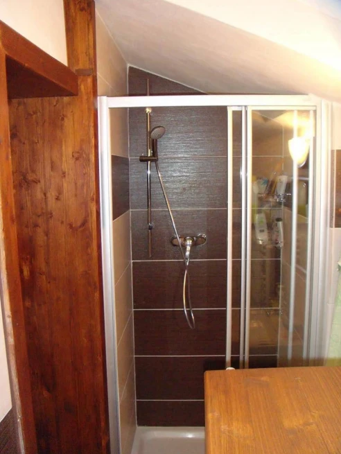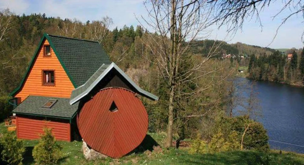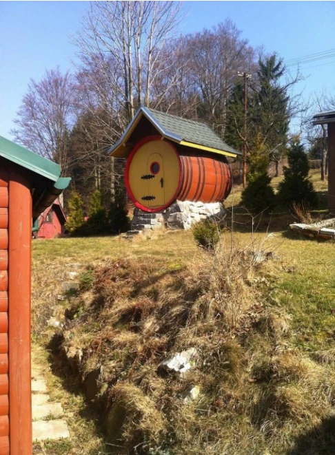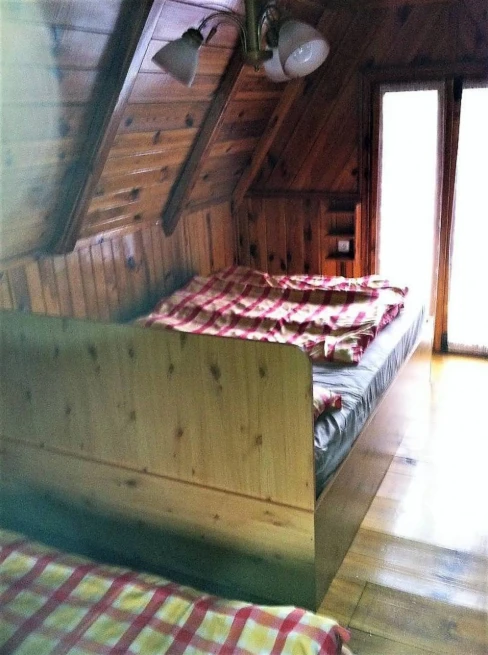 V podkroví chaty je ložnice s manželskou postelí, dvěma samostatnými lůžky a balkonem s výhledem na přehradu. Další dvě místa na spaní jsou připravena v originálním „sudu pro děti“.