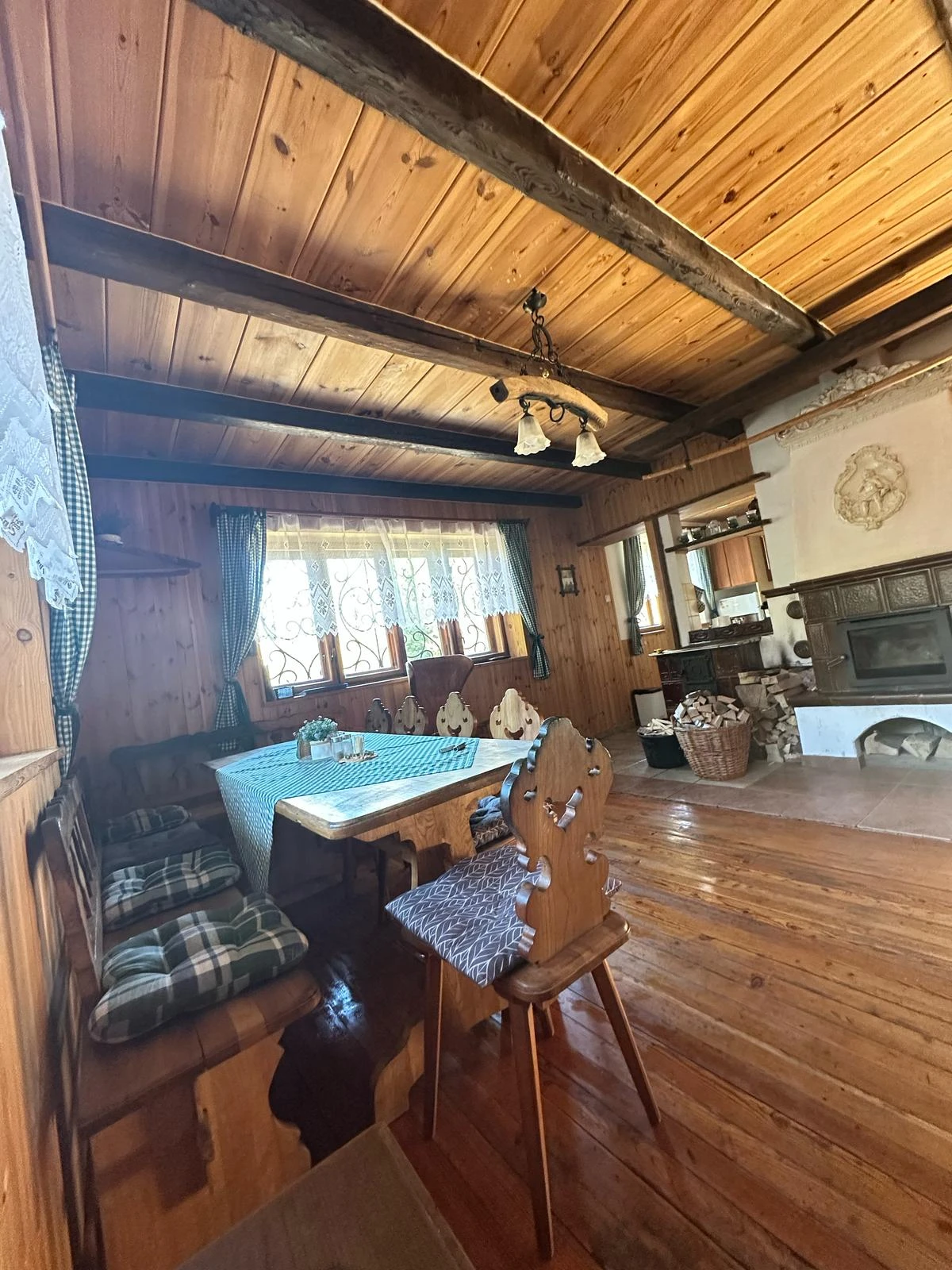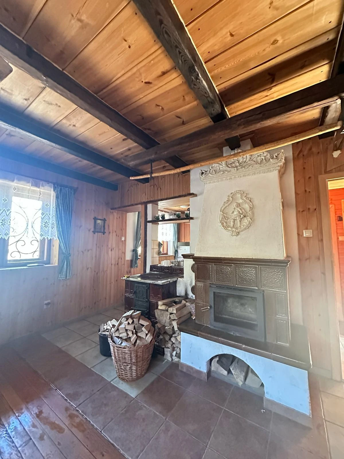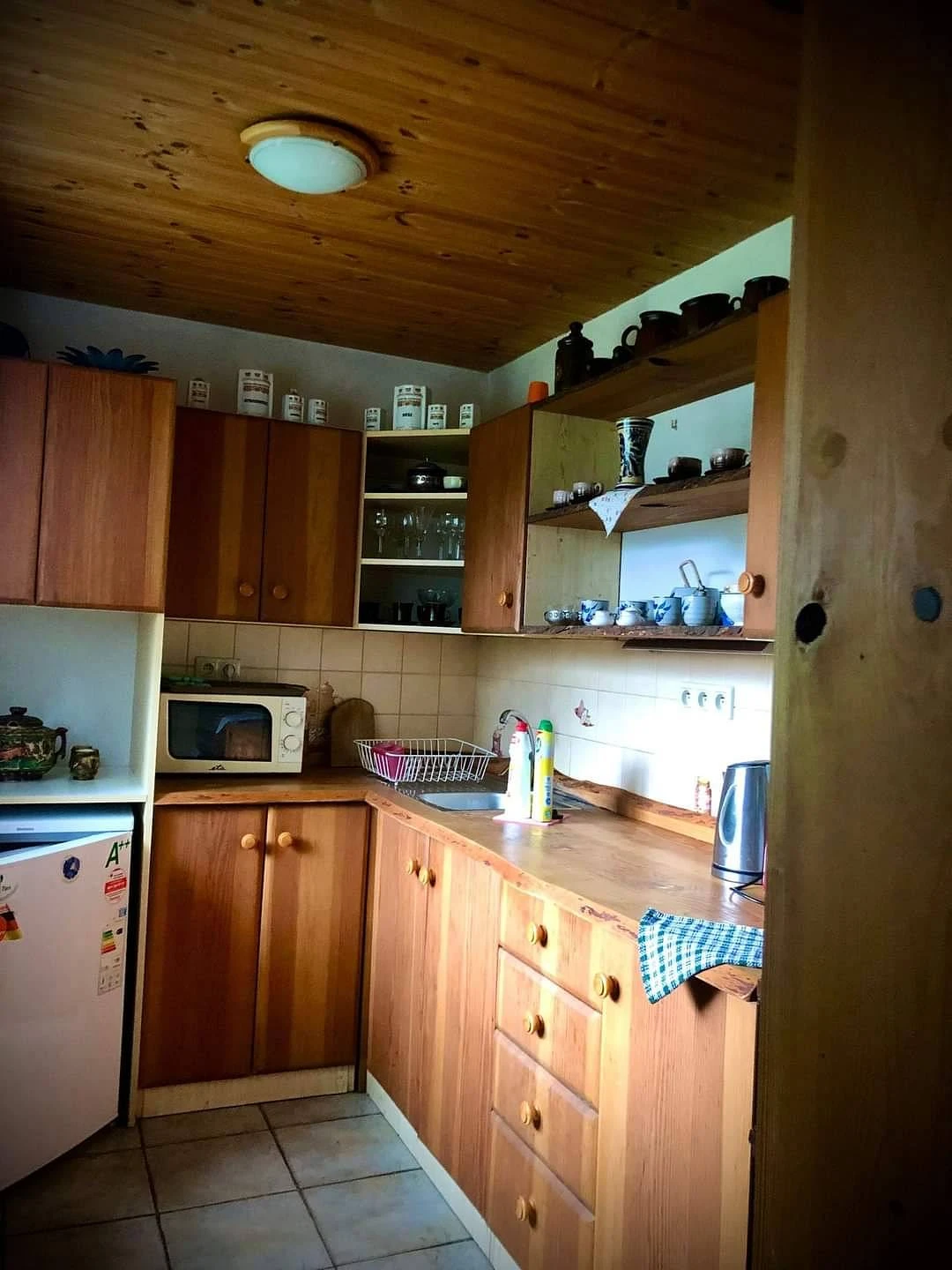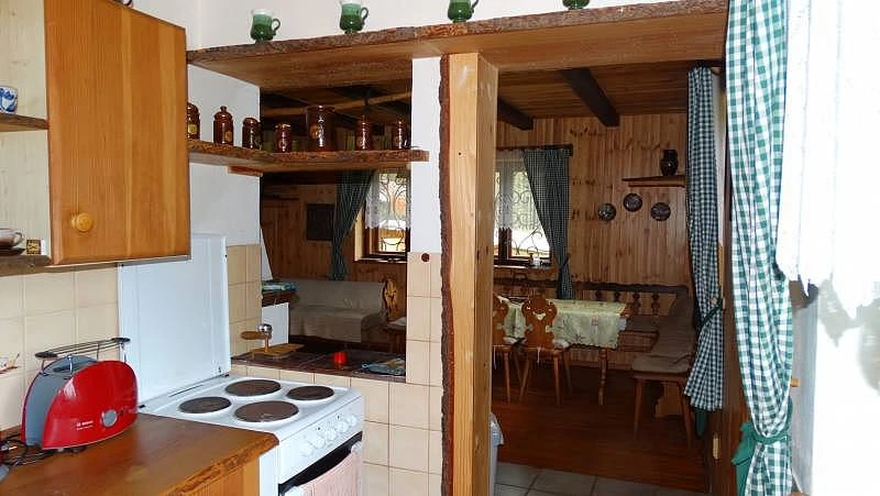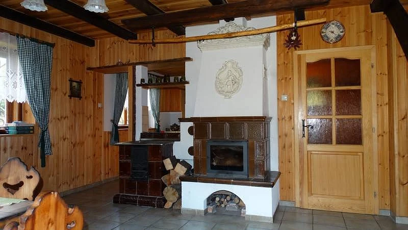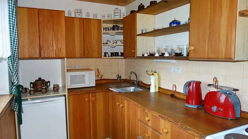 - Přízemí: Plně vybavená kuchyň (sporák, mikrovlnná trouba, lednice s mrazákem, rychlovarná konvice, toastovač, nádobí) a společenská místnost s jídelním stolem, krbem, pecí, televizí se satelitem a DVD přehrávačem.