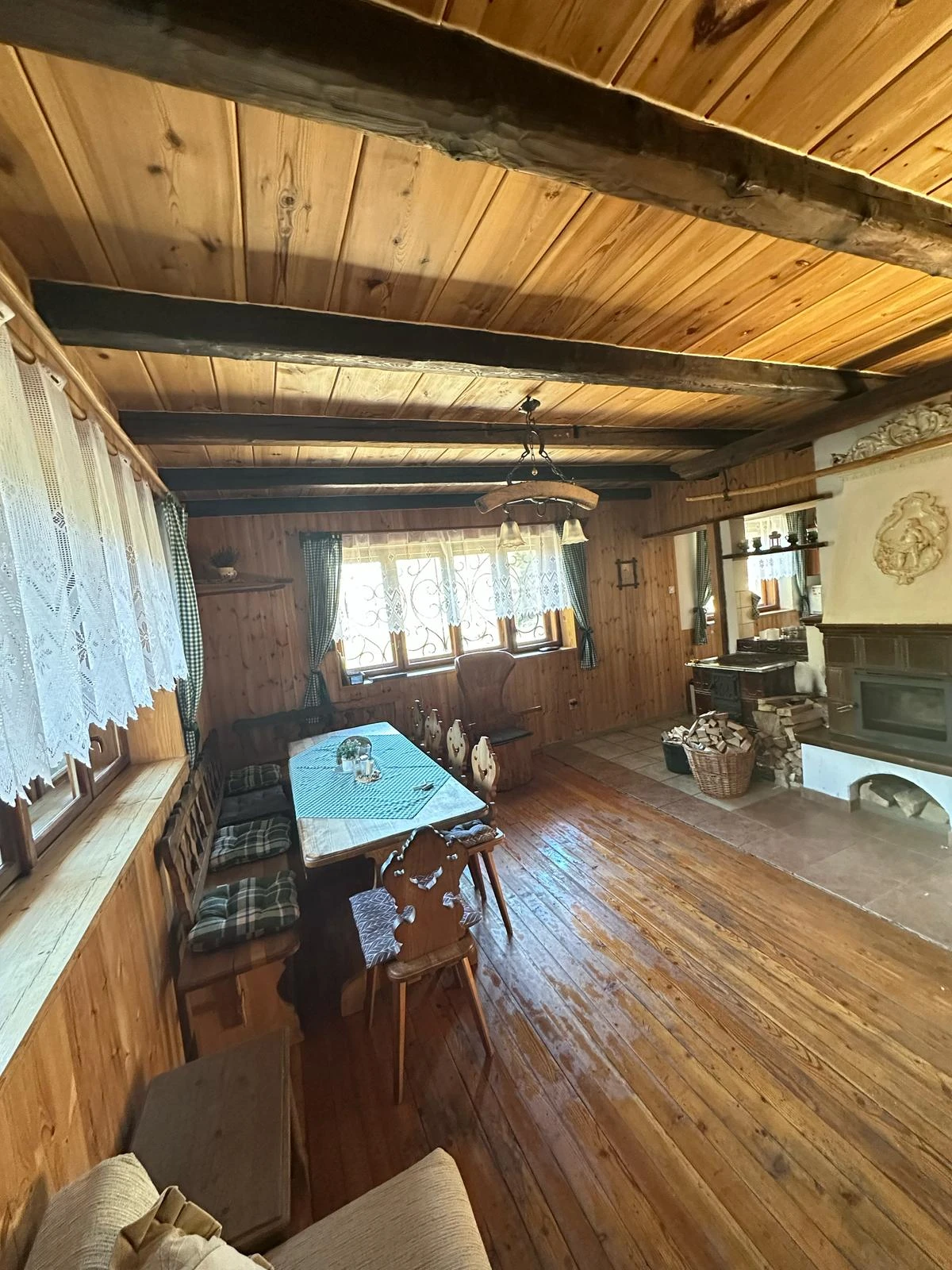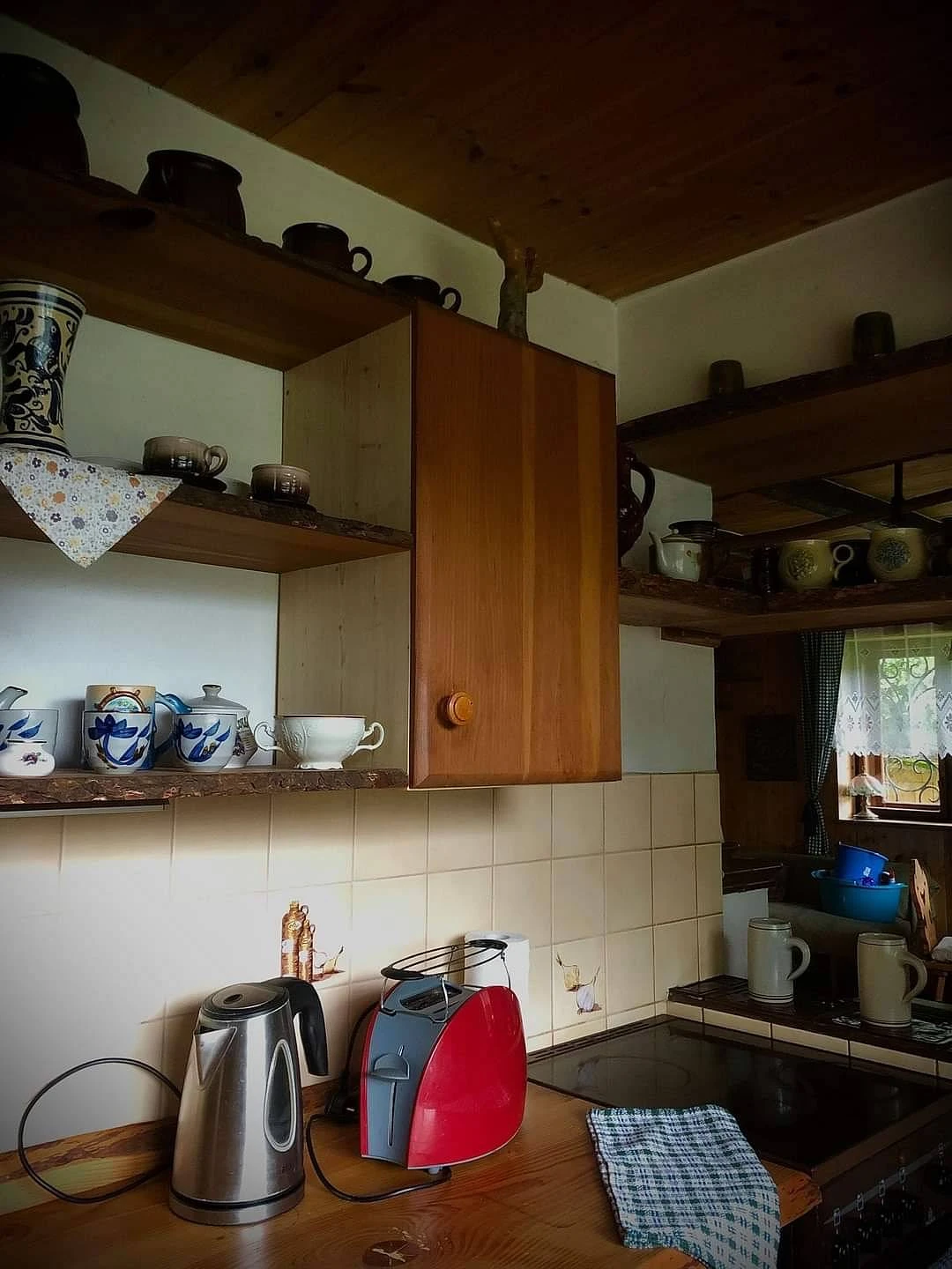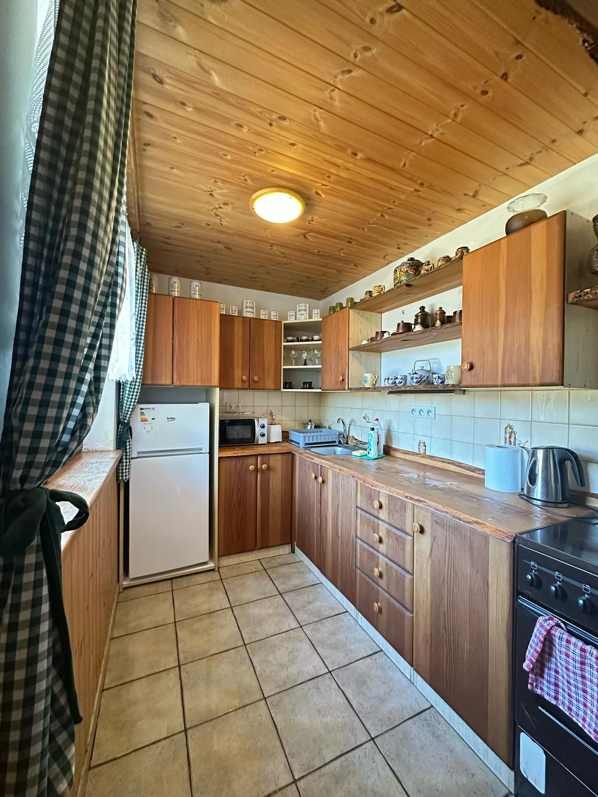 - Přízemí: Plně vybavená kuchyň (sporák, mikrovlnná trouba, lednice s mrazákem, rychlovarná konvice, toastovač, nádobí) a společenská místnost s jídelním stolem, krbem, pecí, televizí se satelitem a DVD přehrávačem.