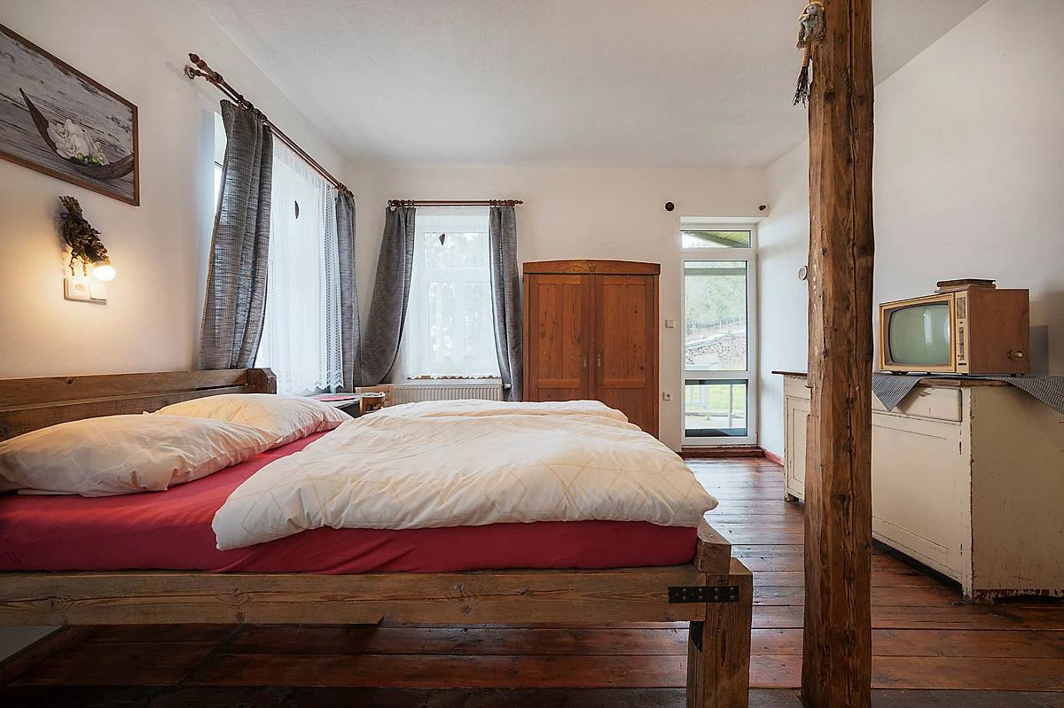 Pokoj, U mě (4+0): Pokoj s jednou manželskou postelí a palandou. Koupelna se sprchou a WC.