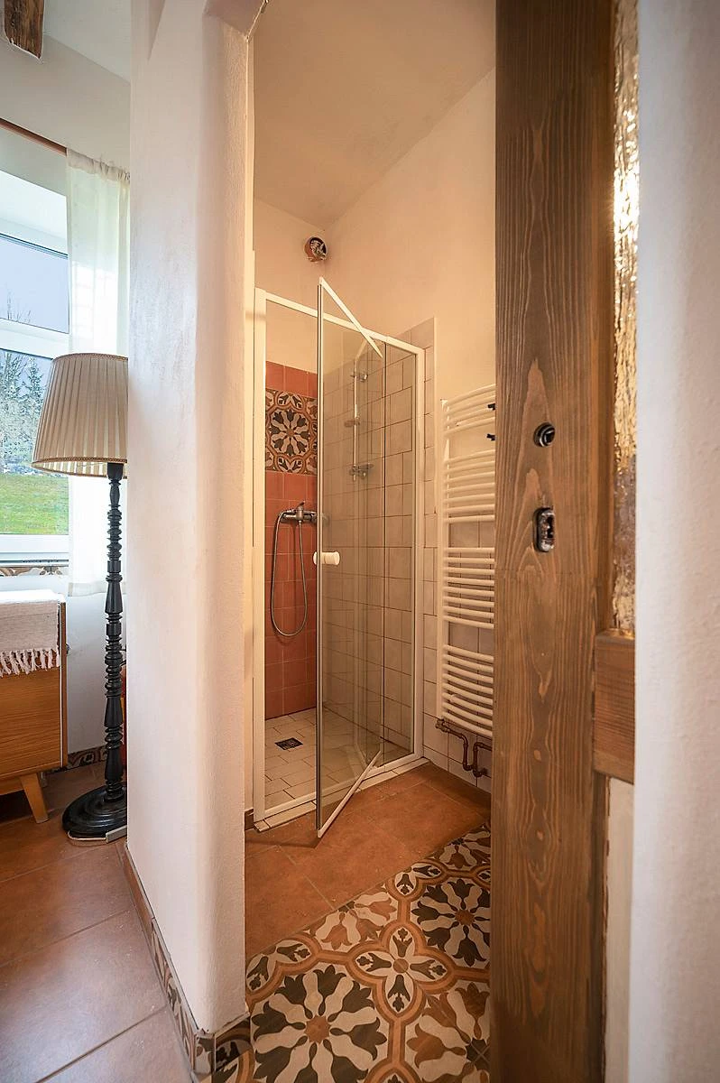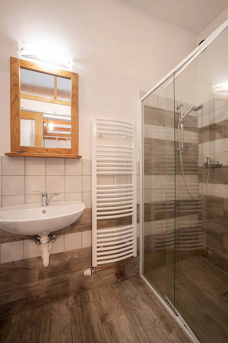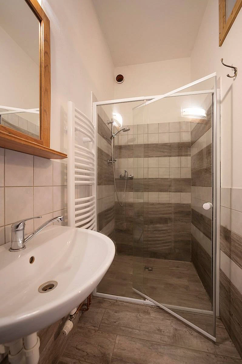 Pokoj s jednou manželskou postelí a palandou. Koupelna se sprchou a WC.
