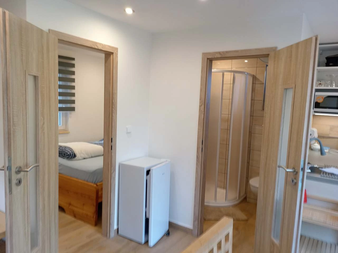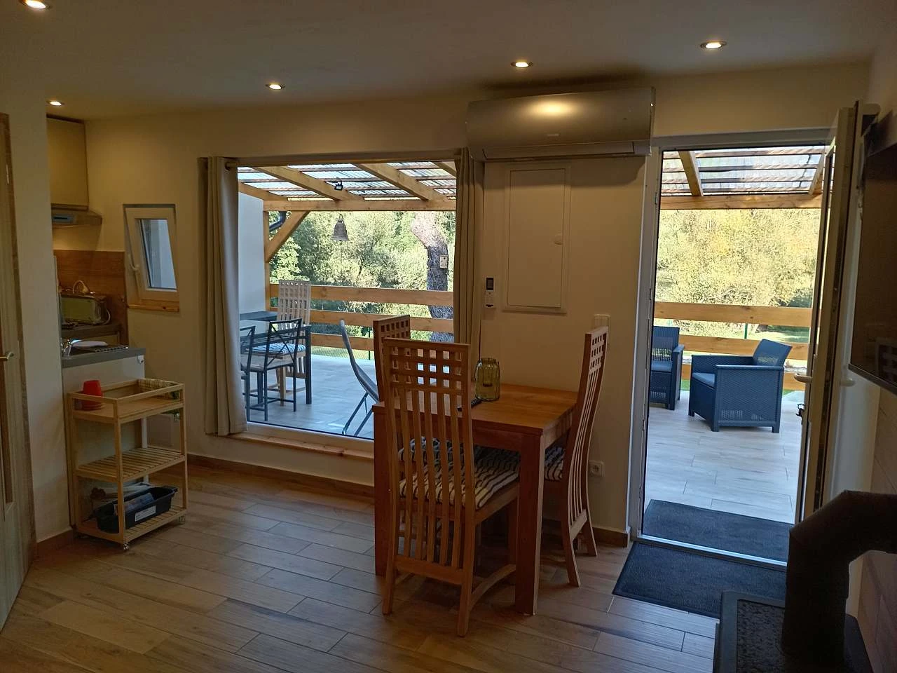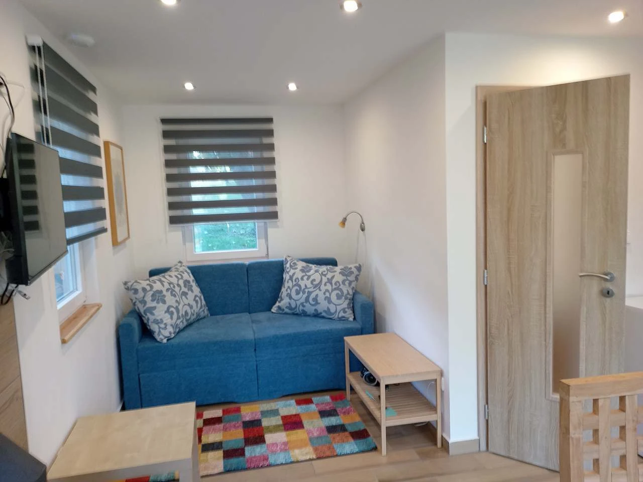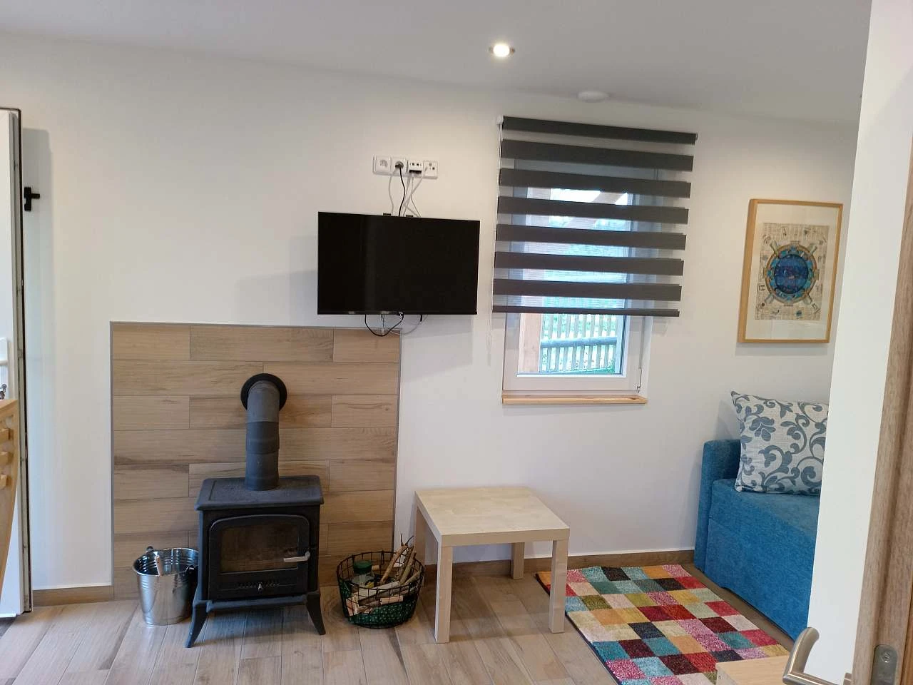 V obývací části je jídelní stůl, pohodlná sedačka, televize a WiFi připojení. Ložnice je vybavena manželskou postelí. Koupelna obsahuje sprchový kout a toaletu.