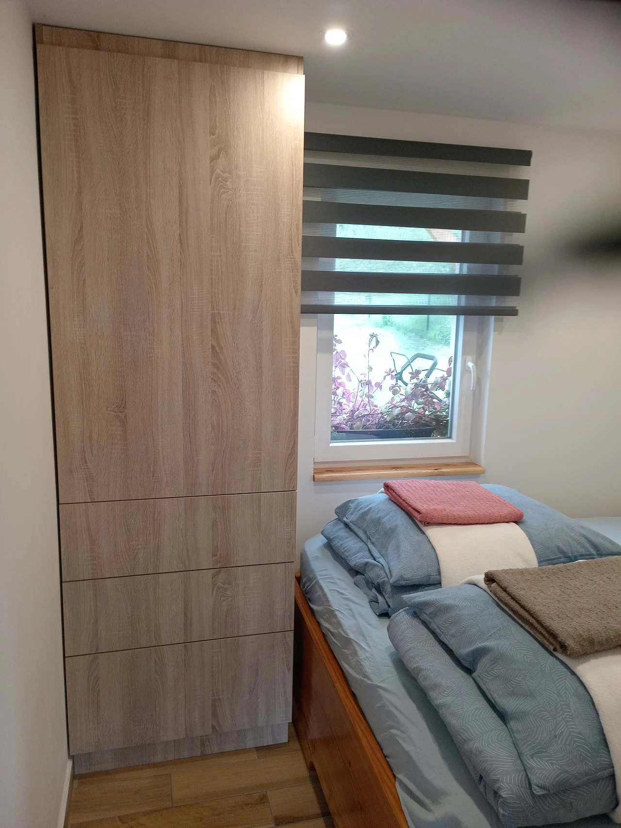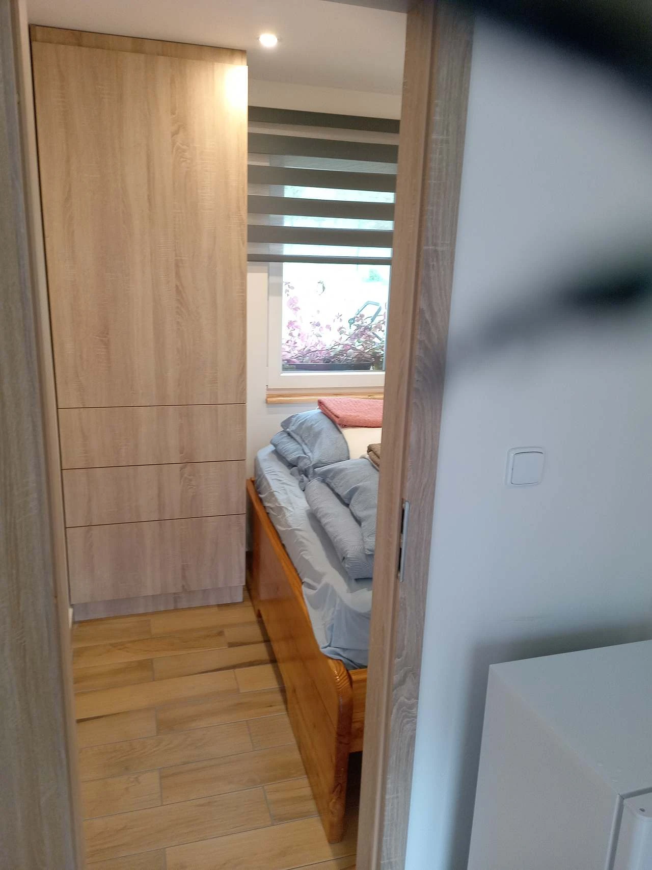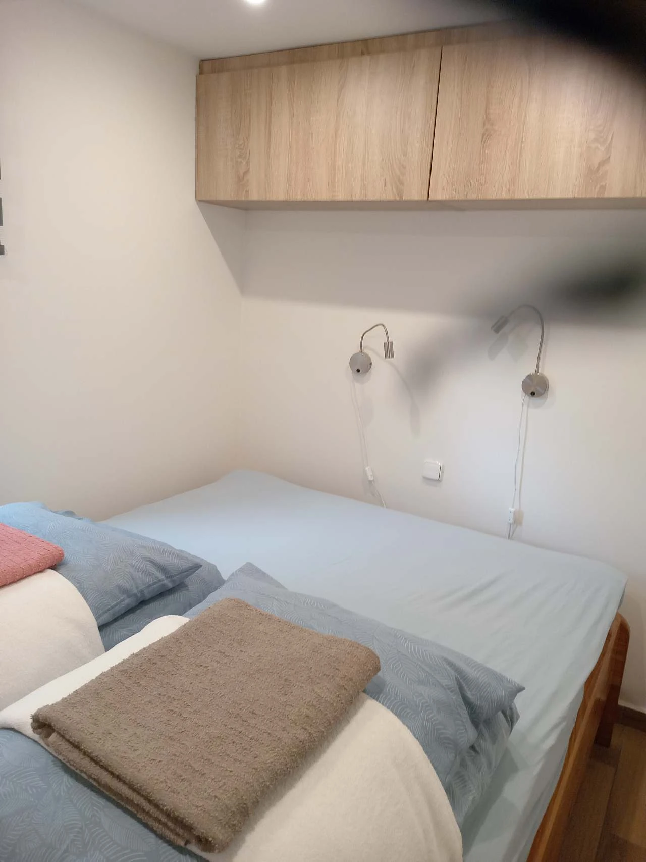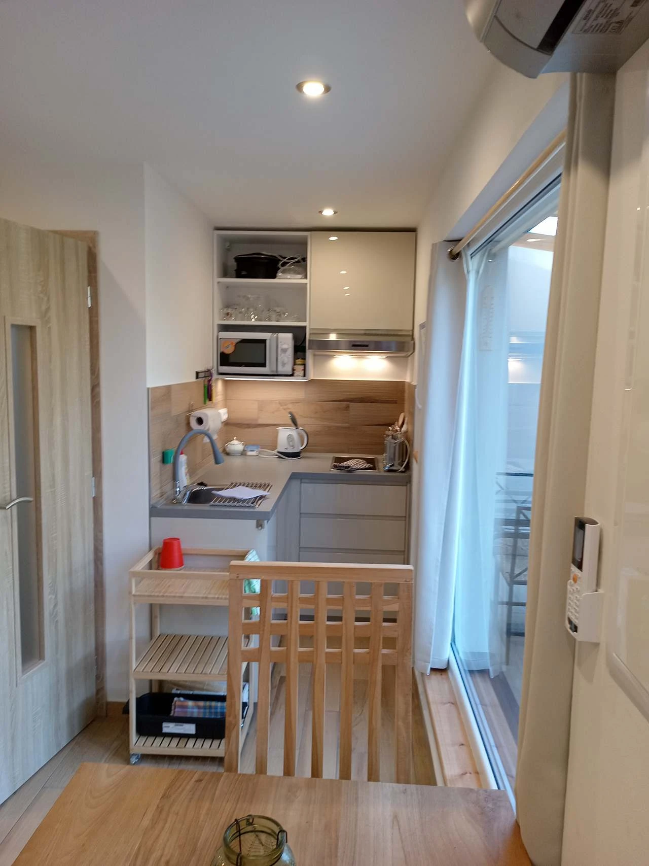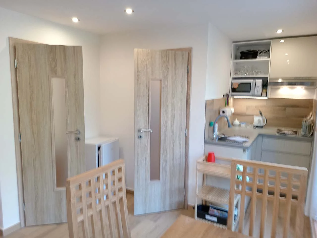 V obývací části je jídelní stůl, pohodlná sedačka, televize a WiFi připojení. Ložnice je vybavena manželskou postelí. Koupelna obsahuje sprchový kout a toaletu.