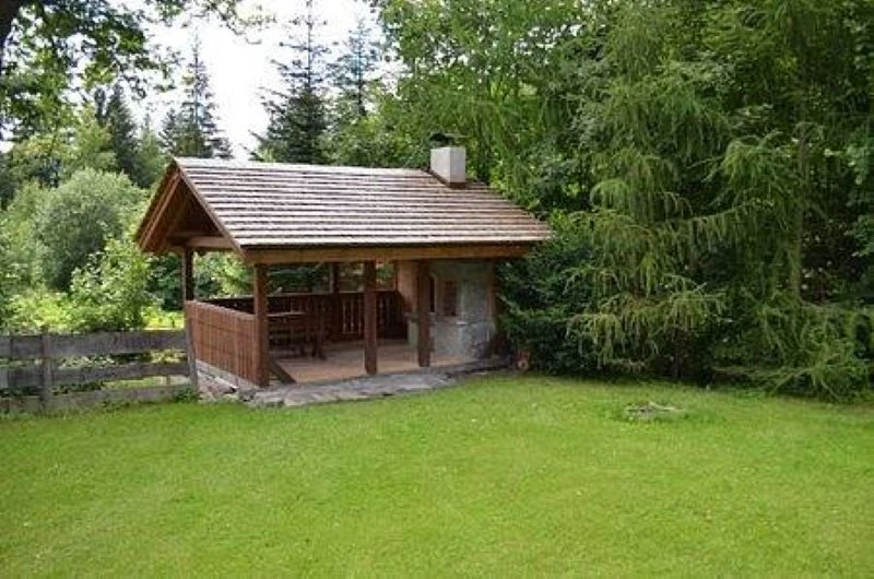 Oplocený pozemek se zahradou, pergolou a venkovním krbem.