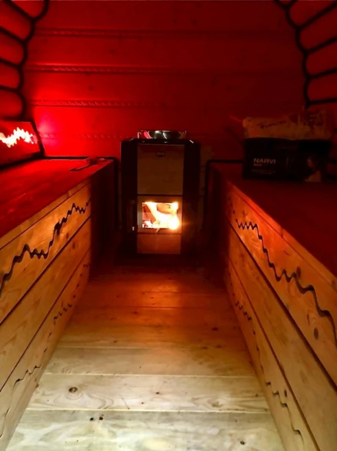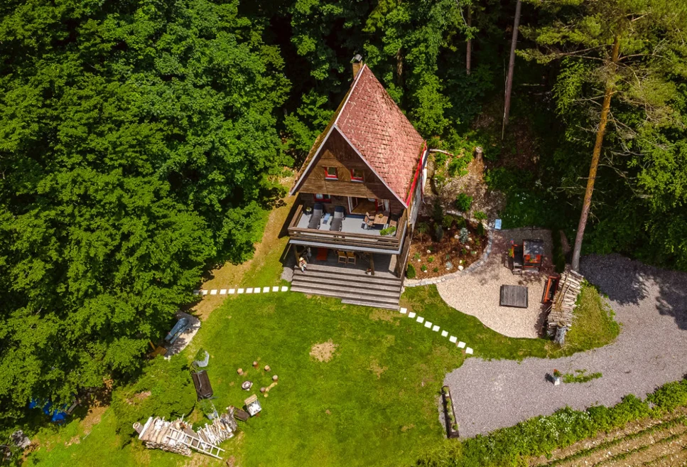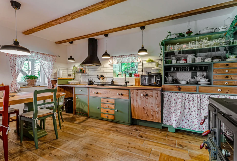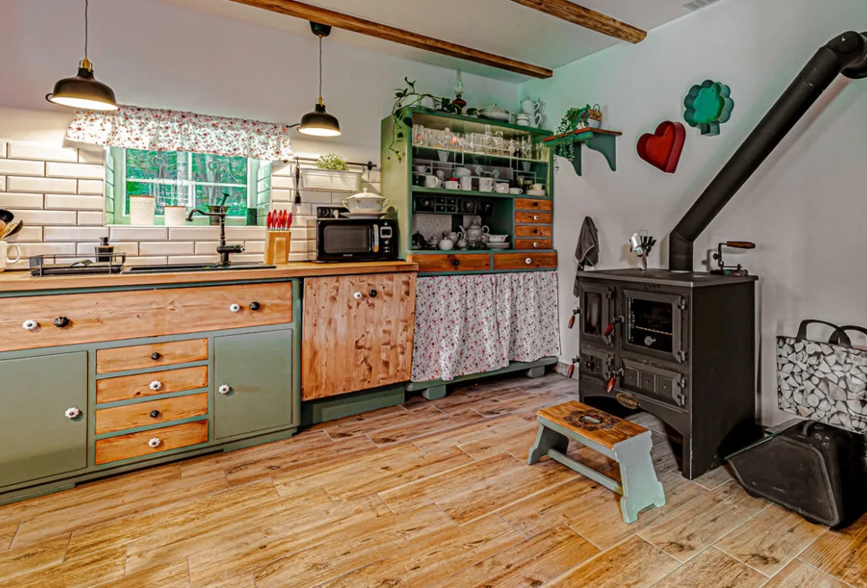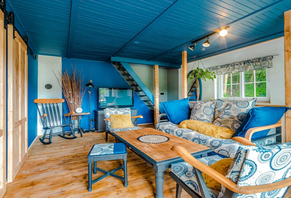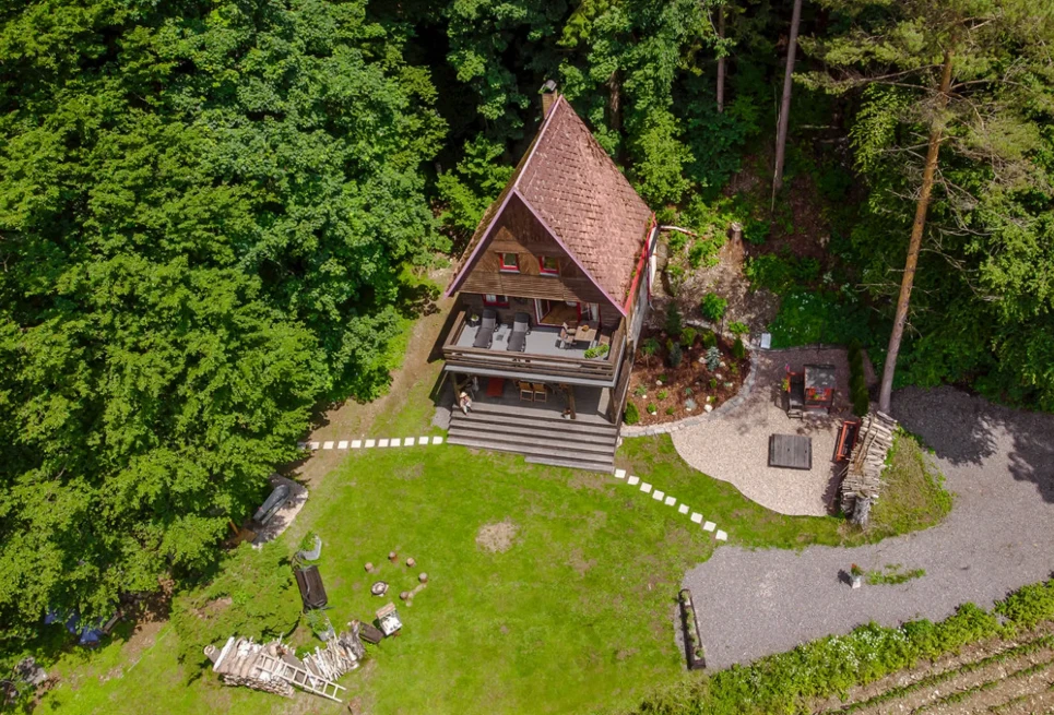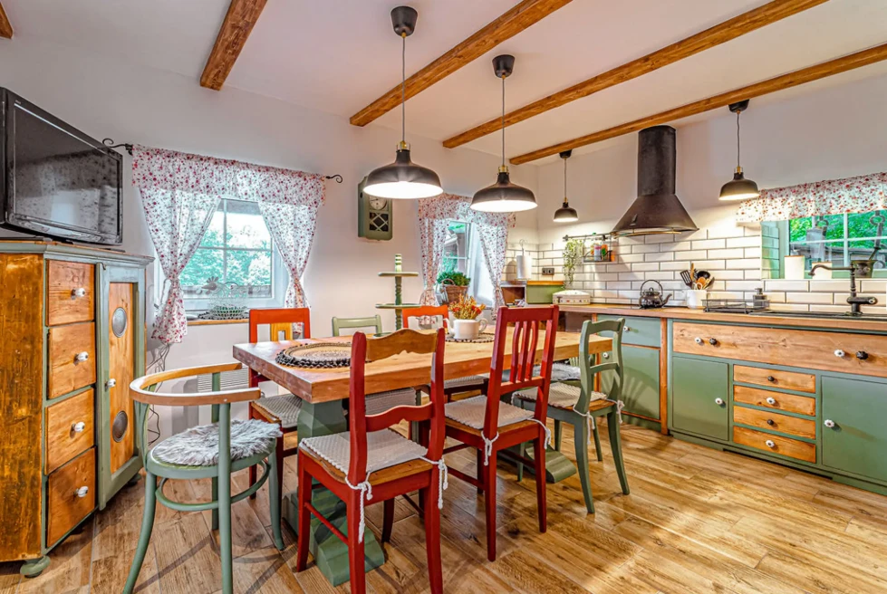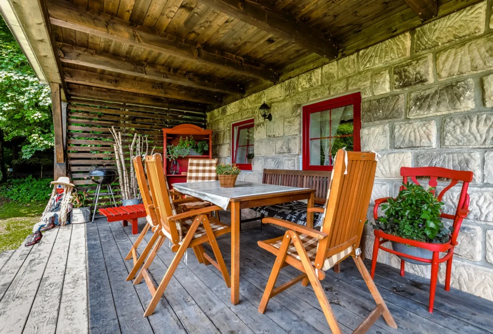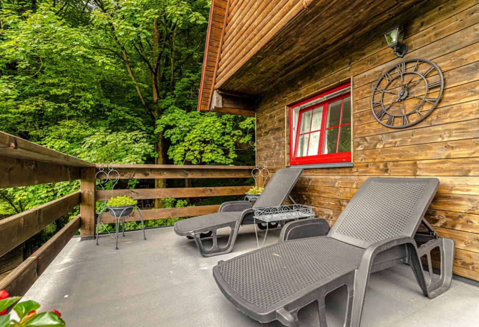 V chatě se nachází útulný obývací prostor s pohodlným sezením, krbem, televizí a ozvučením. Plně vybavená kuchyně zahrnuje moderní spotřebiče, jako je indukční sporák, lednice, myčka, mikrovlnná trouba, kávovar, toustovač a jídelní kout.