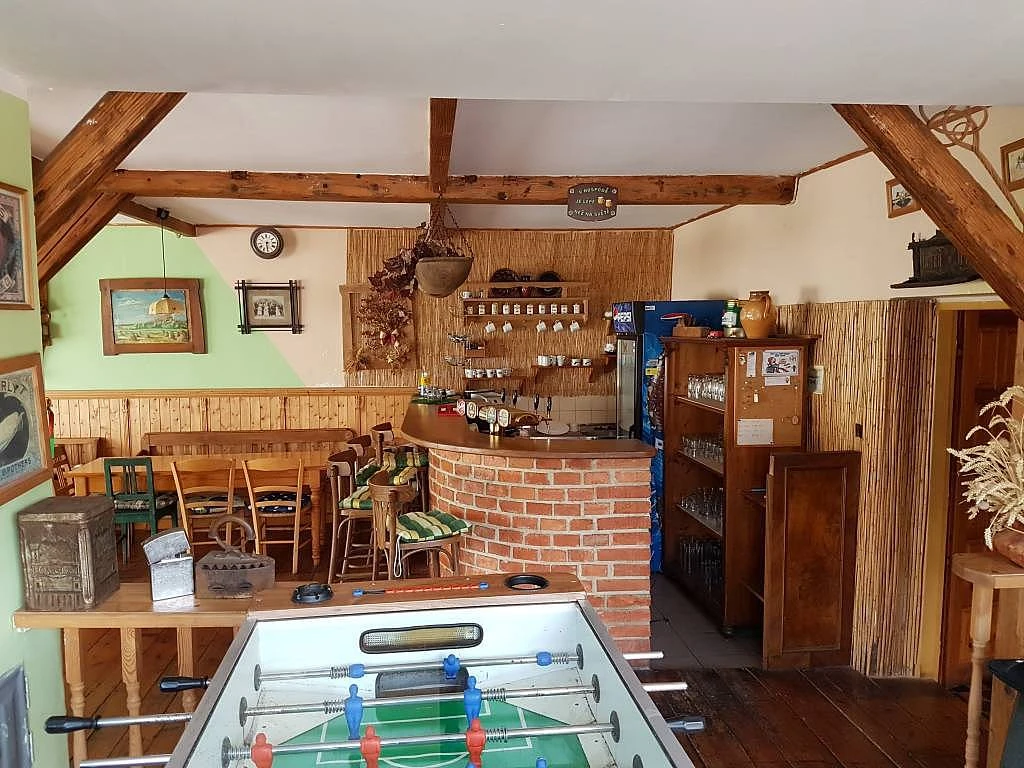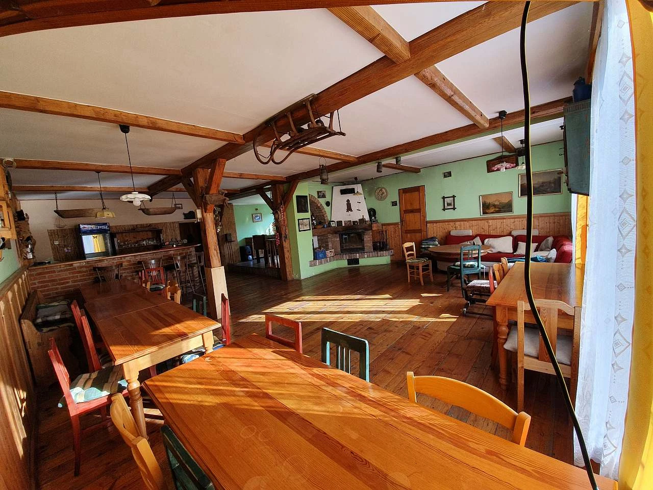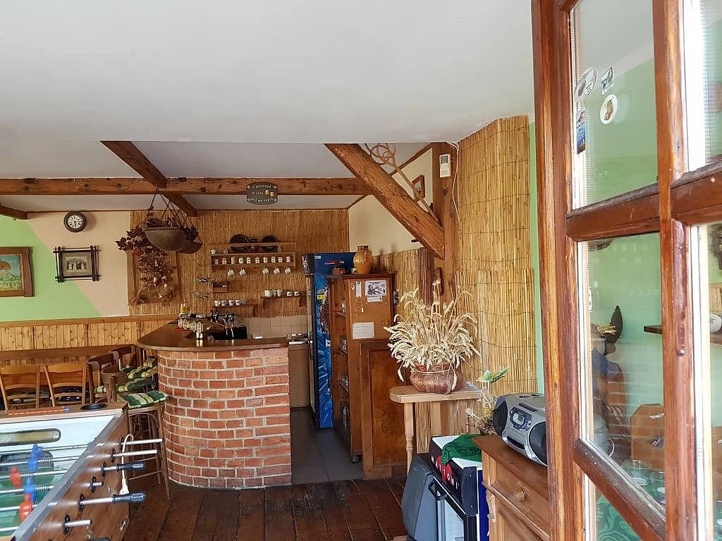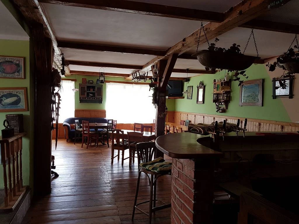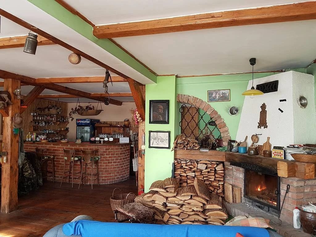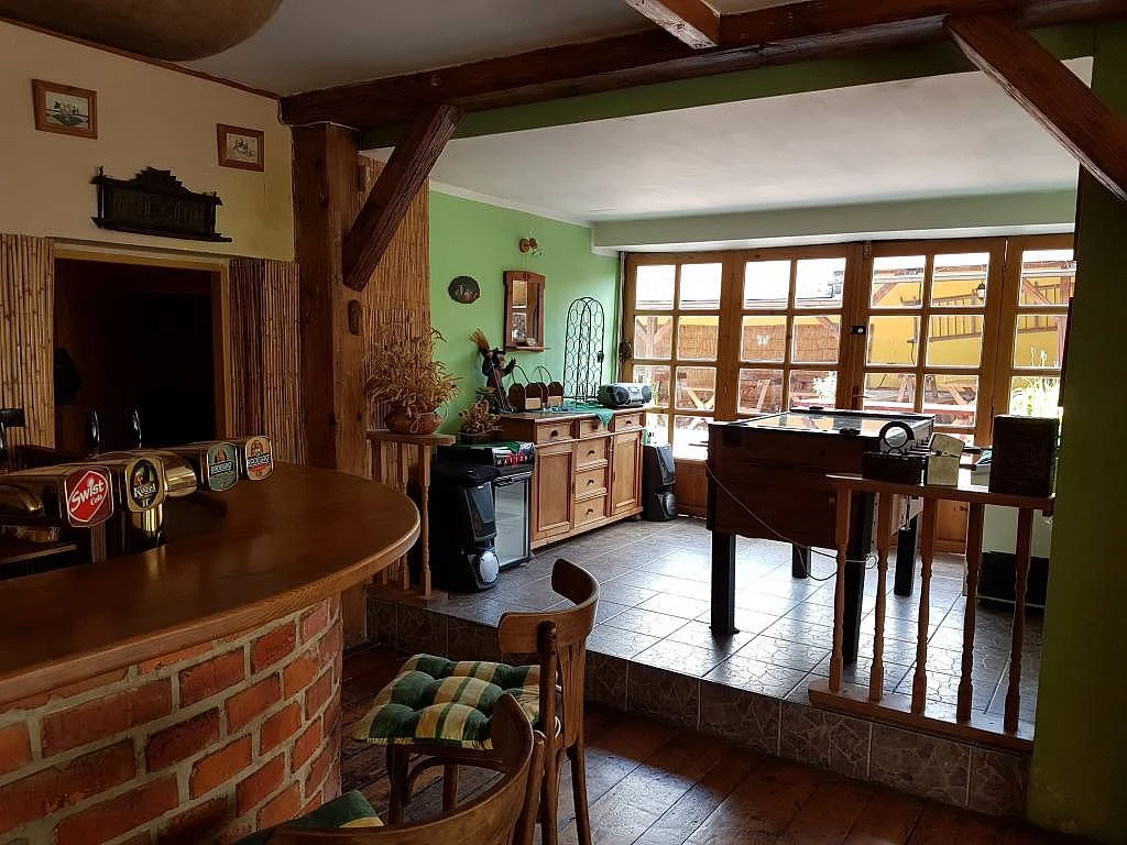 Velká společenská místnost s krbem, TV, se zařízeným barem, výčepem a pivním chlazením (na kegy).