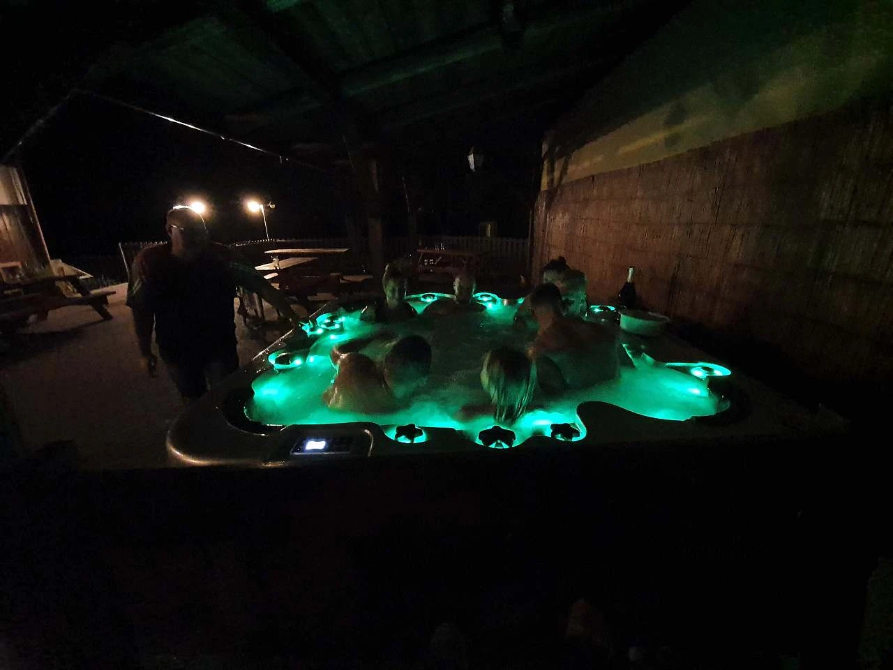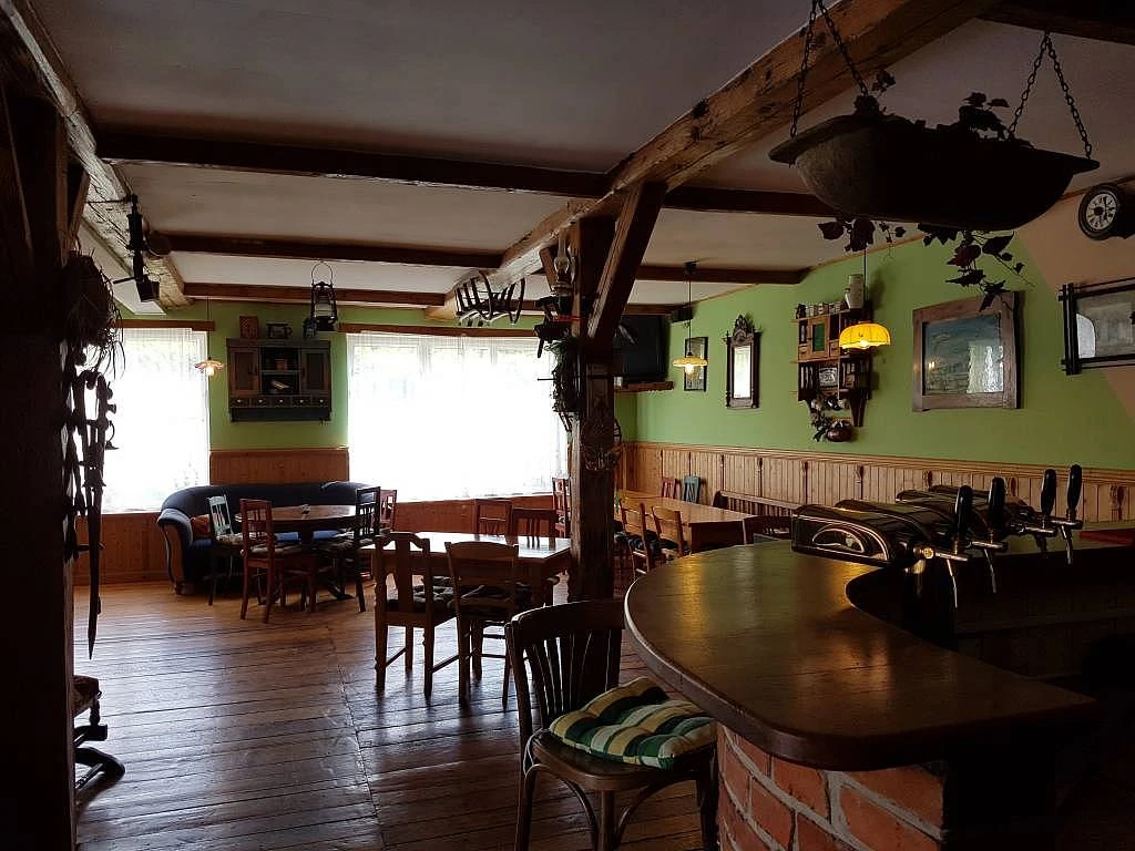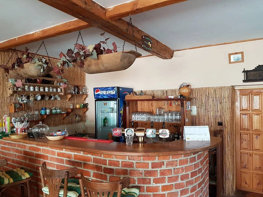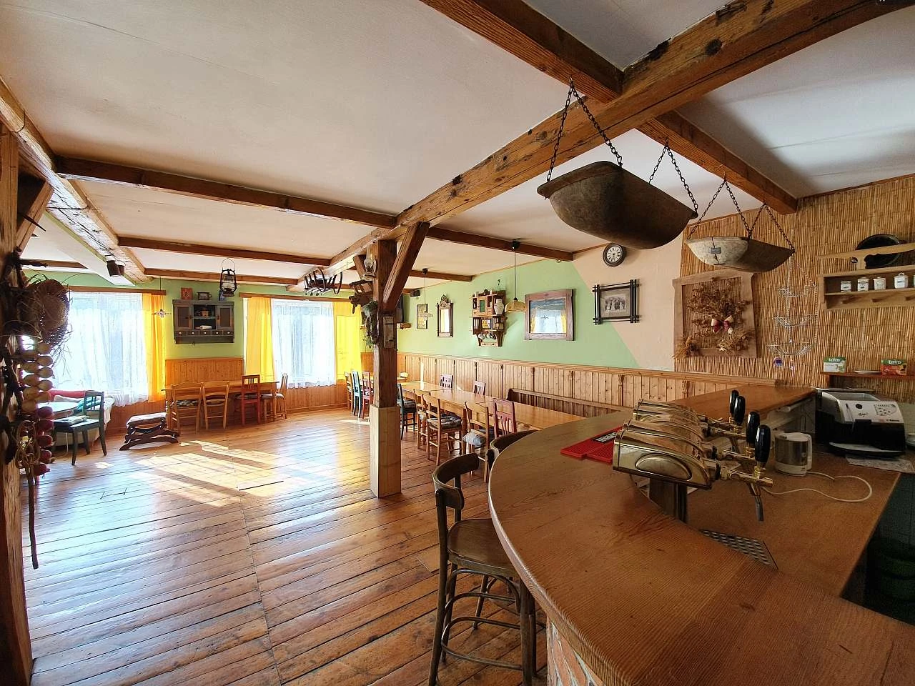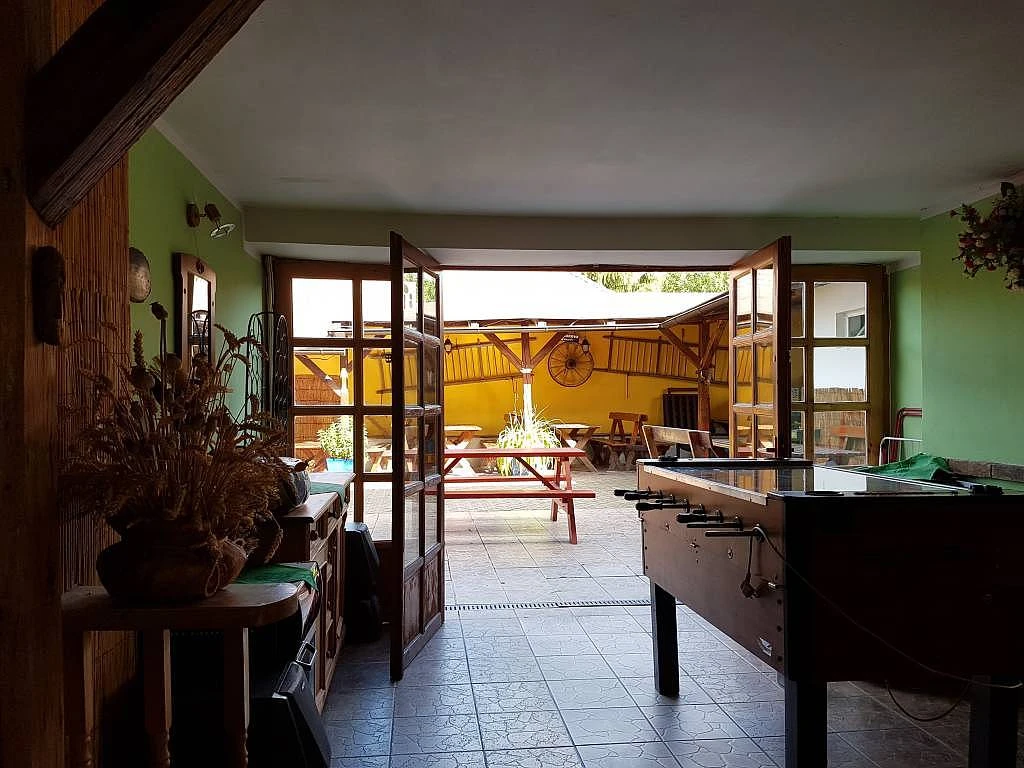 Velká společenská místnost s krbem, TV, se zařízeným barem, výčepem a pivním chlazením (na kegy).