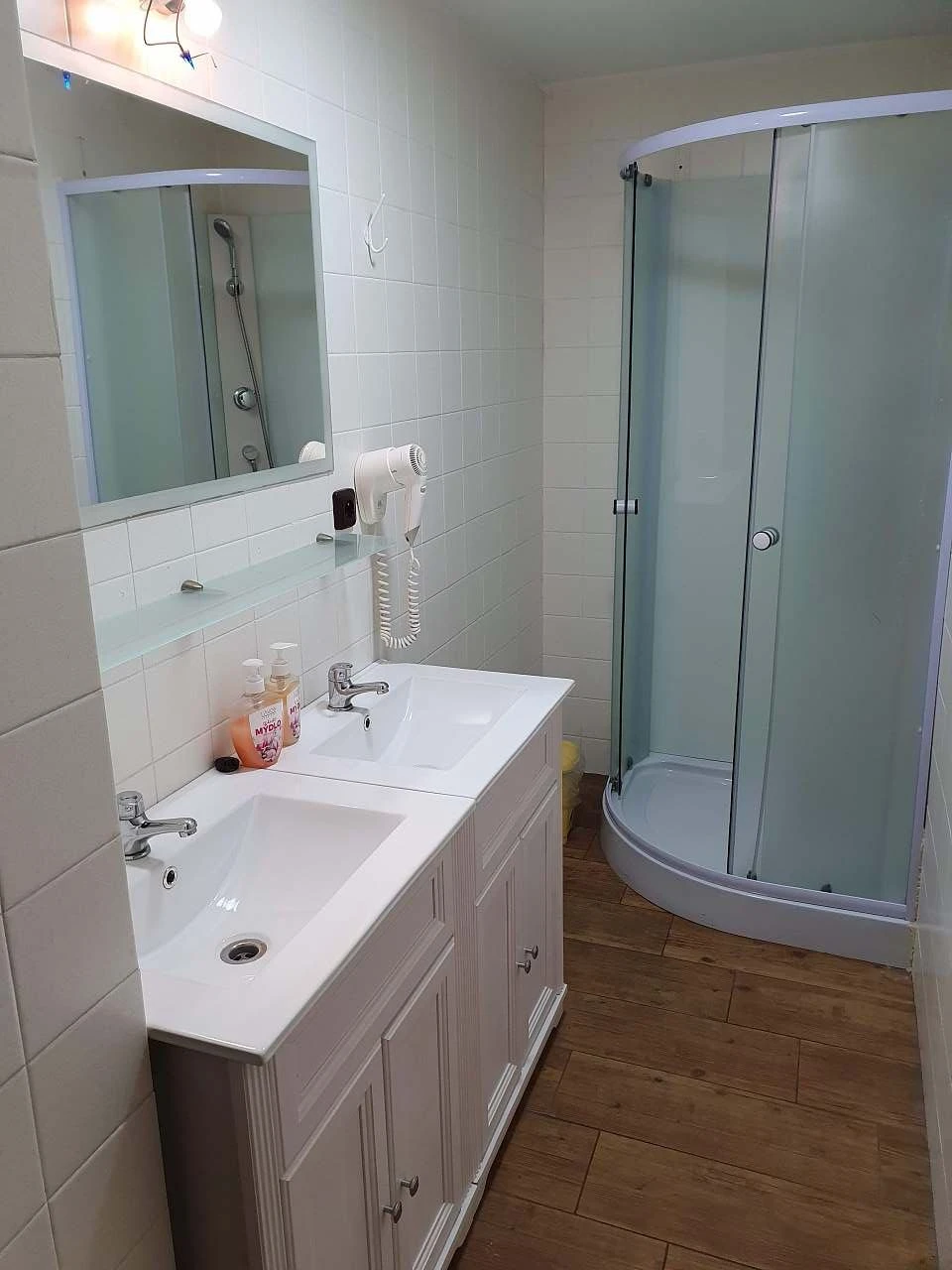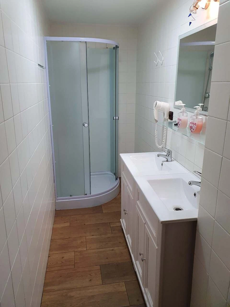 Sociální zařízení společné v prvním patře 2x WC, 2x koupelna s dvěma umyvadly a sprchovým koutem, v přízemí 3x WC u společenské místnosti + 2X pisoár.