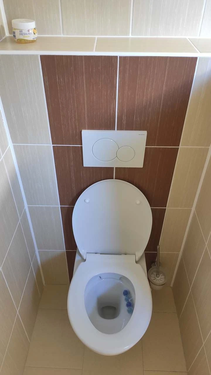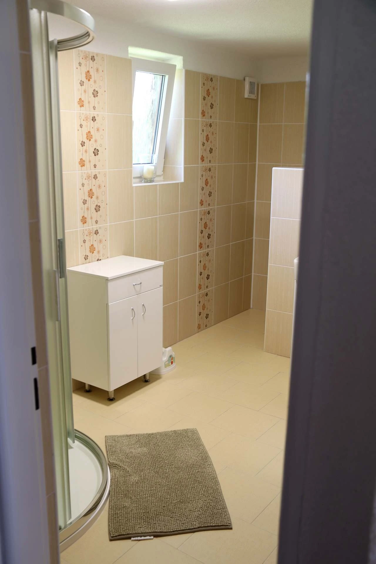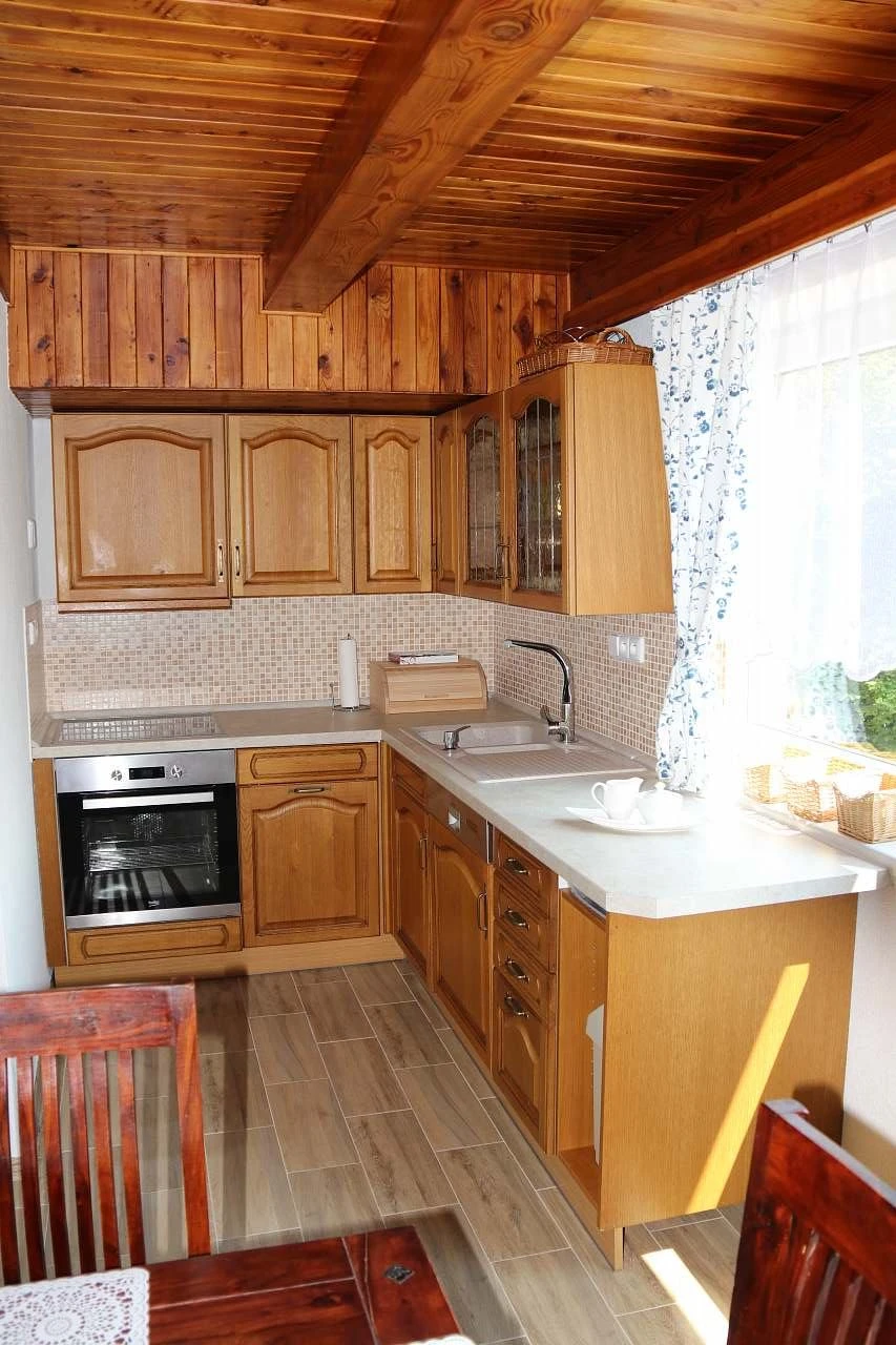 V přízemí se nachází plně vybavená kuchyň, společenská místnost s krbem, koupelna se sprchovým koutem a WC. Další WC s umyvadlem a pračkou je k dispozici v suterénu.