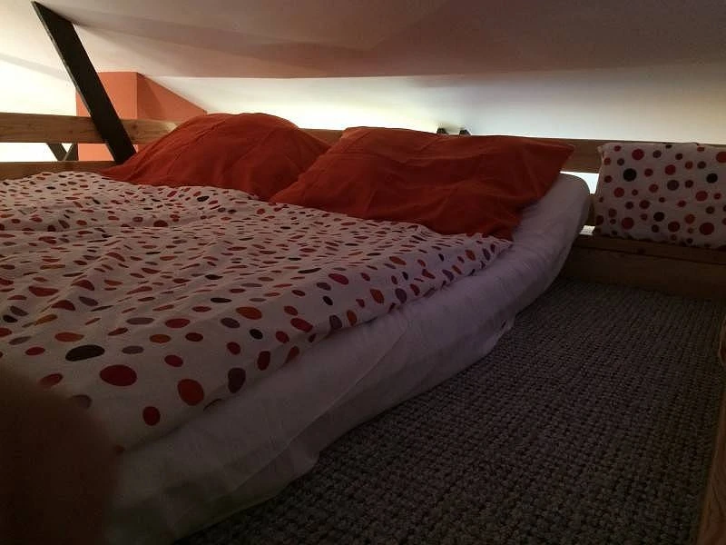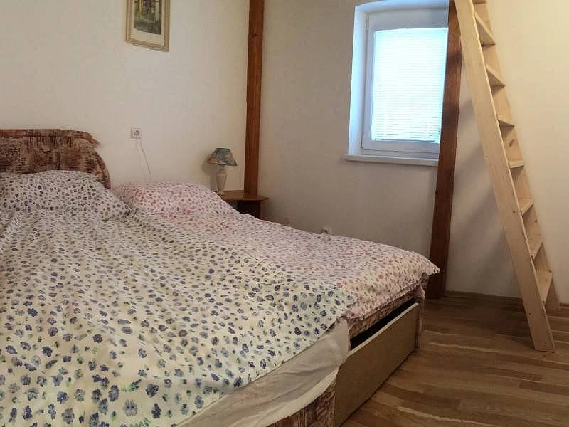 Odděleně od obývacího pokoje je ložnice s mezonetovým dvojlůžkem. To znamená, že postel je umístěna na vyvýšené úrovni. Tato uspořádání poskytuje prostorovou oddělenost a soukromí.