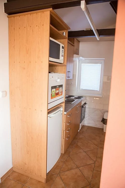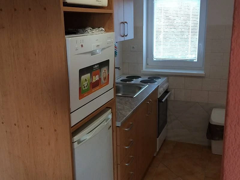 Kuchyňský kout je plně vybavený veškerými potřebnými spotřebiči. Najdete zde elektrický sporák s troubou, mikrovlnnou troubu, myčku na nádobí, ledničku, rychlovarnou konvici a dostatek nádobí pro přípravu jídel.