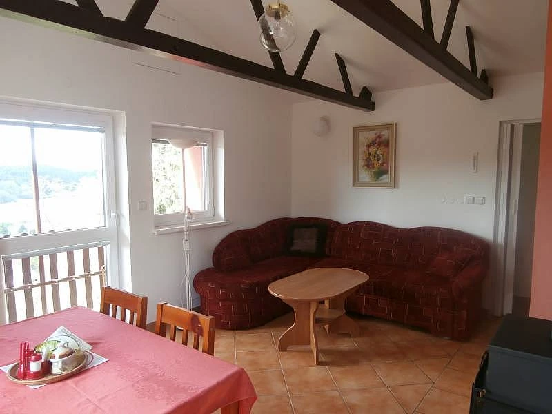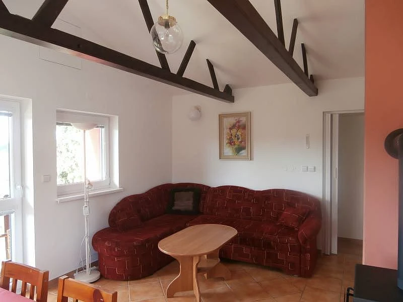 Přes chodbu se přechází do velké místnosti, která slouží jako obývací pokoj. Tato místnost je vybavena útulnými krbovými kamny, která přidávají atmosféru a teplo. V obývacím pokoji se také nachází televize s DVB-T přijímačem, abyste si mohli vychutnat své oblíbené pořady.