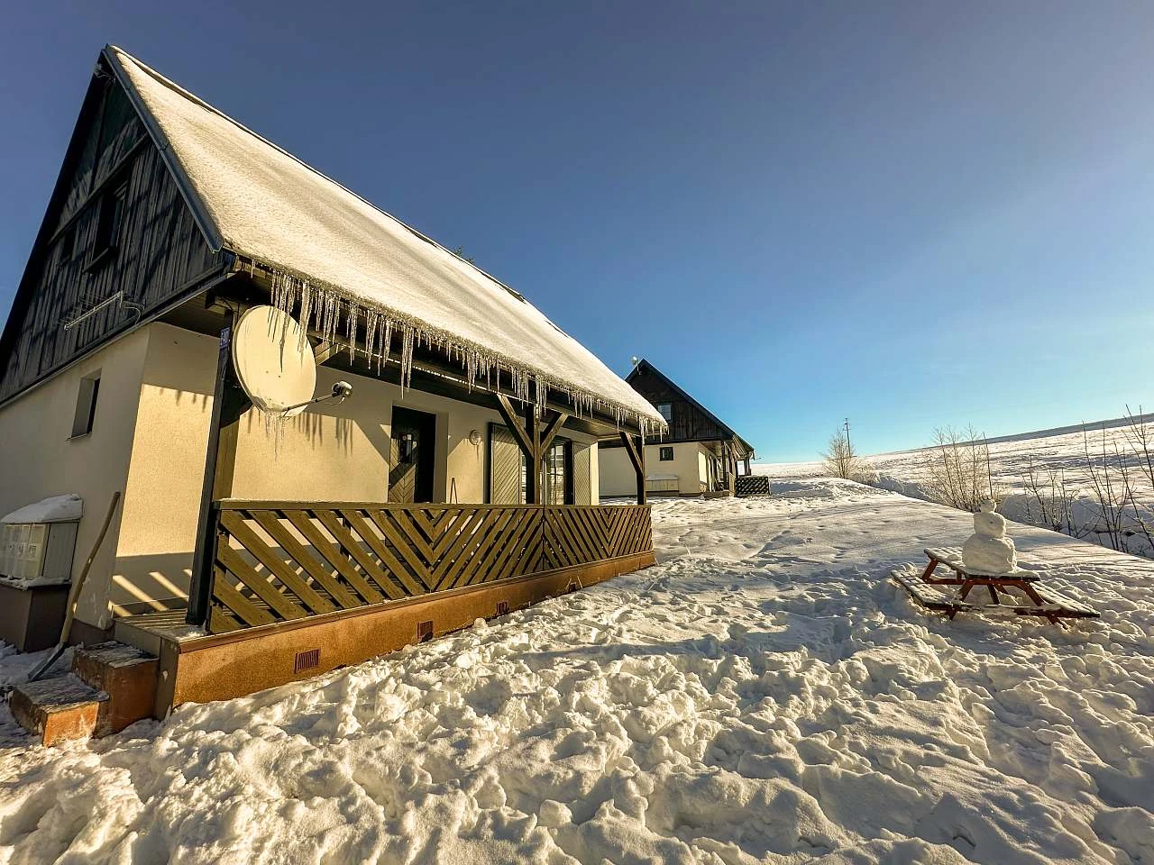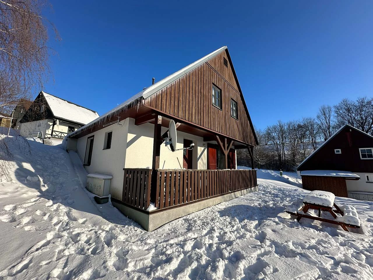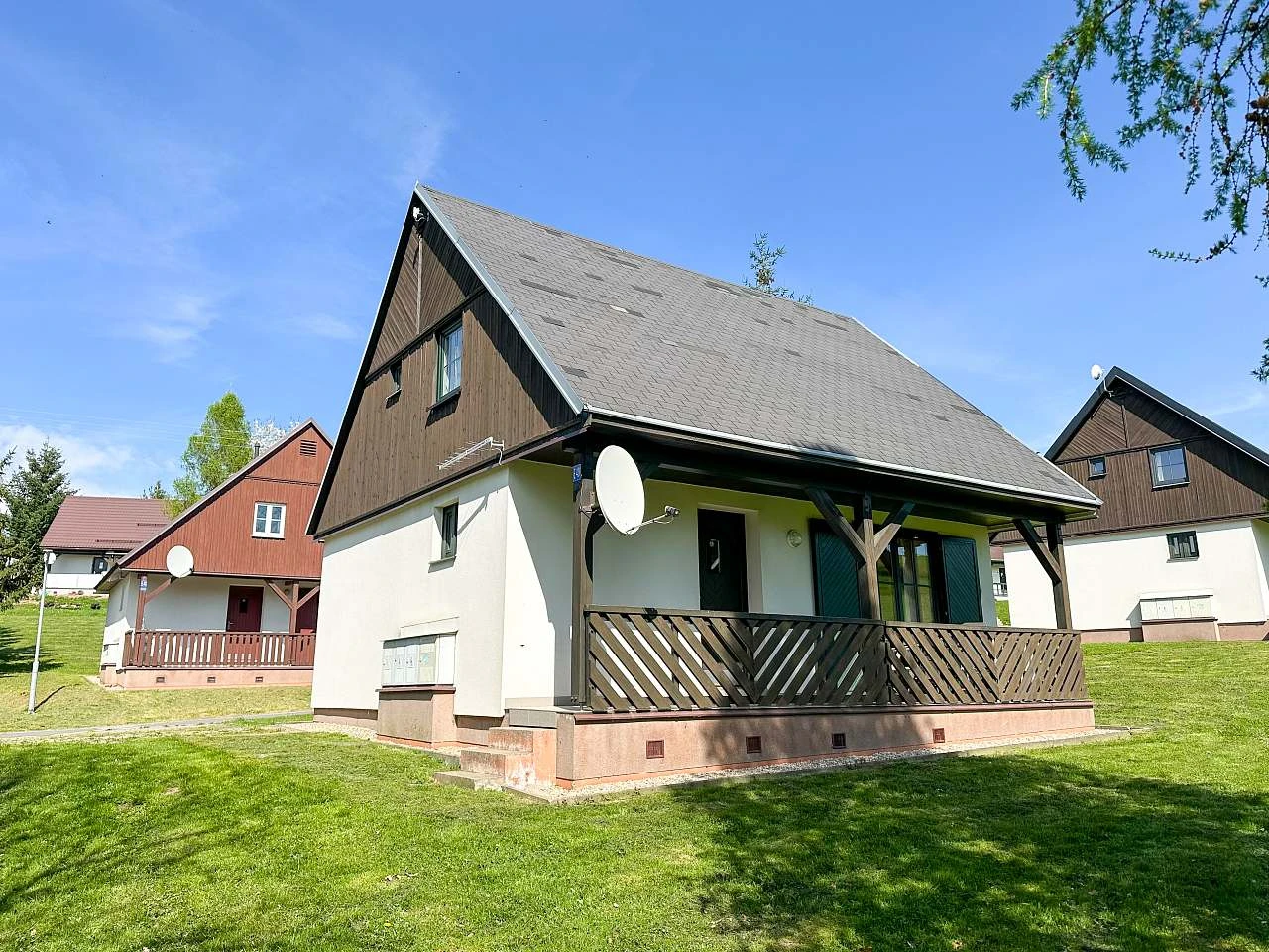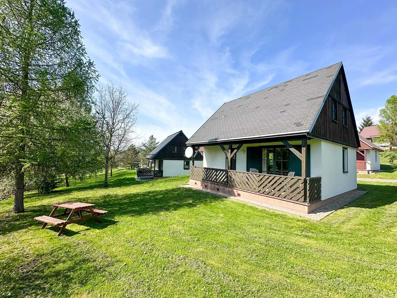 Obě chaty mají terasu přístupnou z obývacího pokoje a hlavního vchodu, ideální pro relaxaci a vychutnání si venkovního prostředí. Pro parkování je k dispozici zdarma parkování pro 2 automobily a obě chaty jsou dostupné autem přímo k objektu.