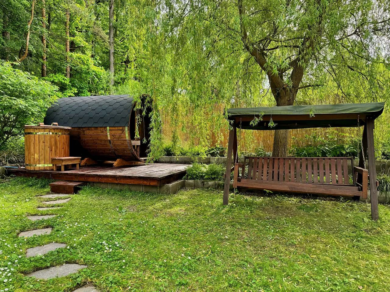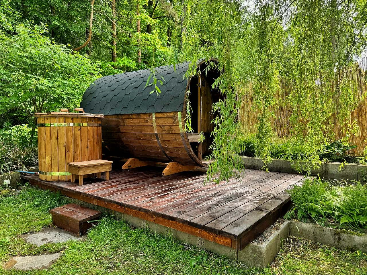 Součástí ubytování je sudová sauna a venkovní koupací káď. Hosté mají k dispozici gril, ohniště, zahradní houpačku a terasu s posezením. Na pozemku je zahradní uzamykatelný domek s potřebným vybavením pro grilování a opékání. Ubytování funguje na principu samoobsluhy.