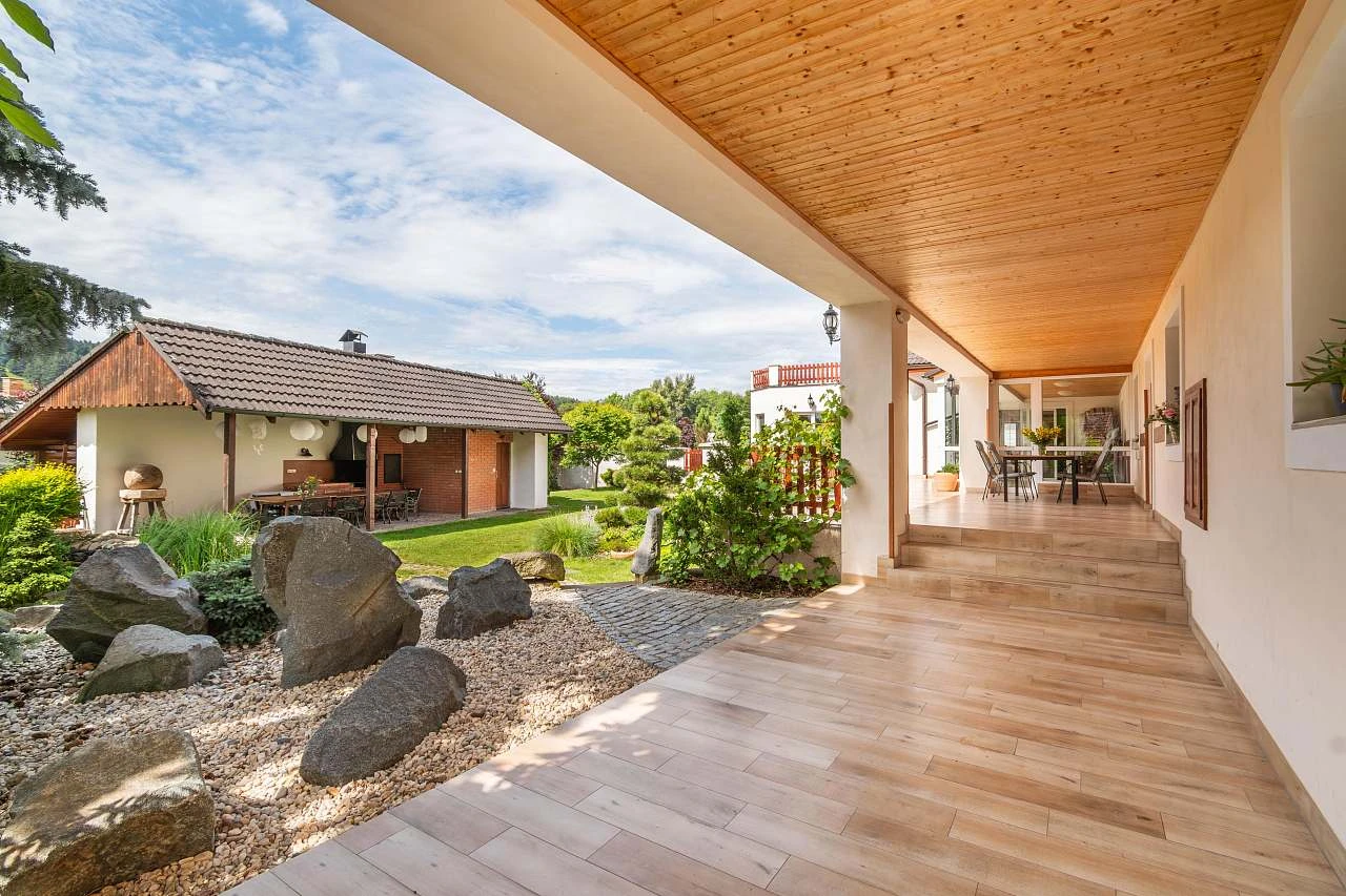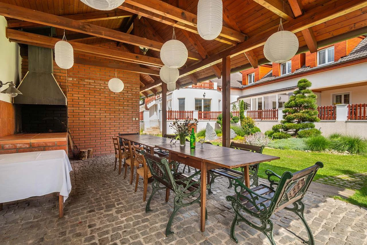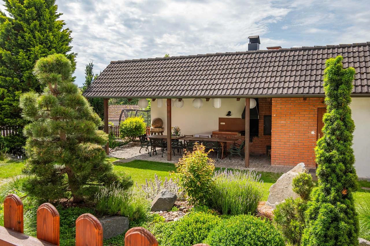 Venkovní prostory zahrnují několik zastřešených teras, gril s udírnou, japonsky laděnou zahradu s jezírkem plným ryb, hřiště a ohniště s možností vaření v kotlíku. V létě je k dispozici trampolína o průměru 4,5 metru a stolní tenis.