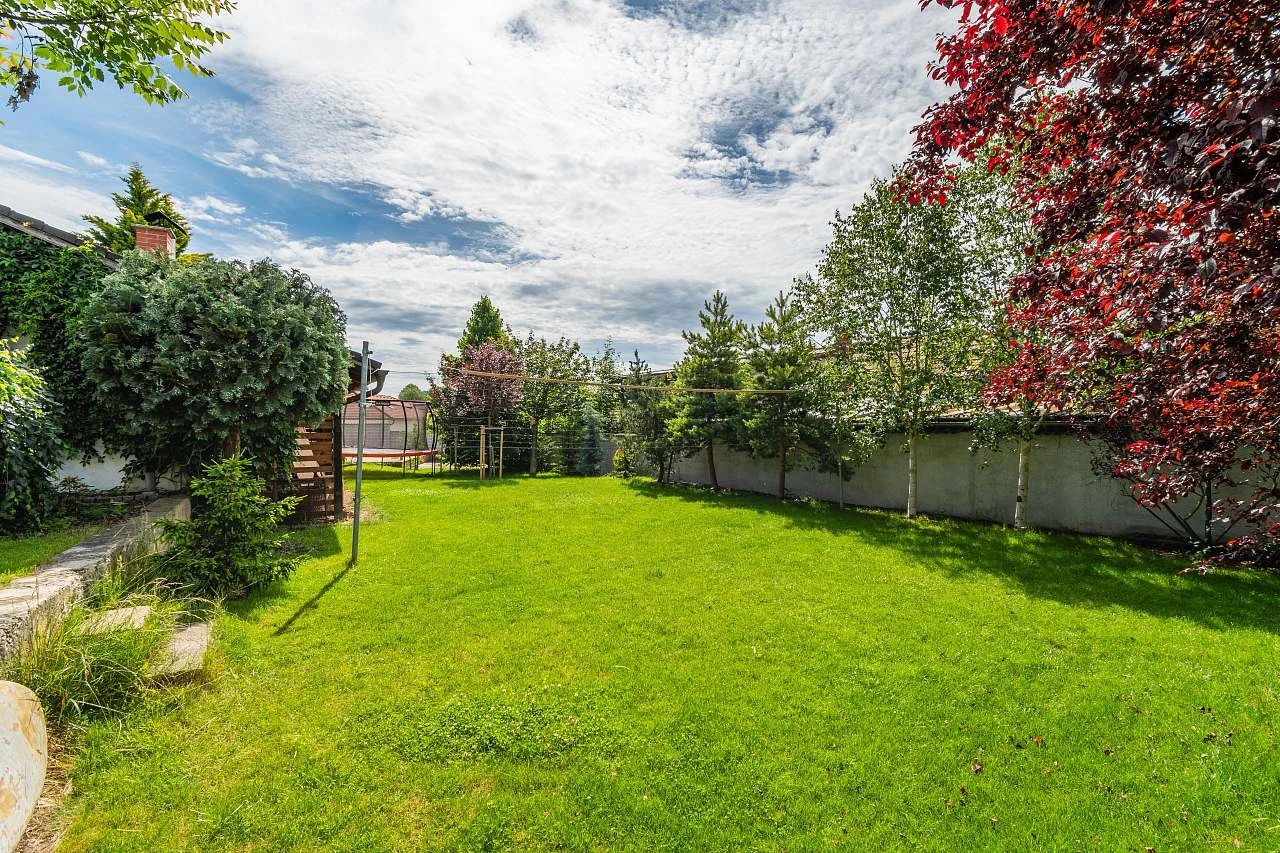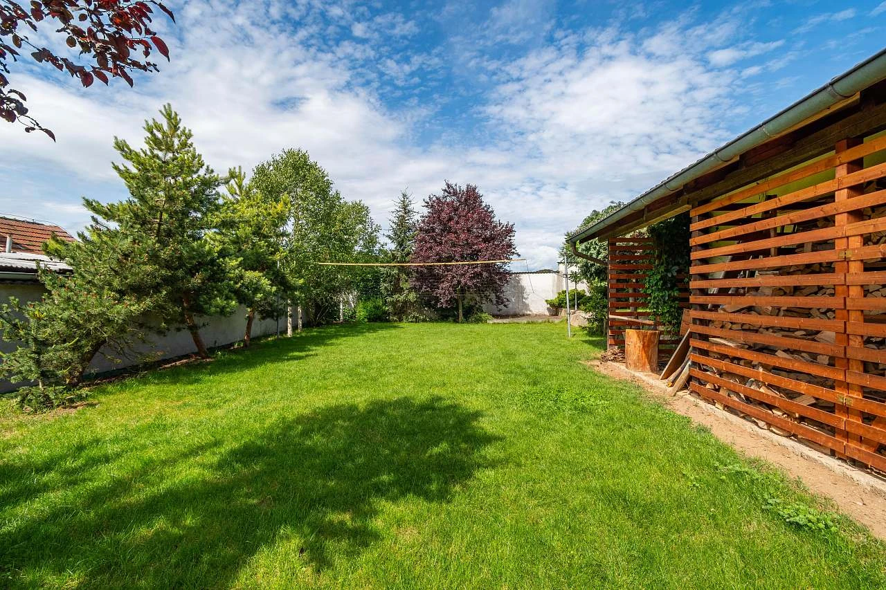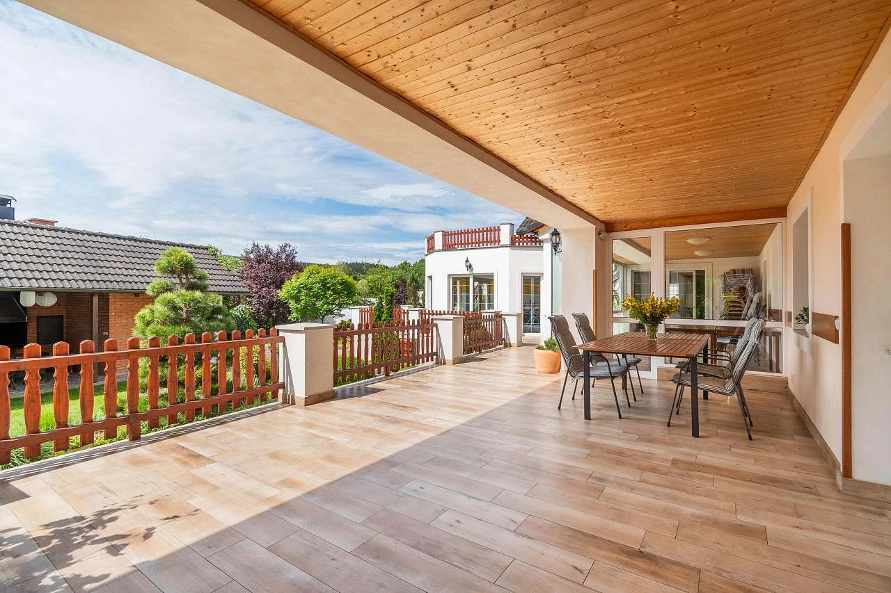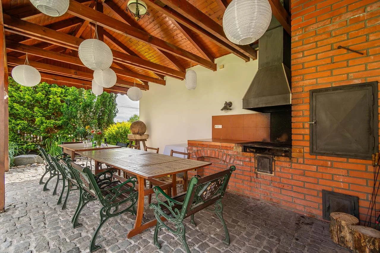 Venkovní prostory zahrnují několik zastřešených teras, gril s udírnou, japonsky laděnou zahradu s jezírkem plným ryb, hřiště a ohniště s možností vaření v kotlíku. V létě je k dispozici trampolína o průměru 4,5 metru a stolní tenis.