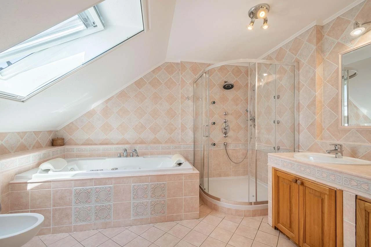 5 koupelen se sprchou (samostatná jen u apartmánu, při plné obsazenosti objektu je každá další koupelna zpravidla společná pro dva pokoje). Navíc sprcha se studenou vodou u sauny. 6 WC (z toho 5 v koupelnách, 1 samostatně). Masážní vana a masážní sprcha v apartmánu. Dvojumyvadlo ve dvou koupelnách. V těchto 2 koupelnách je kromě sprchy zároveň i vana pro dva. V objektu je dále k dispozici pračka, sušička na 8 kg prádla i fény na vlasy.