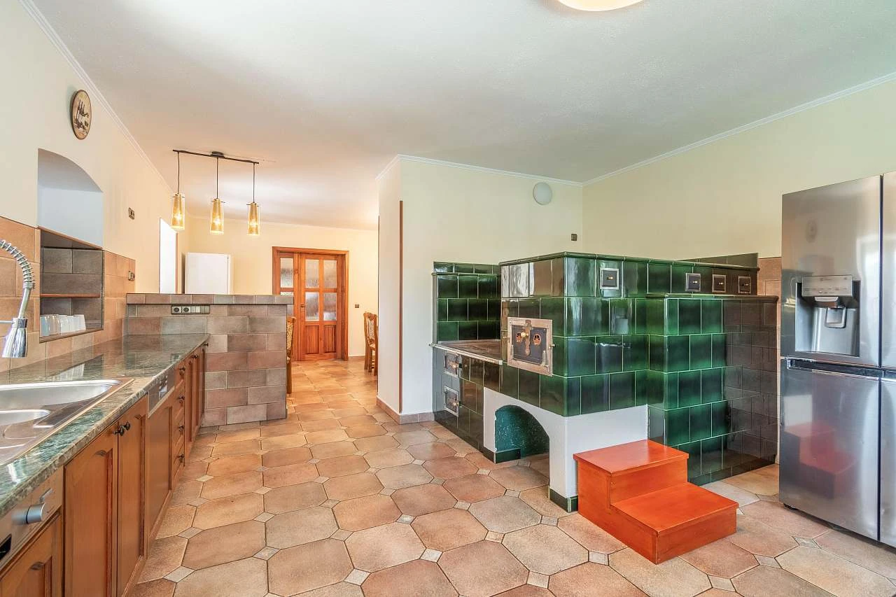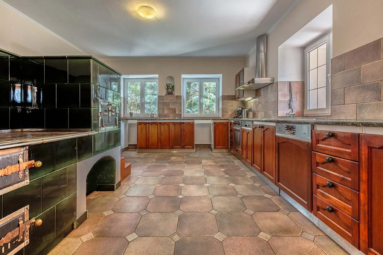 Prostorná kuchyň je vybavena elektrickým sporákem a troubou, dvěma mikrovlnnými troubami, dvěma myčkami nádobí, dvěma lednicemi (jedna americká a jedna s mrazákem), topinkovačem, dvěma rychlovarnými konvicemi, kachlovými kamny s možností vaření a pečení a velkou pecí na chleba a pizzu. K dispozici je také pákový kávovar na mletou kávu nebo kávovar na zrnkovou kávu, včetně surovin. Kuchyň je plně vybavena pro přípravu jídel pro až 30 hostů. Jídlo můžete podávat v jídelně nebo v zimní zahradě.
