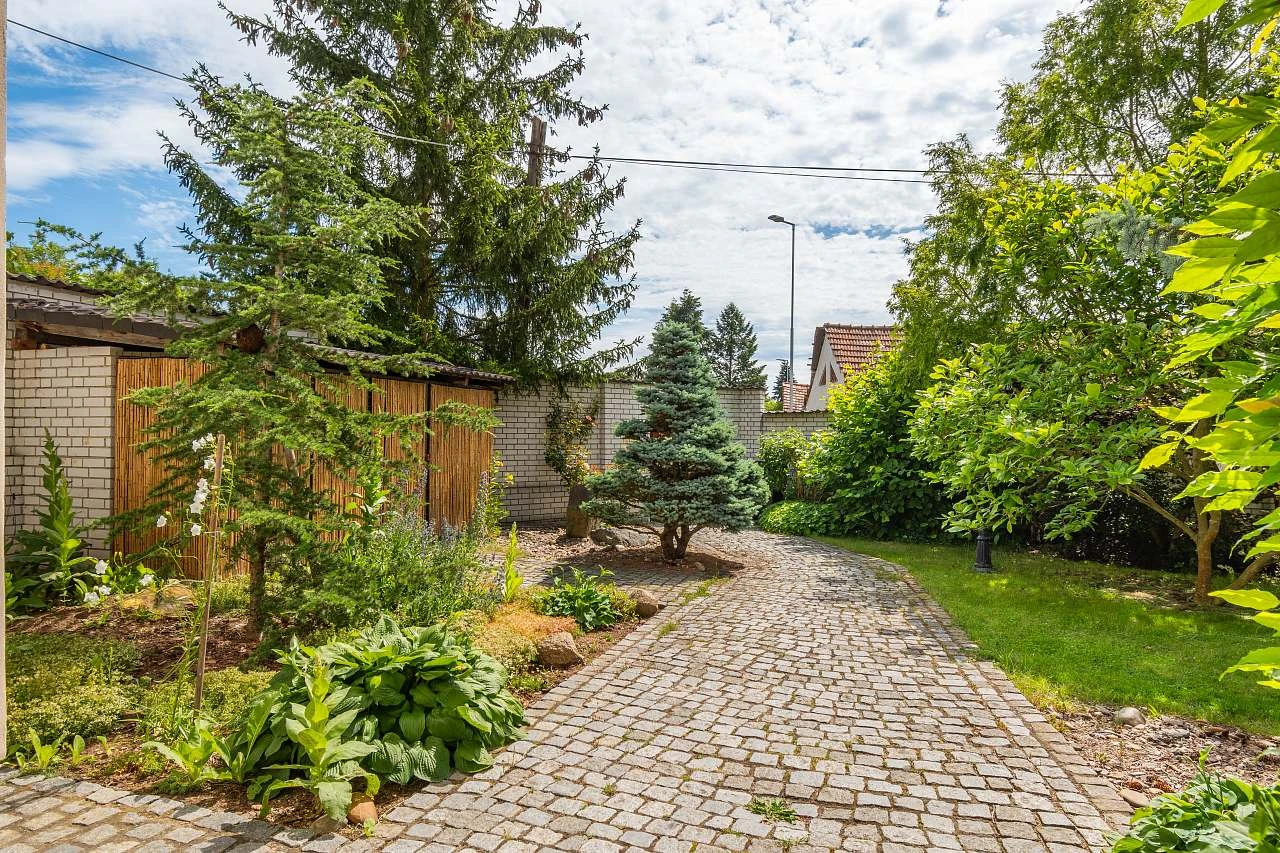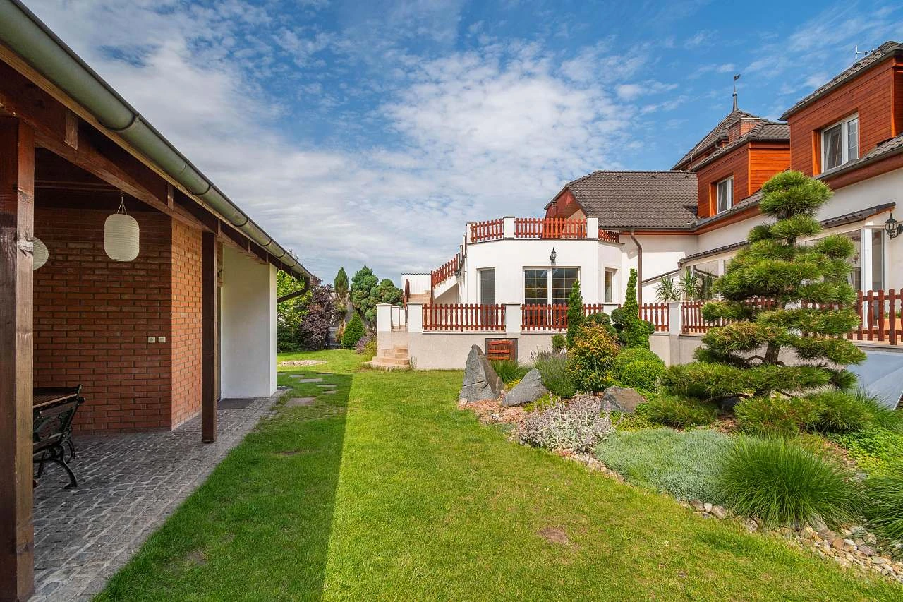 Objekt zahrnuje 13+1 místností, z toho 8 pokojů a meditační věžičku. Celková vnitřní plocha činí 500 m² a venkovní zastřešené i nezastřešené terasy mají plochu 150 m². Pozemek o rozloze 1500 m² je obehnán zdí a nabízí okrasnou zahradu s jezírkem, travnaté hřiště, ohniště, kryté zahradní posezení s grilem a prosklenou verandu.