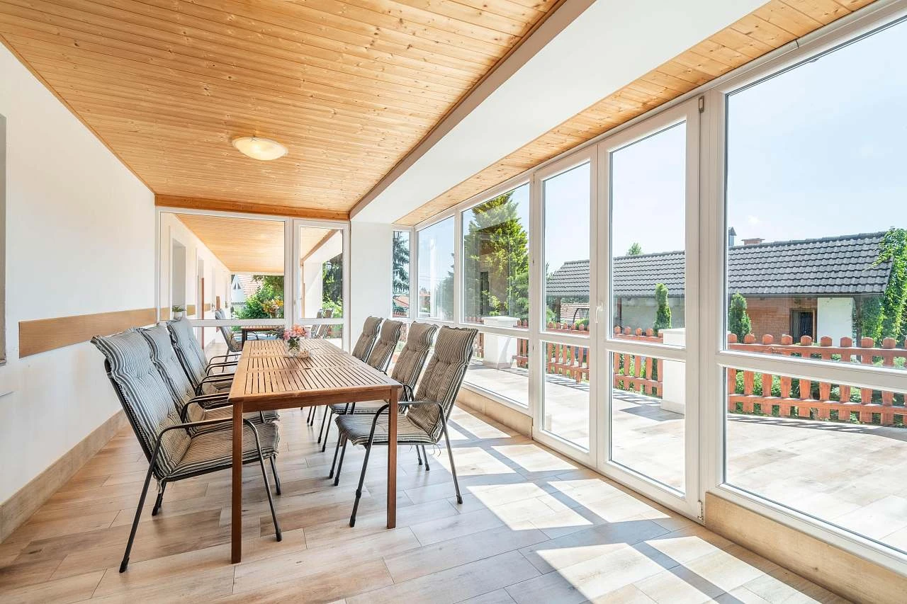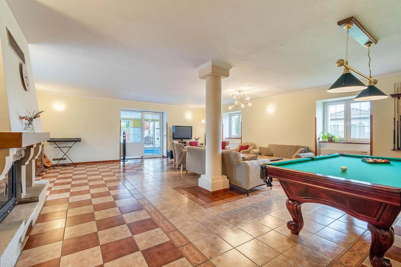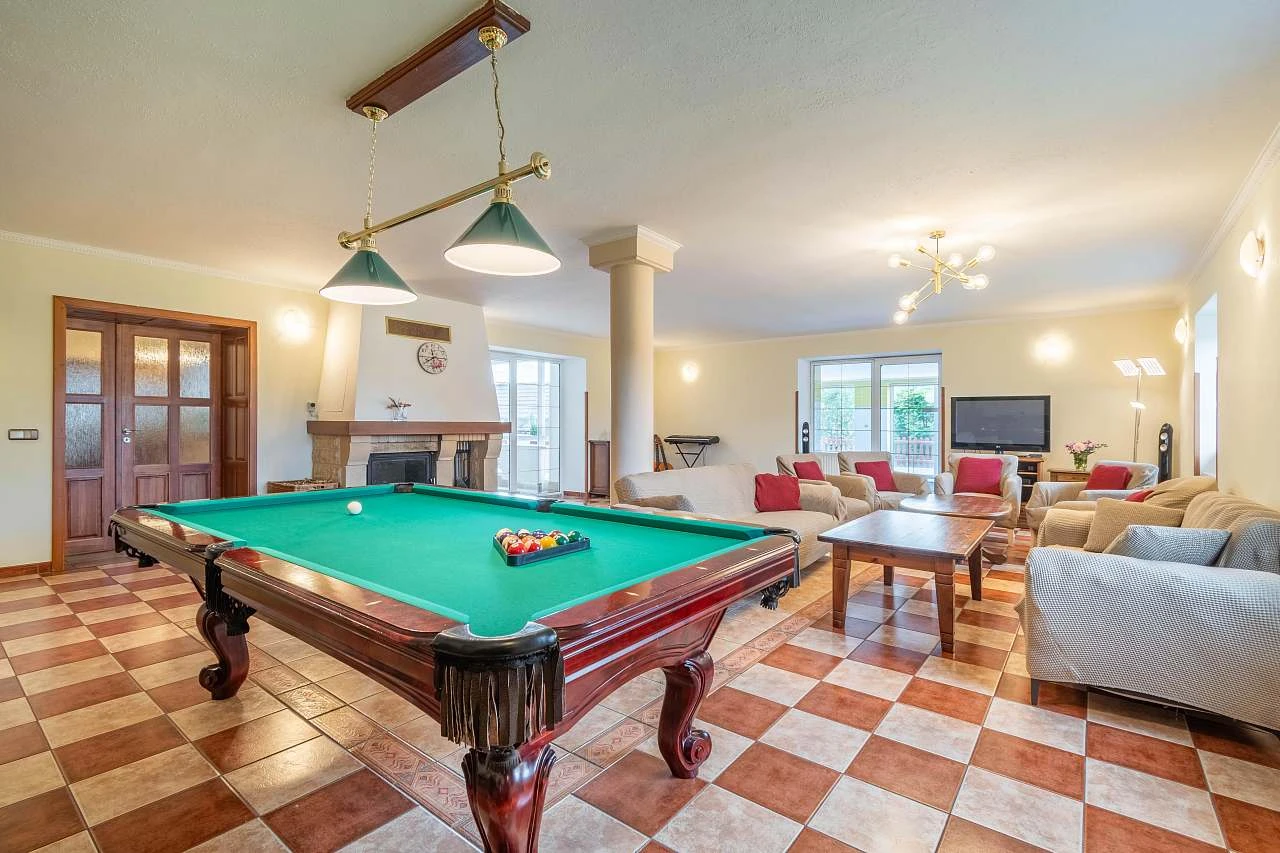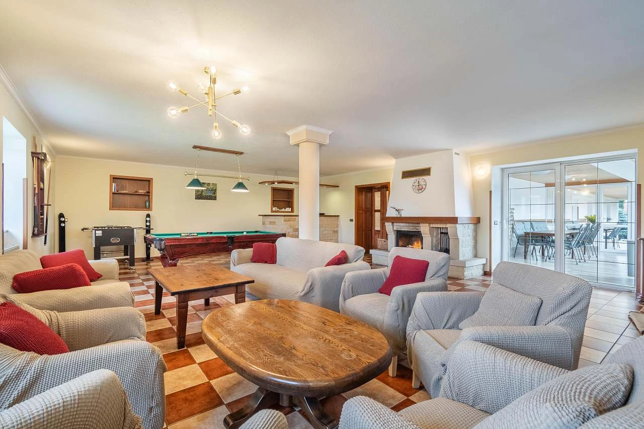 Hlavní částí domu je prostorná společenská místnost o velikosti 70 m², která zahrnuje bar, krb, biliár a stolní fotbálek. Tuto místnost lze přizpůsobit různým typům akcí. Další menší místnost je situována v prosklené verandě a je vybavena zahradním nábytkem pro 12 osob. Třetí místnost také poskytuje posezení pro 12 osob.