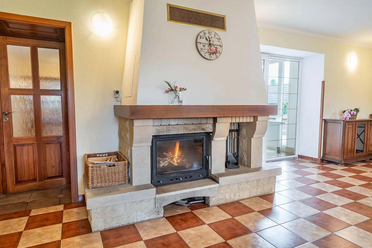Ústřední vytápění elektrickým kotlem, prosklený krb s výměníkem vytápí i radiátory a bazén, dále máte možnost zatopení v kuchyňských kachlových kamnech (možnost spaní na peci). Vodu vyhřívají 3 bojlery 3 x ca 200l.