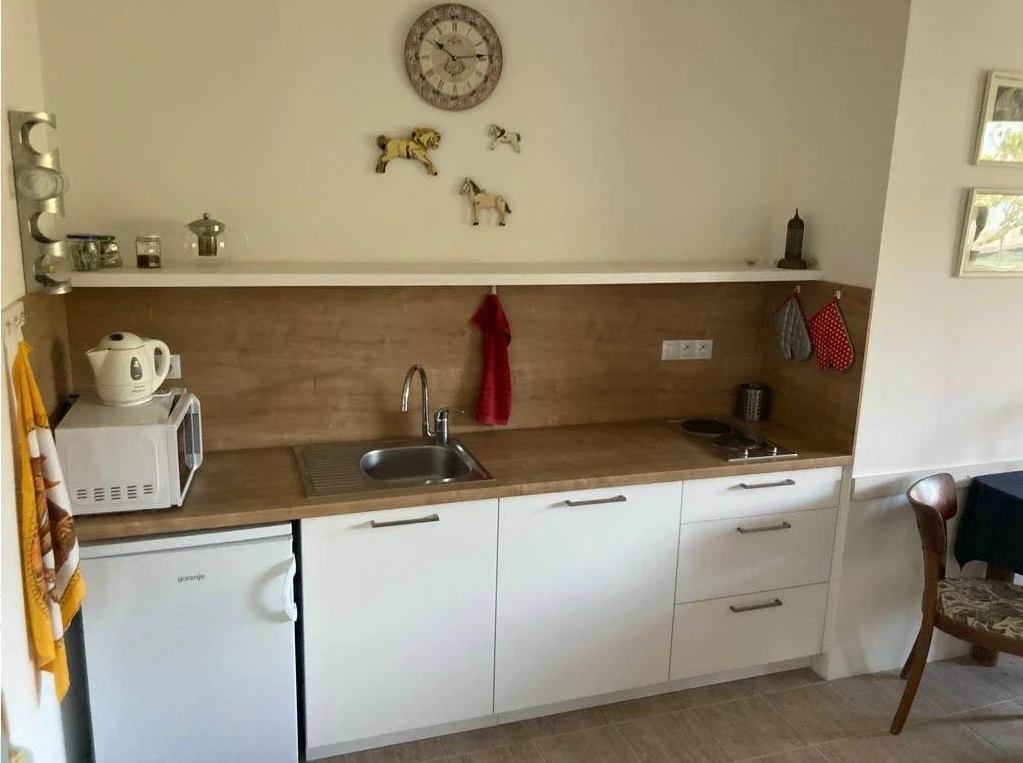 Kuchyň je vybavena mikrovlnnou troubou, rychlovarnou konvicí, elektrickým sporákem a lednicí.
