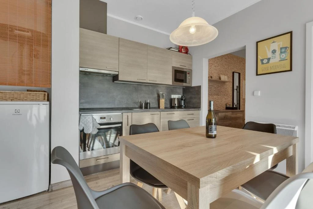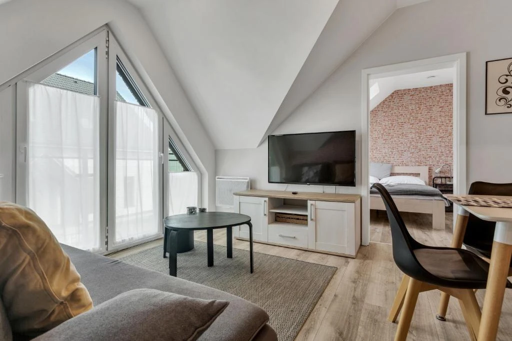 - Útulný obývací pokoj s LCD televizí, rozkládacím gaučem (možnost přistýlky pro 1–2 osoby), plně vybaveným kuchyňským koutem a jídelním stolem pro 6 osob.
