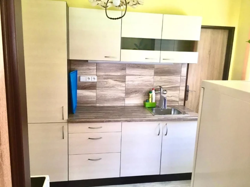 Součástí apartmánu je plně vybavený kuchyňský kout s elektrickou troubou, keramickou varnou deskou, mikrovlnnou troubou, rychlovarnou konvicí, lednicí, mrazničkou a potřebným nádobím.