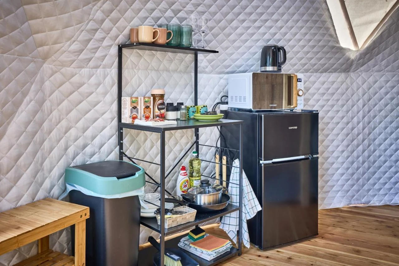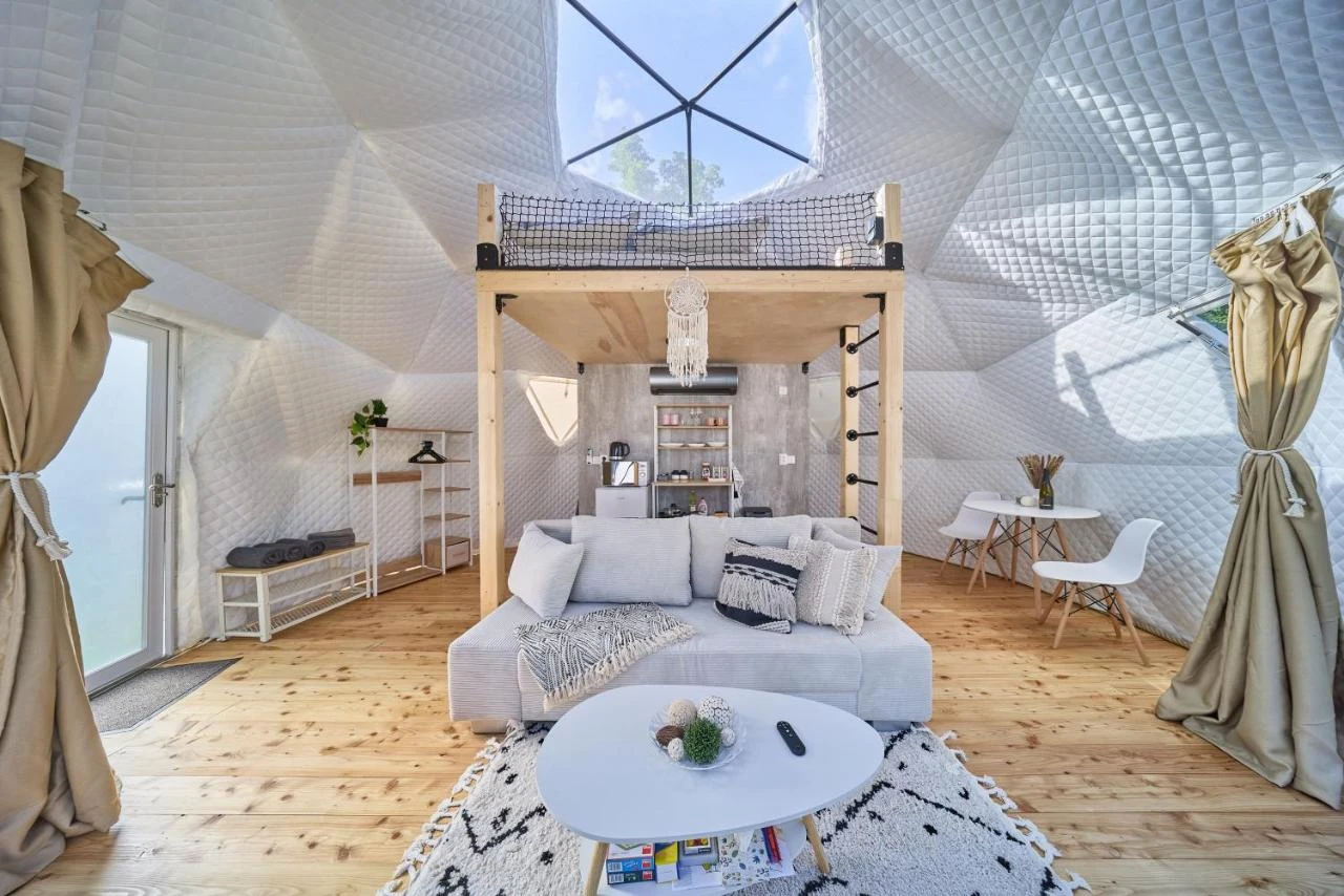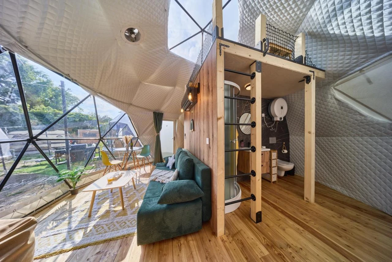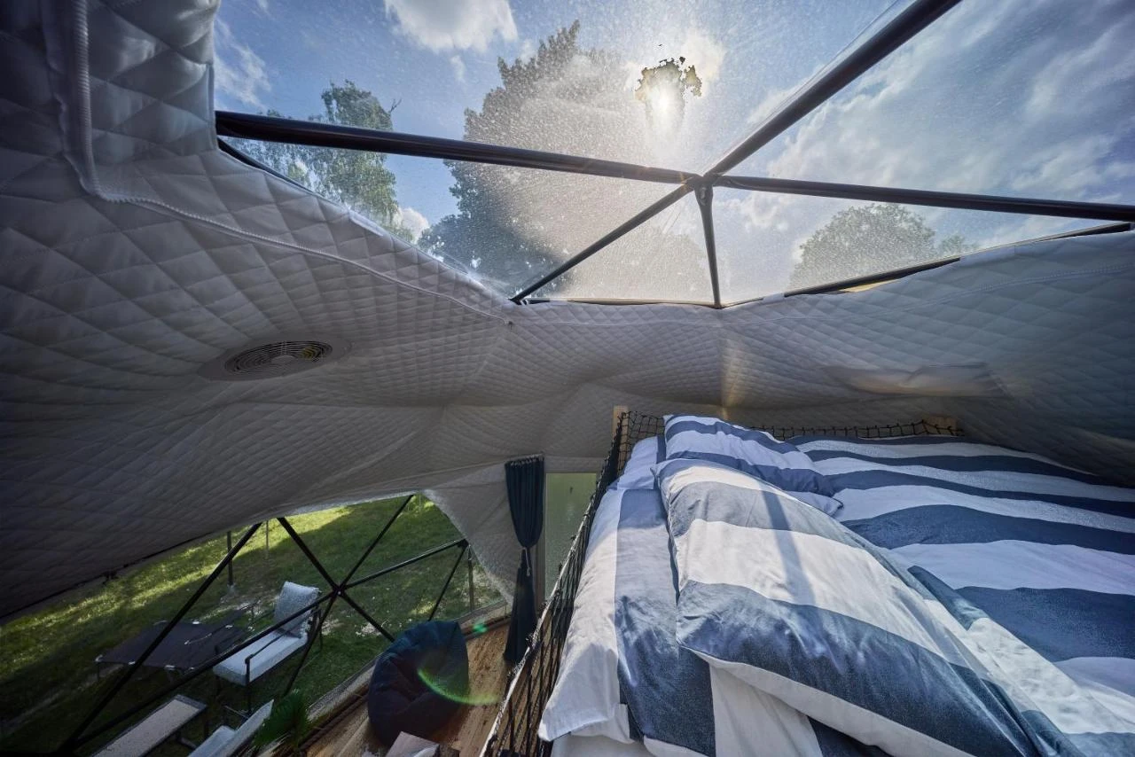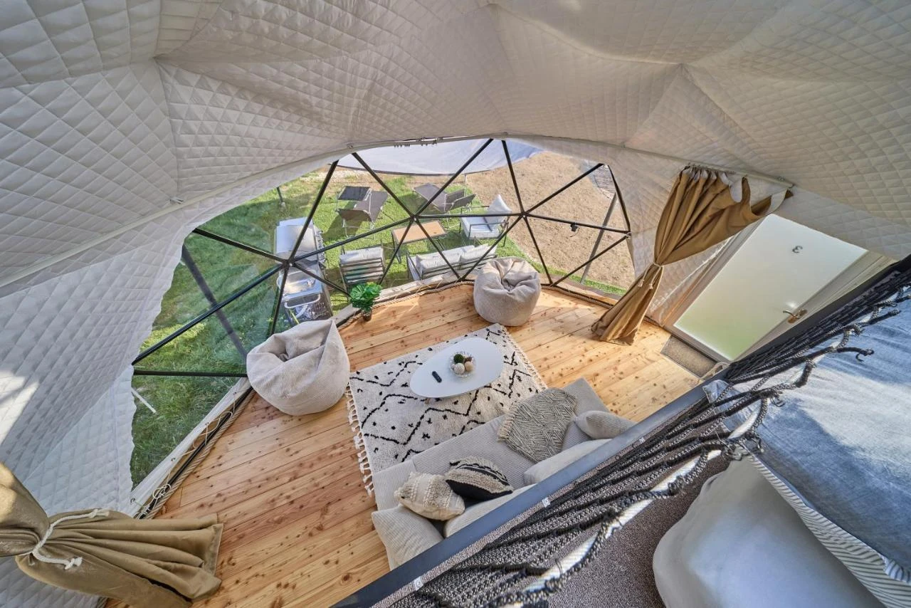 Ubytování v luxusním glampingu stanech pro 4 osoby poskytuje plný komfort a pohodlí. Stany disponují velkými panoramatickými okny nahlížejícími na vodní hladinu, minikuchyňkou, obývacím prostorem, koupelnou a patrem pro spaní s nádherným stropním výhledem. Samozřejmostí je také klimatizace, která zajistí příjemnou teplotu po celý rok.