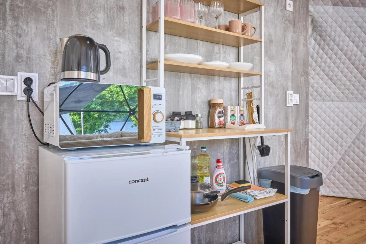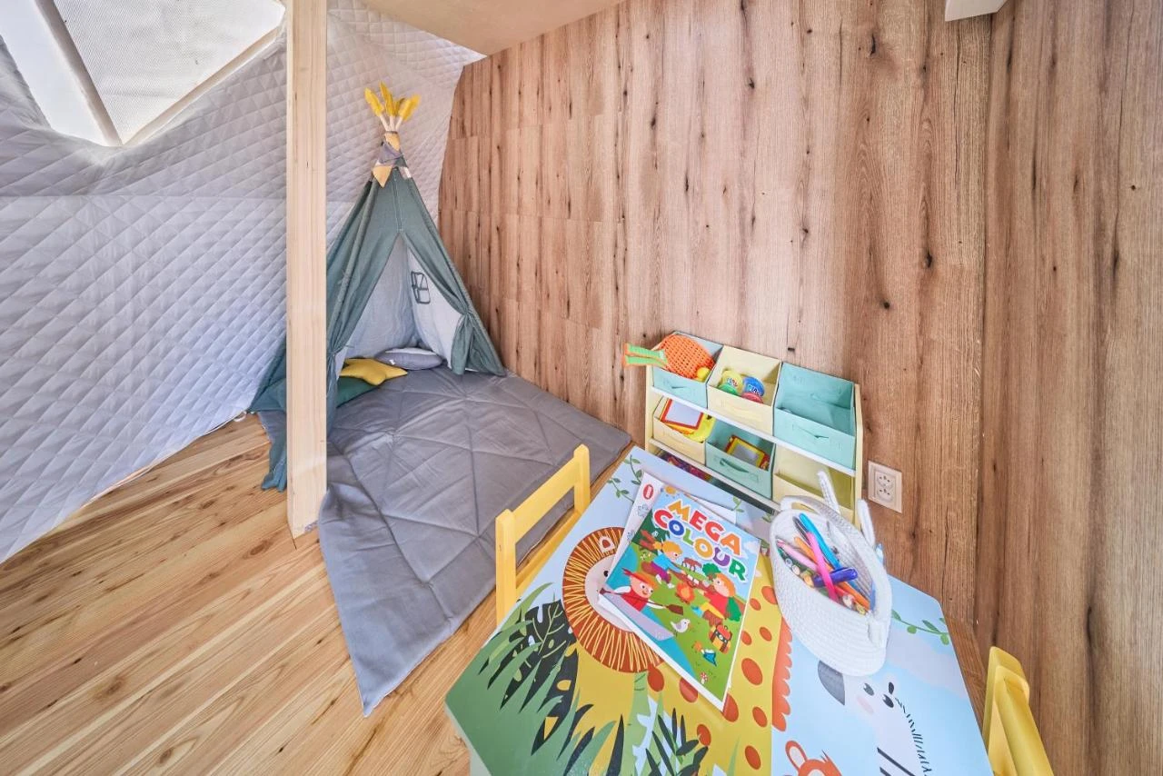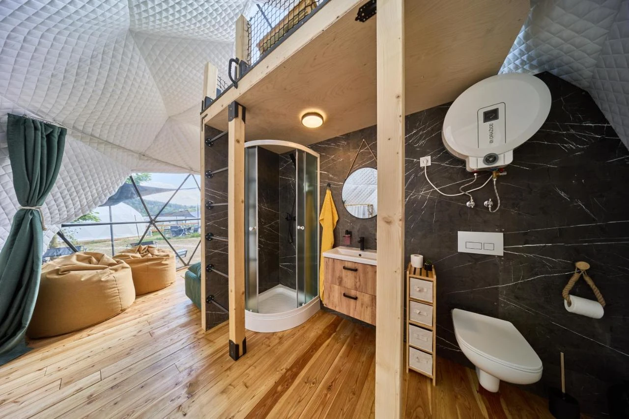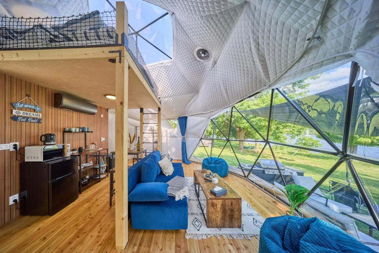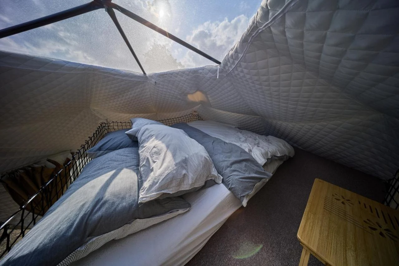 Ubytování v luxusním glampingu stanech pro 4 osoby poskytuje plný komfort a pohodlí. Stany disponují velkými panoramatickými okny nahlížejícími na vodní hladinu, minikuchyňkou, obývacím prostorem, koupelnou a patrem pro spaní s nádherným stropním výhledem. Samozřejmostí je také klimatizace, která zajistí příjemnou teplotu po celý rok.
