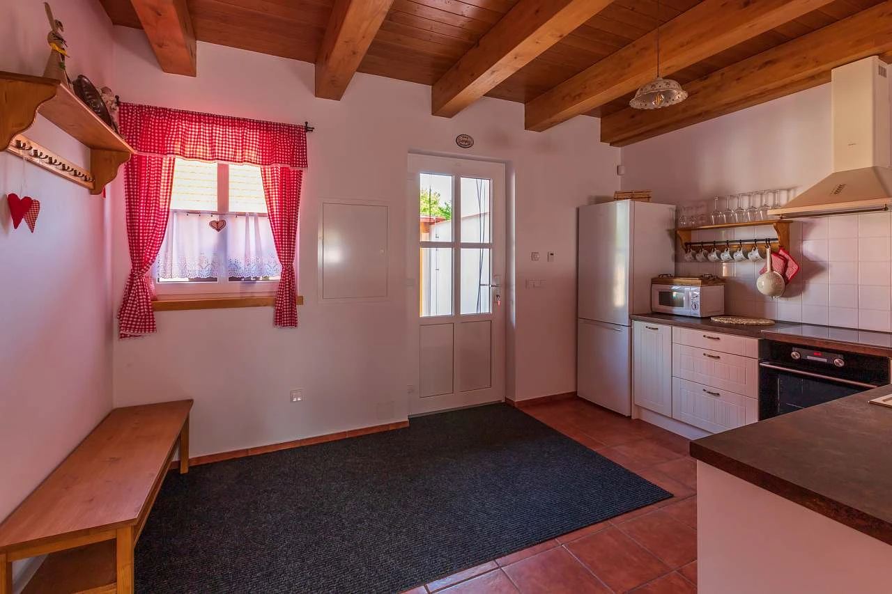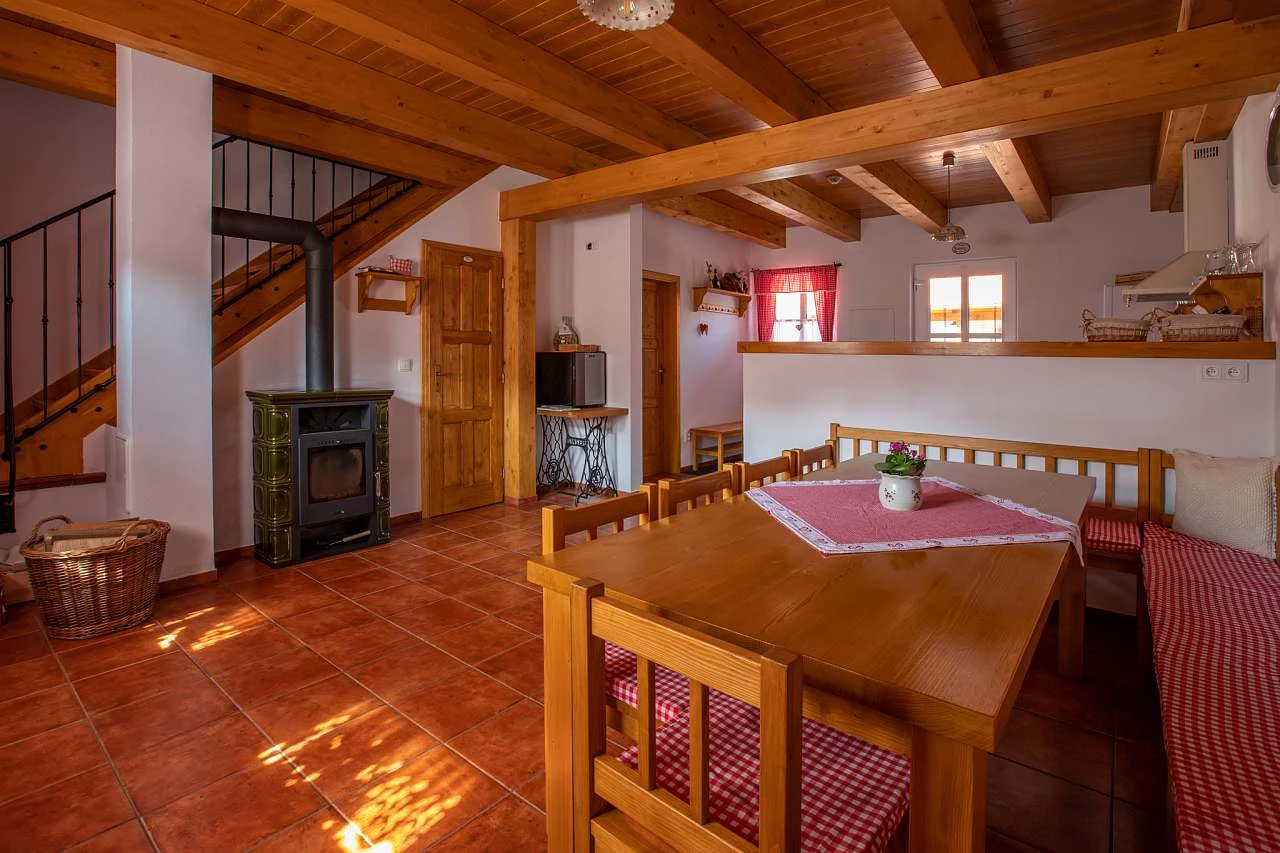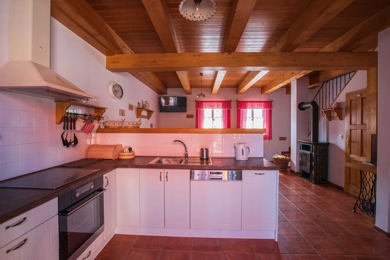 Z dvora chalupy vstoupíte přímo do obývacího pokoje, který je vybaven jídelním koutem, plně zařízenou kuchyní, krbem a televizí. Kuchyňský kout disponuje sklokeramickou varnou deskou s čtyřmi plotýnkami, elektrickou troubou, lednicí s mrazákem, myčkou nádobí, mikrovlnnou troubou, kávovarem Nespresso, toustovačem, elektrickou konvicí a vinotékou.