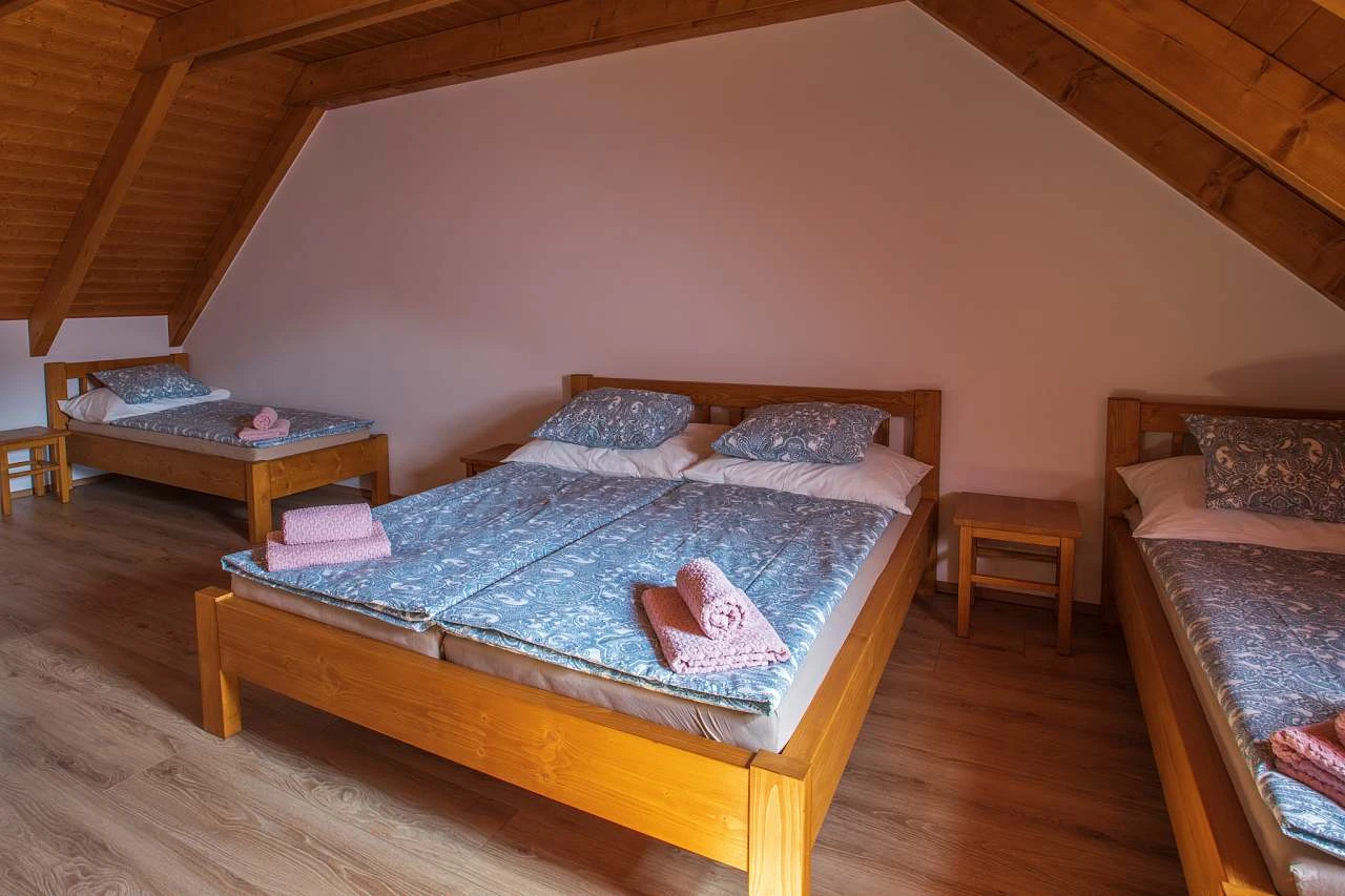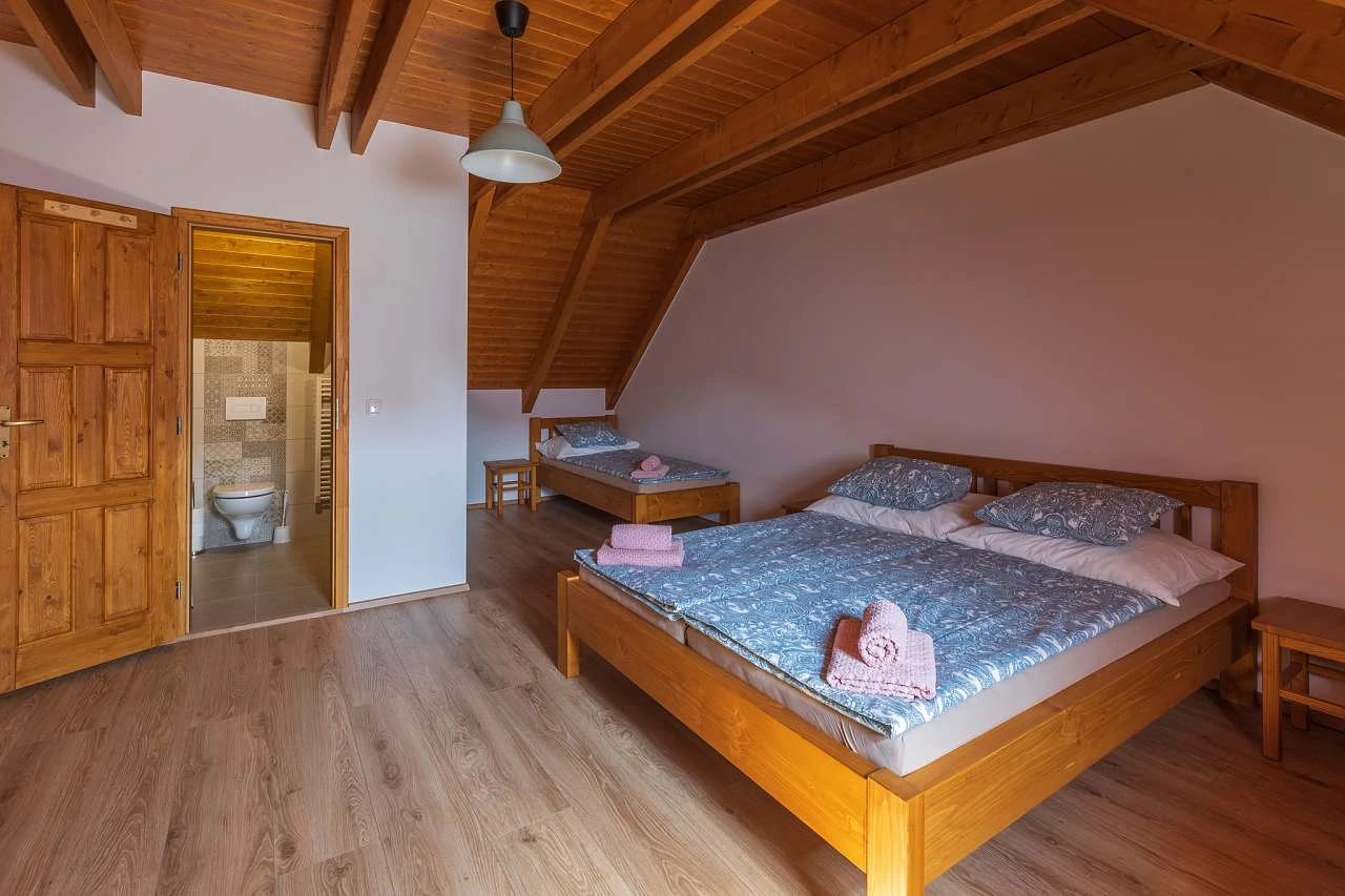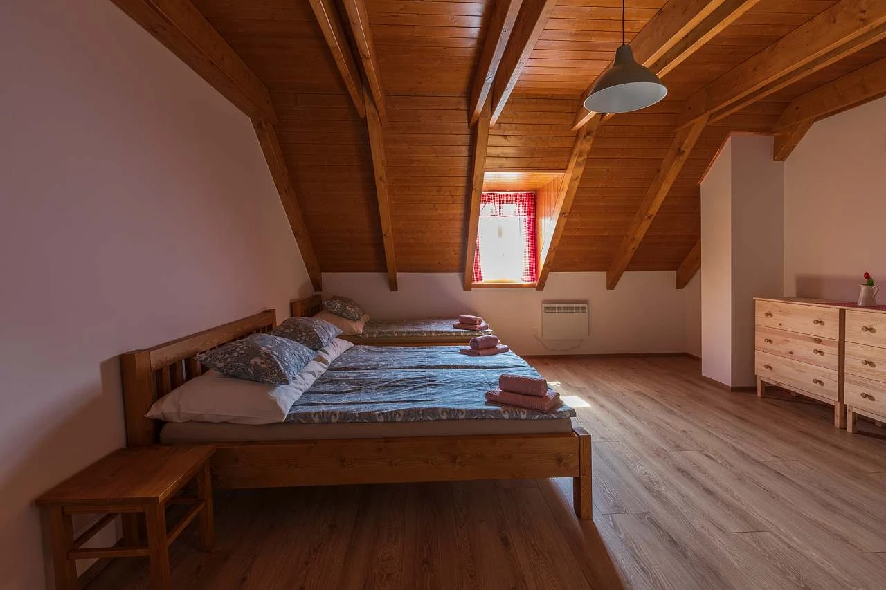Z obytné místnosti vedou schody do podkroví, které obsahuje další dvě ložnice, každá s dvojlůžkem a dvěma lůžky. Každá ložnice má vlastní koupelnu se sprchovým koutem, umyvadlem a WC. Ložnice v podkroví jsou klimatizované. Chalupa je vybavena připojením k internetu (WI-FI).