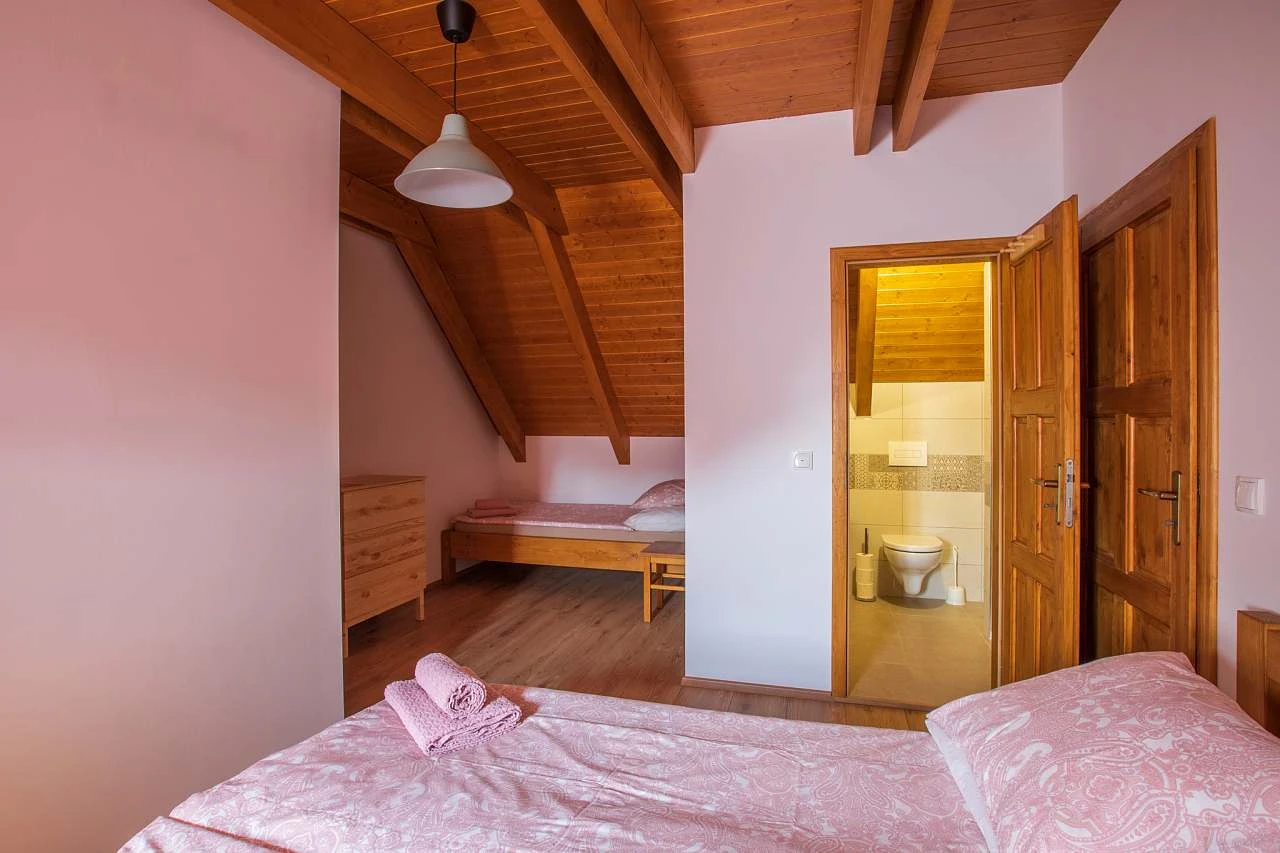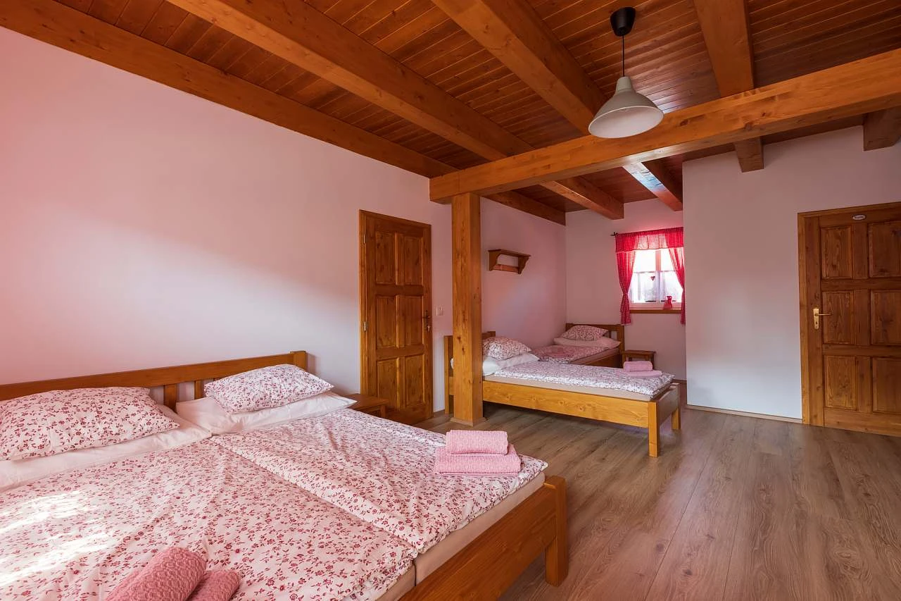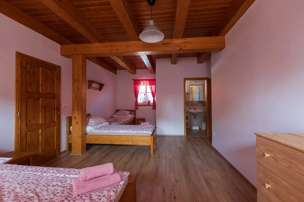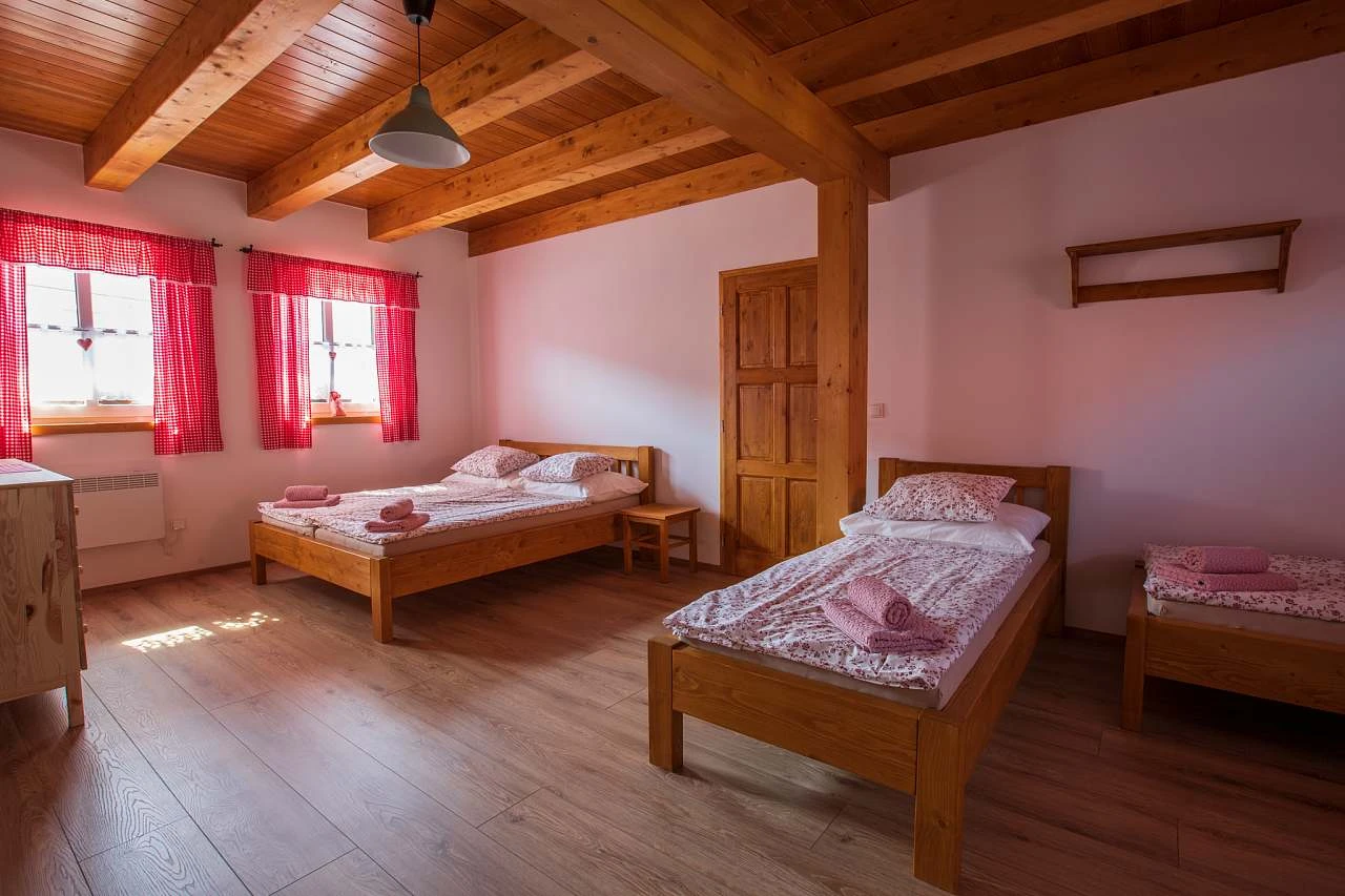 Z obytné místnosti vedou schody do podkroví, které obsahuje další dvě ložnice, každá s dvojlůžkem a dvěma lůžky. Každá ložnice má vlastní koupelnu se sprchovým koutem, umyvadlem a WC. Ložnice v podkroví jsou klimatizované. Chalupa je vybavena připojením k internetu (WI-FI).