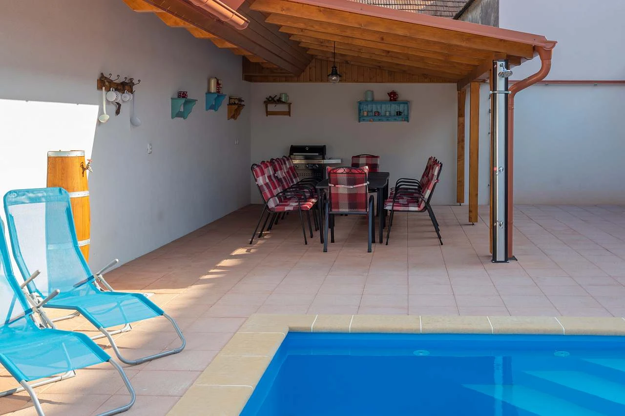 Na dlážděném oploceném dvoře o rozloze 140 metrů čtverečních se nachází zapuštěný vyhřívaný bazén (5 x 3 x 1,4 m, v provozu od května do konce září) a pergola s venkovním posezením, plynovým grilem a lednicí. Parkování je možné přímo u chalupy na odděleném, ale neoploceném parkovišti. U parkoviště je také uzamykatelný úložný prostor pro kola.