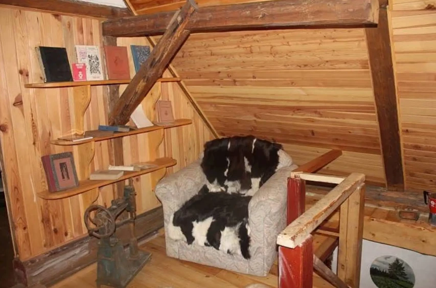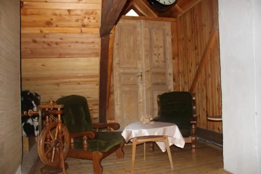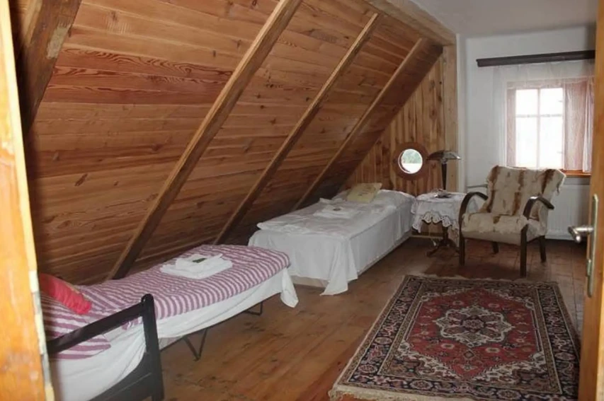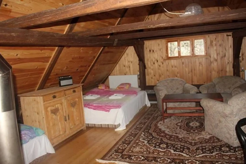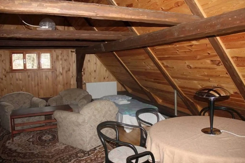 V patře se nachází dvě další ložnice – 3-lůžková s manželskou postelí a samostatným lůžkem a 4-lůžková s manželskou postelí a dvěma samostatnými lůžky. Součástí větší ložnice je i pohovka. Na patře je rovněž odpočívárna s křesly. V případě potřeby jsou k dispozici tři matrace. Chalupa disponuje koupelnou se sprchovým koutem, umyvadlem a toaletou.