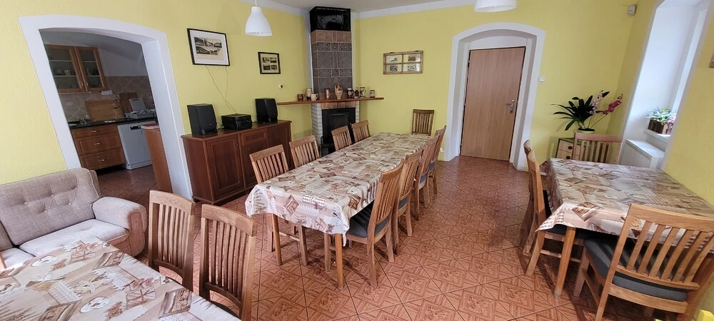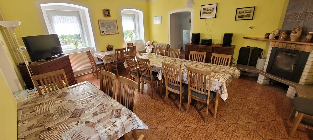 Ve společenské místnosti najdete krb, který vytváří útulnou atmosféru, a je ideálním místem pro společné večery nebo odpočinek po dni stráveném venku.