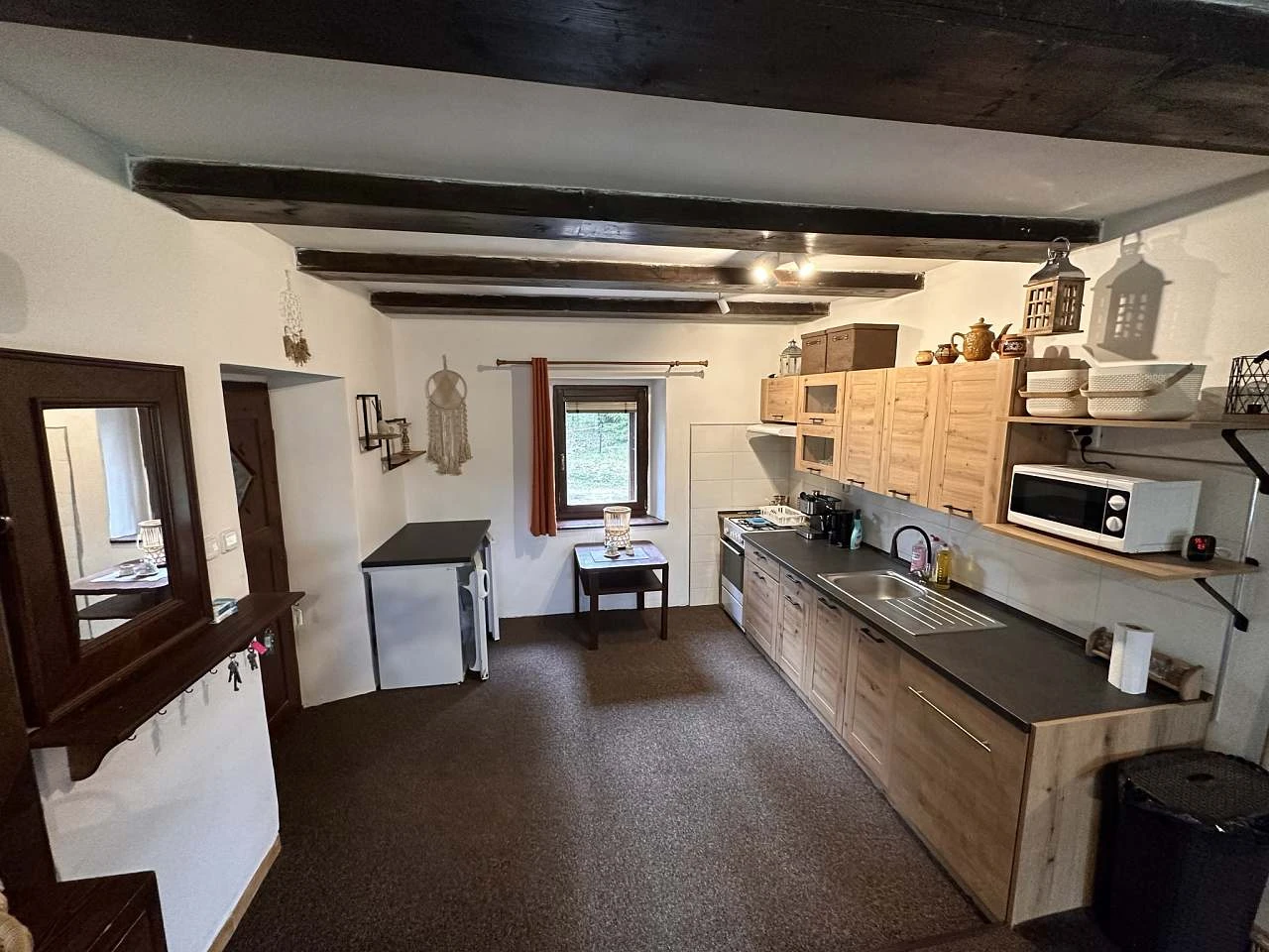 Chata disponuje kompletně vybavenou kuchyňskou linkou se sporákem, mikrovlnnou troubou, lednicí a myčkou. K dispozici je veškeré nádobí. Na venkovní travnaté ploše je možnost grilování a využití velkého ohniště k posezení.