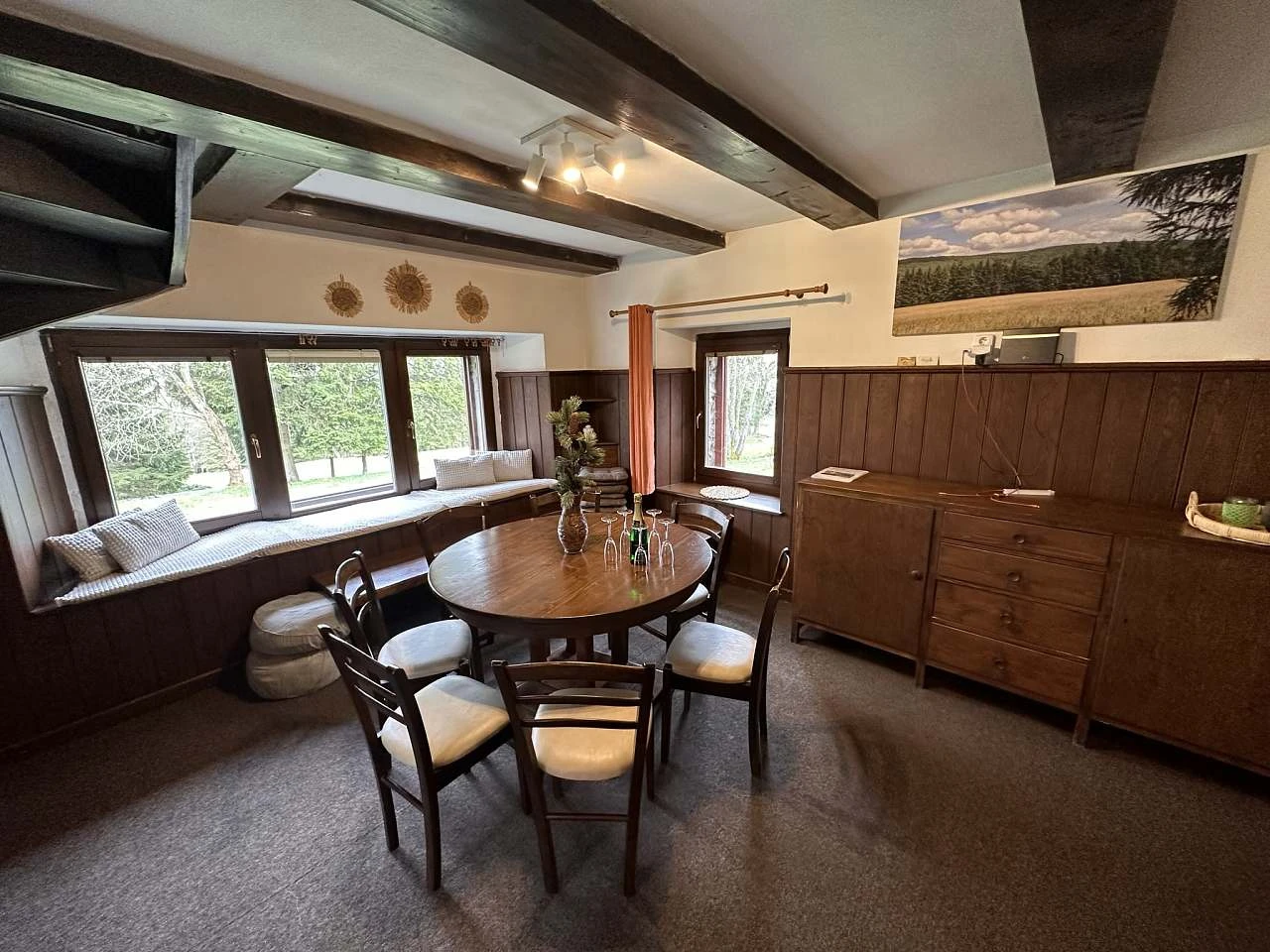Jídelna: Společenský stůl se židlemi pro 6 osob, další židle a stolek u kuchyňské linky, k dispozici je také dětská židlička.