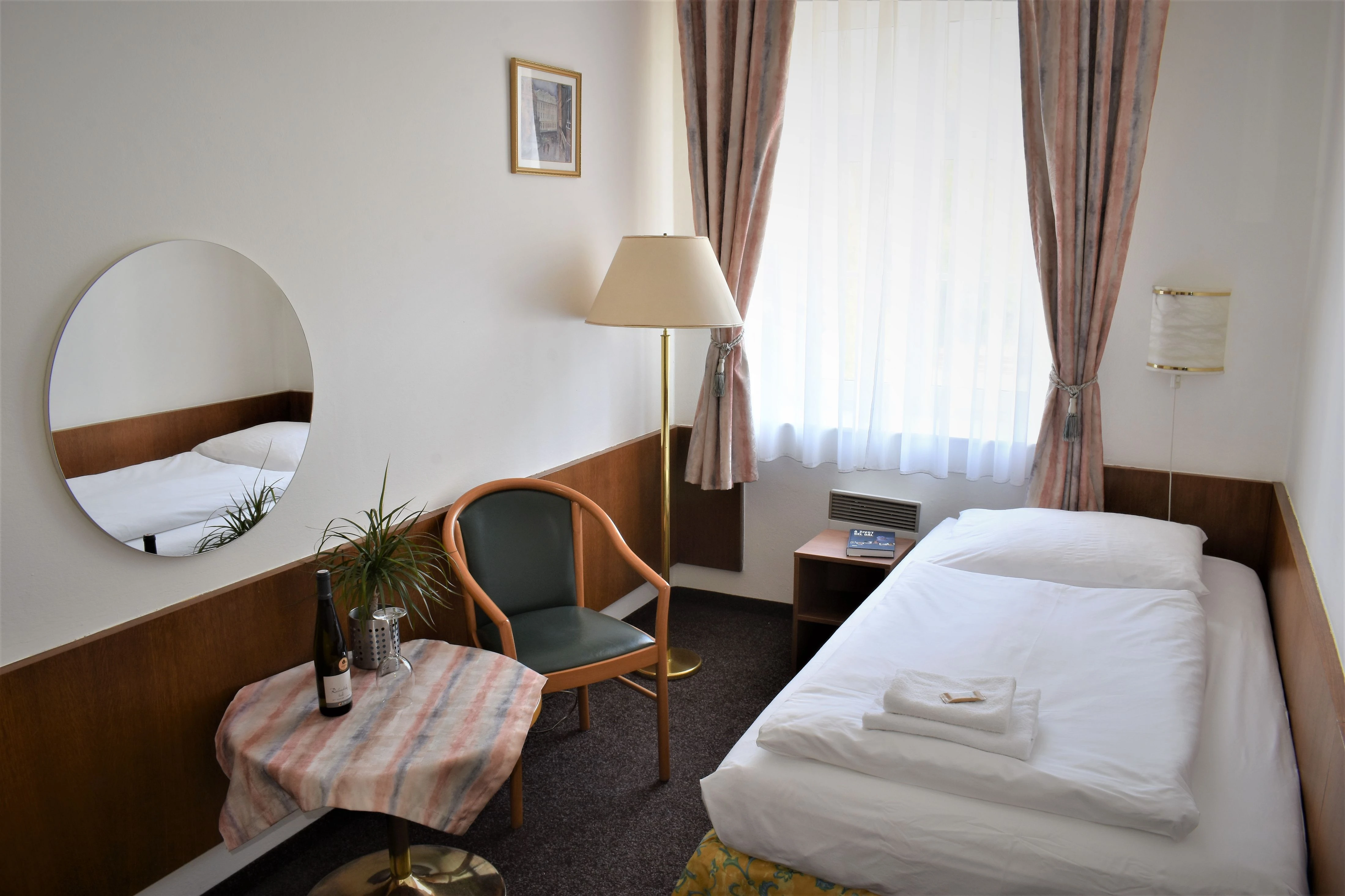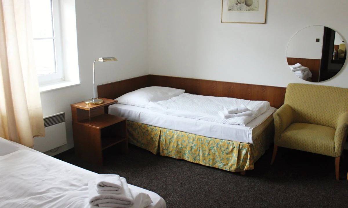 Jednolůžkový pokoj - Jednolůžkový pokoj moderně zařízený s vlastním WC a sprchovým kout. Na pokoji je televize, WiFi připojení, fén a malá lednice.