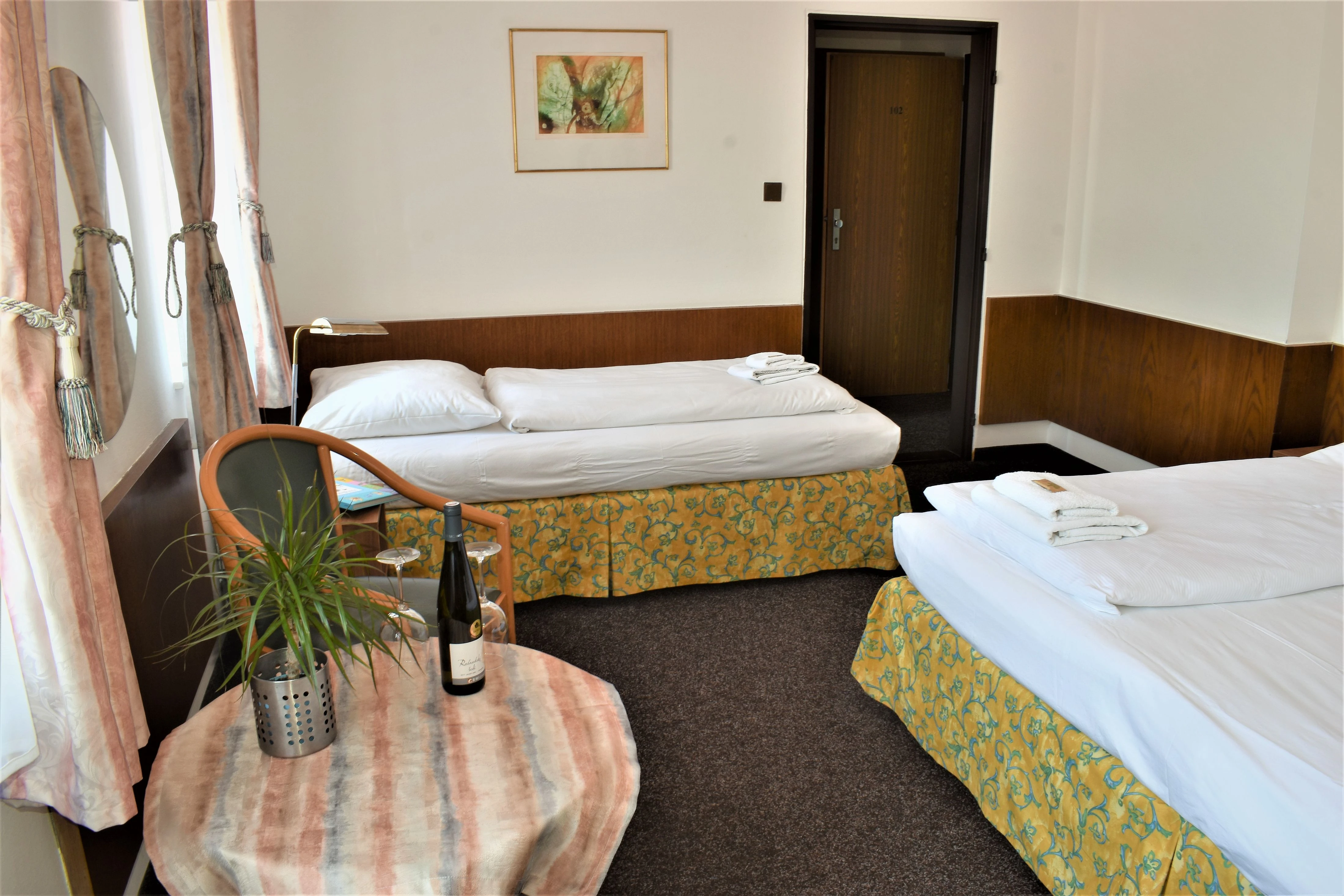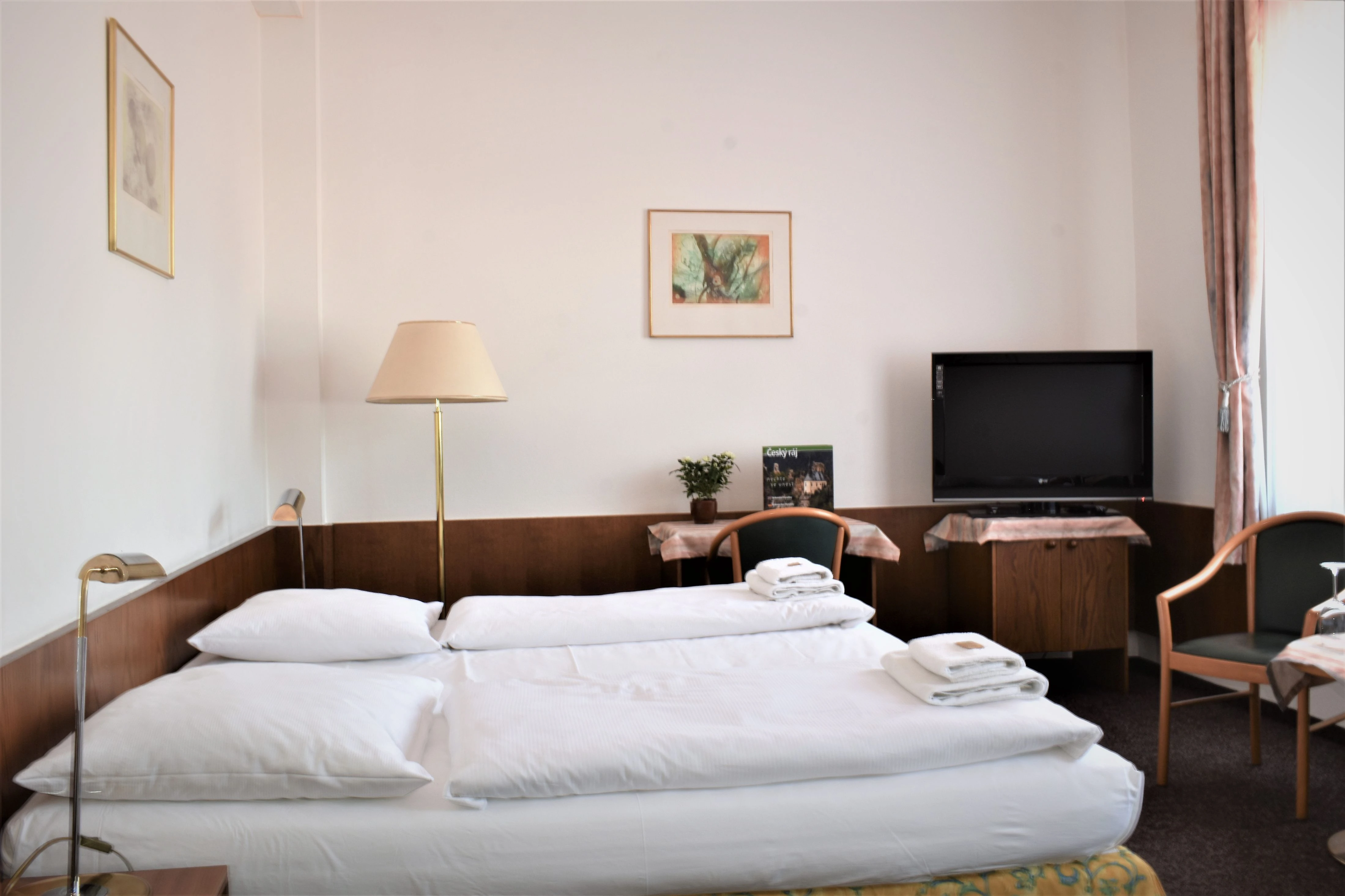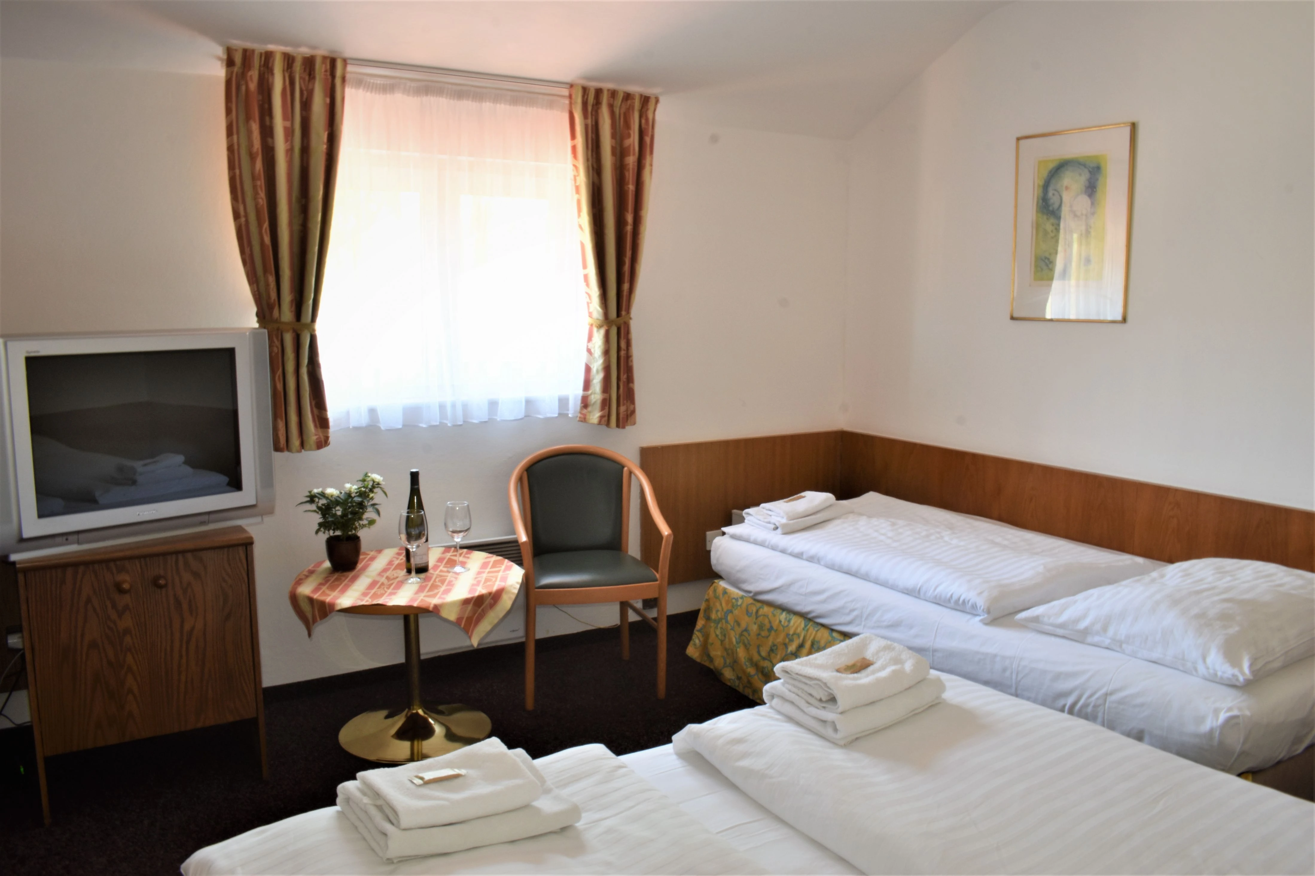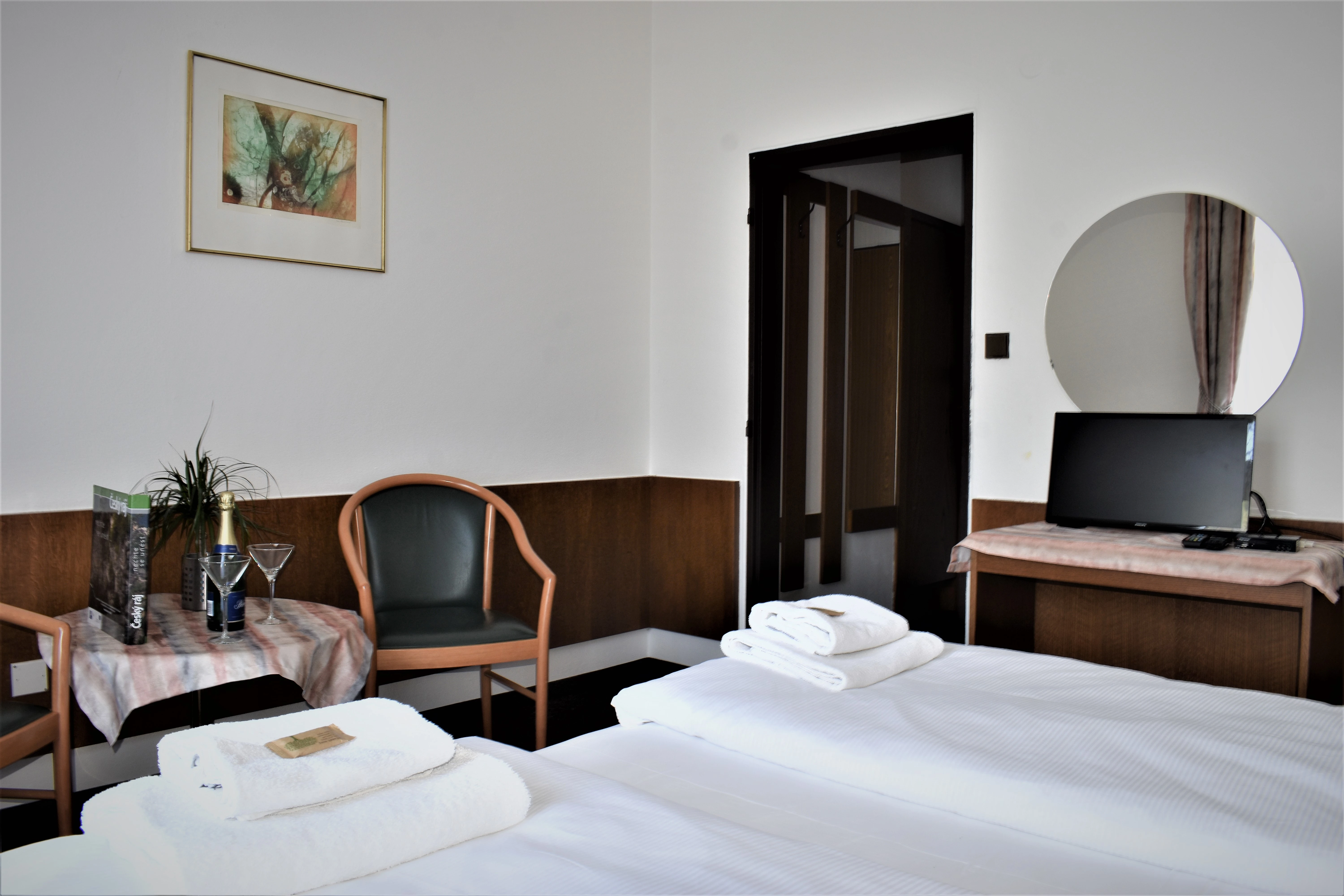 Twin - pokoj pro dvě osoby, moderně zařízený s vlastním WC a sprchovým kout. Na pokoji je televize, WiFi připojení, fén a malá lednice.