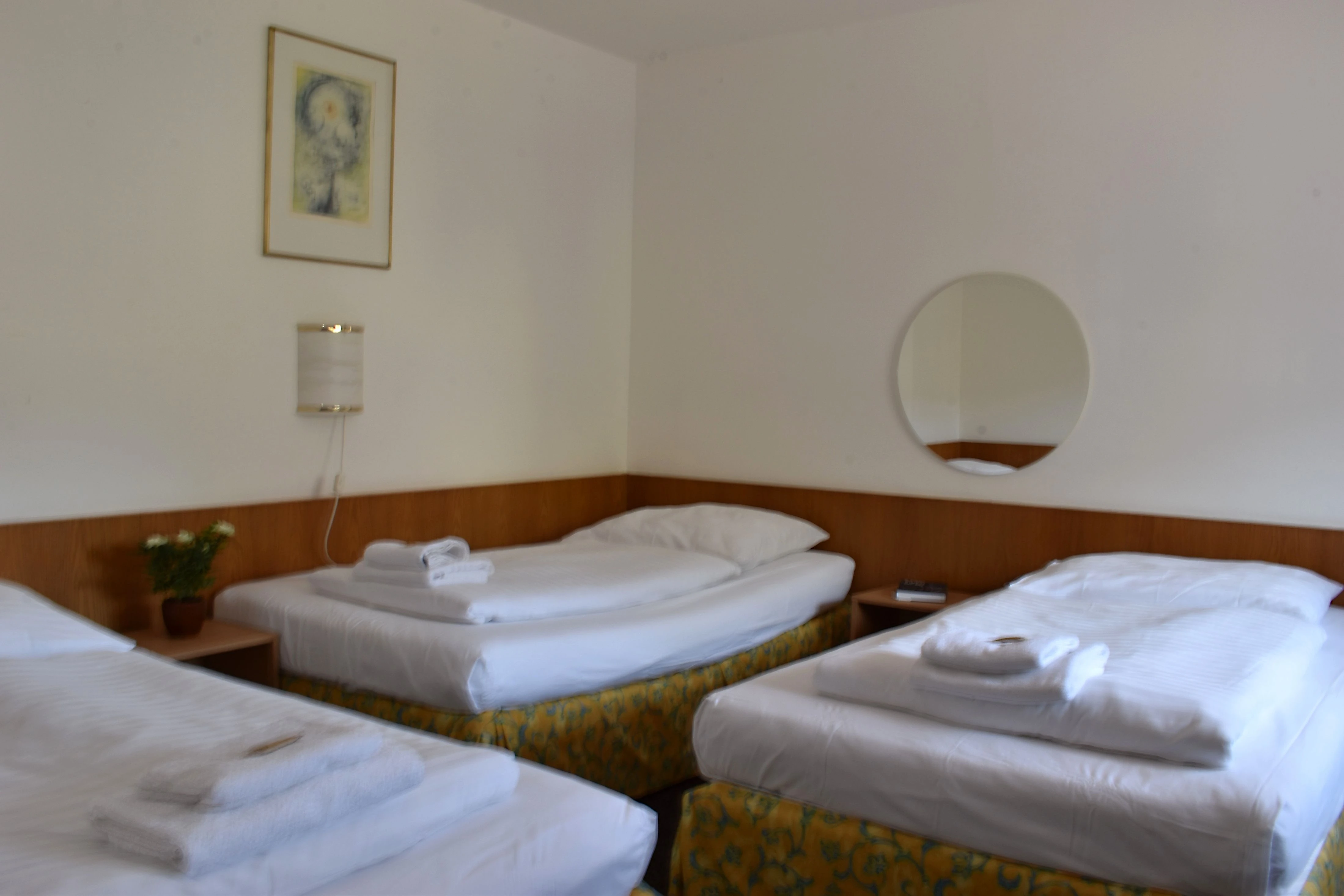 Třílůžkový pokoj - moderně zařízený s vlastním WC a sprchovým kout. Na pokoji je televize, WiFi připojení, fén a malá lednice.