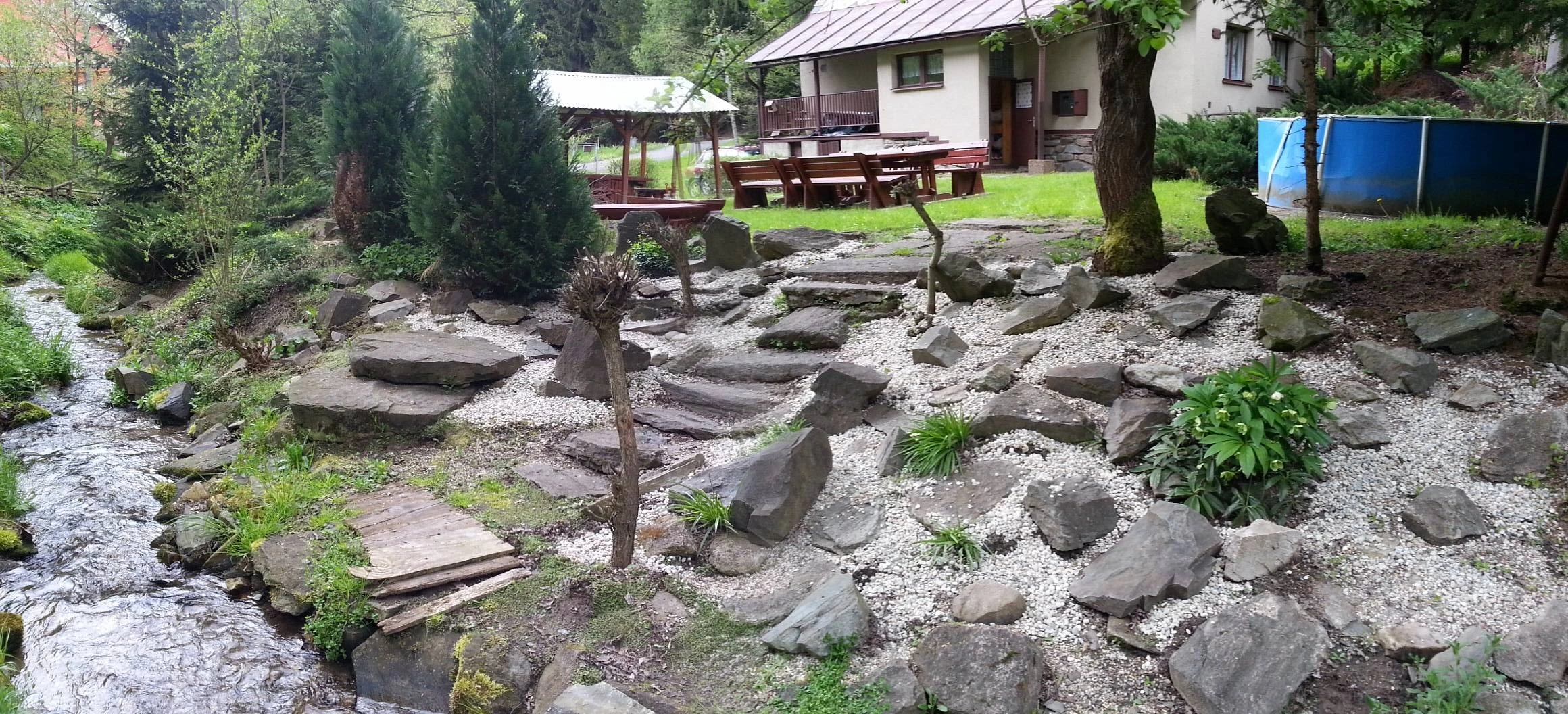Na zahradě se nachází bazén o průměru 3,5 metru, ohniště s posezením, zahradní krb, gril a udírna. K dispozici je také kryté posezení, které vám umožní trávit čas venku i v případě nepříznivého počasí. Na zahradě je také zahradní nábytek, který vám poskytne pohodlné posezení. Kromě toho se na pozemku nachází horský potok, který je domovem pro rybičky.
