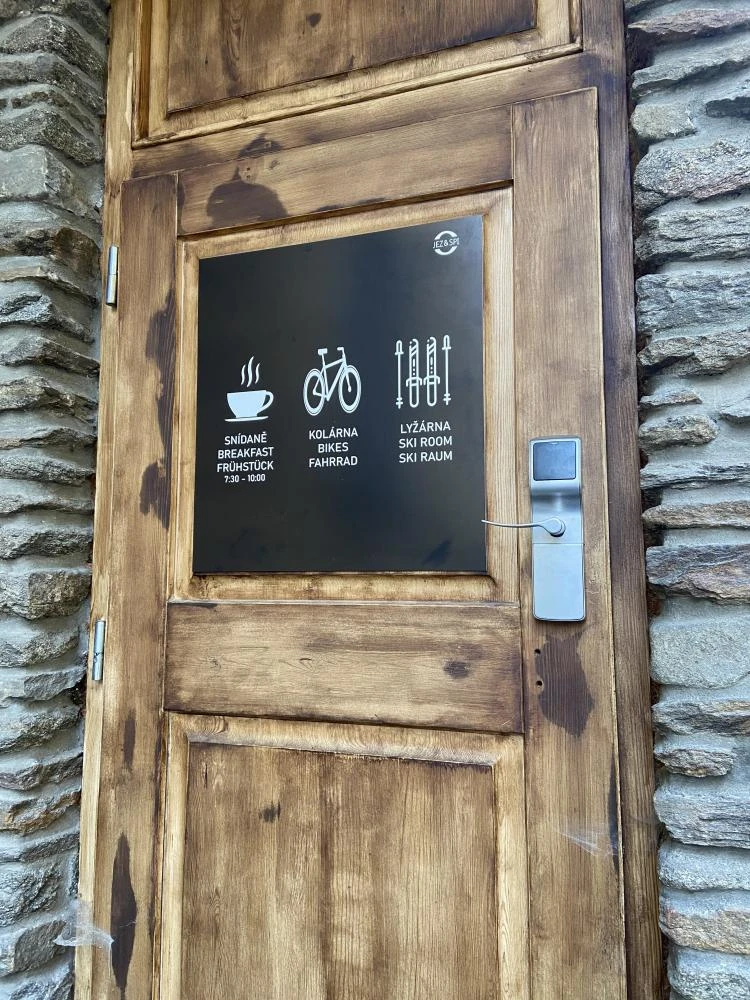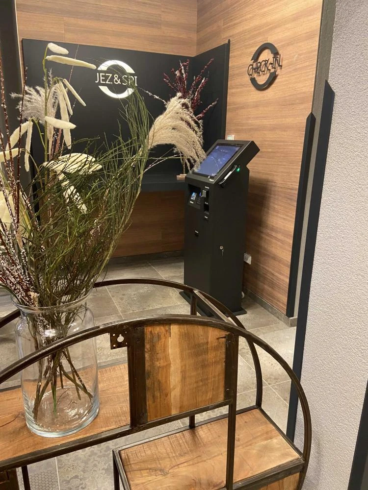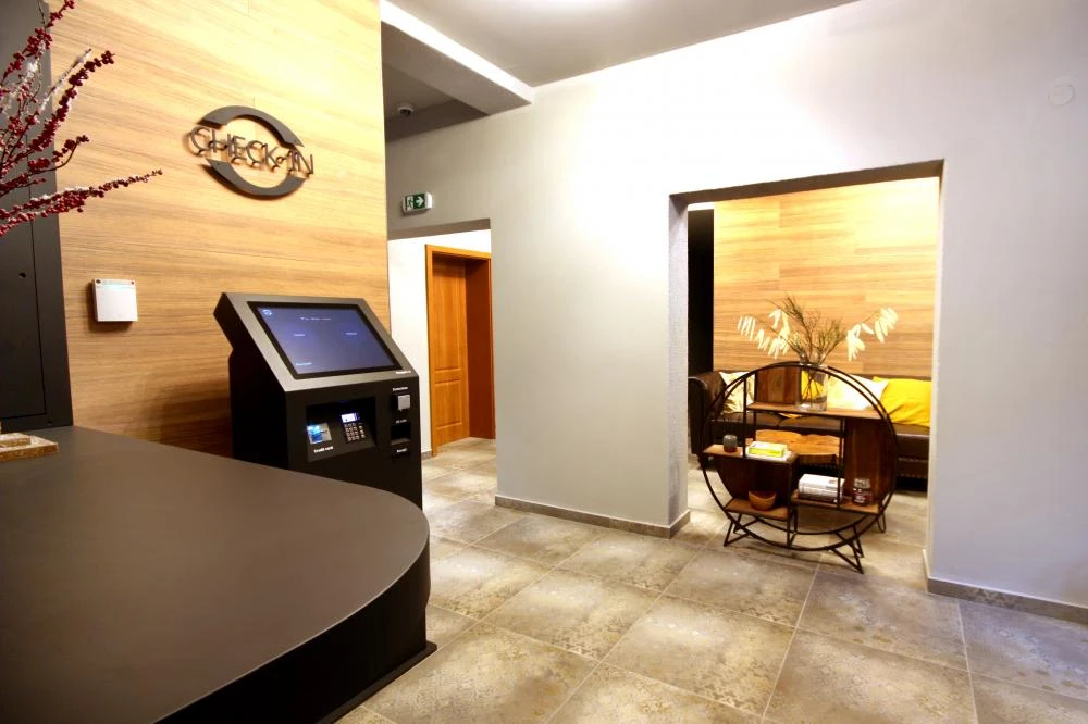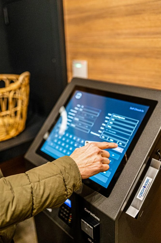 Při příjezdu host zadá unikátní kód a získá přístup do budovy. Svou rezervaci potvrdí na samoobslužném kiosku, kde provede check-in a případně doplatí pobyt kartou. Kiosek mu následně vydá elektronickou kartu, která slouží k přístupu do pokoje, snídaňové místnosti a kolárny. Při odjezdu host jednoduše provede check-out přes kiosek a vrátí karty. Celý proces je rychlý, jednoduchý a umožňuje hostům maximální flexibilitu.