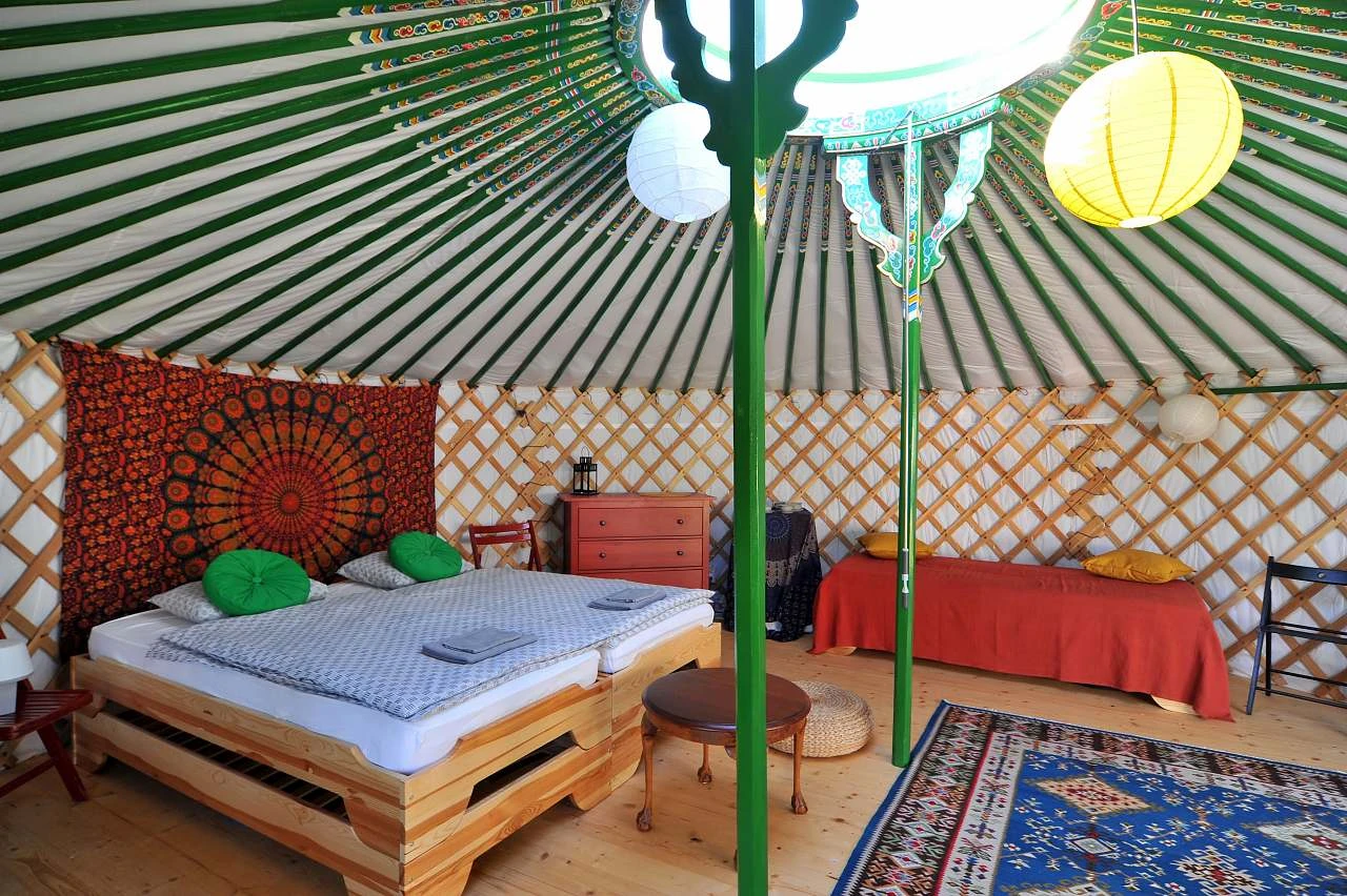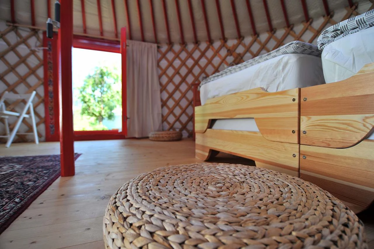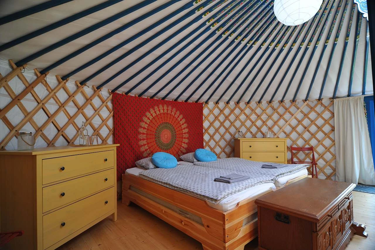 Každá z malovaných jurt je vybavena pohodlnými stohovatelnými dřevěnými postelemi s lamelovými rošty a kvalitními matracemi, které zajišťují příjemný spánek. Hosté mají k dispozici přikrývky a polštáře, vlněné koberce, a různé dekorativní prvky, které dodávají prostoru útulnost. V každé jurte najdete také dvě komody, odkládací stolky, židle a závěsná světla spolu s lampičkami. Ložní prádlo a ručníky jsou samozřejmostí. Celý areál nabízí vysokorychlostní bezdrátový internet, takže můžete zůstat ve spojení i během pobytu.