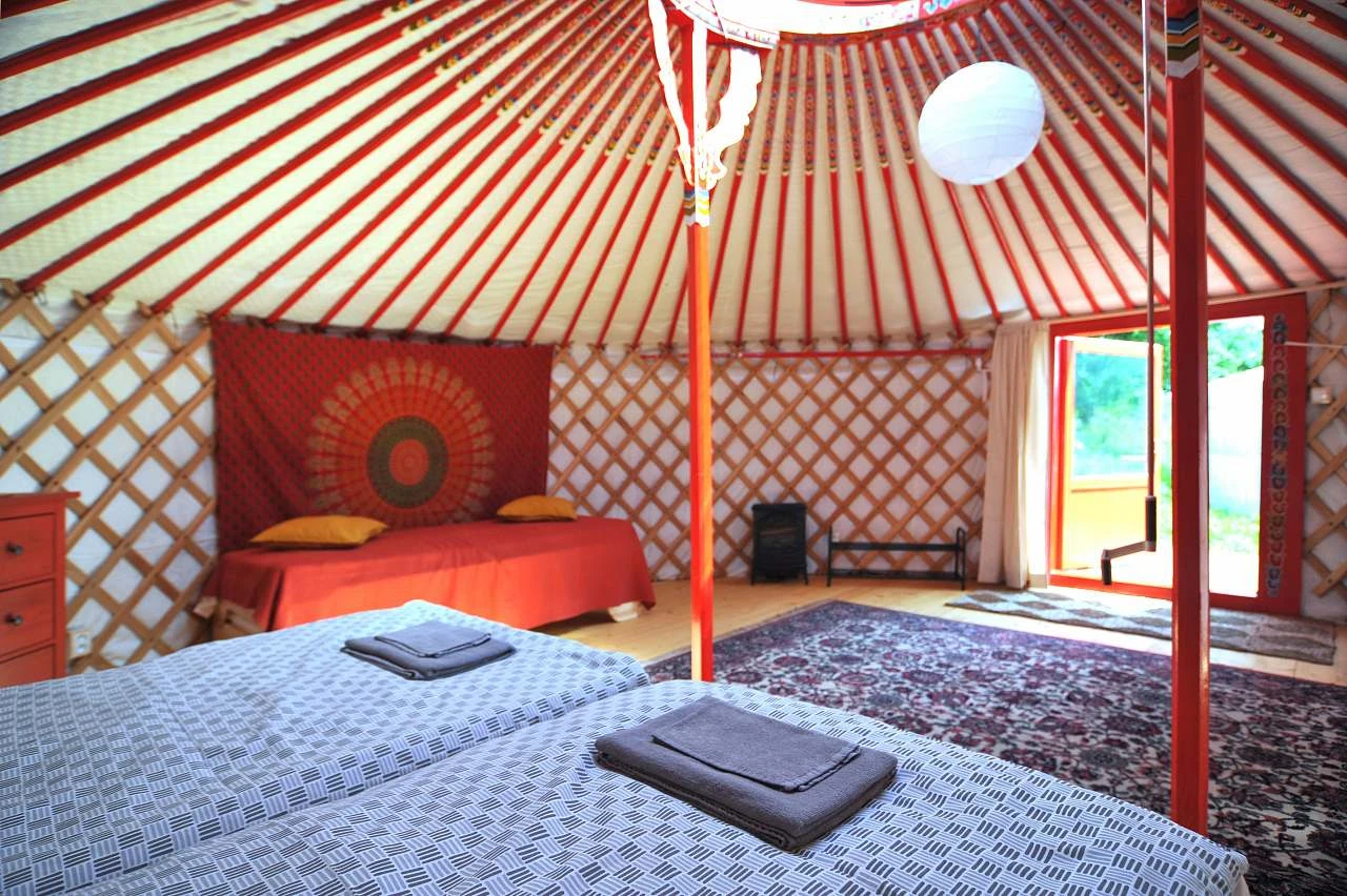Každá jurta je navržena pro 2-6 osob a je vybavena veškerým potřebným komfortem, včetně koupelny, WC a společné kuchyně s venkovní terasou. K dispozici je také zahradní ohniště, ideální pro grilování a večerní posezení pod hvězdami.