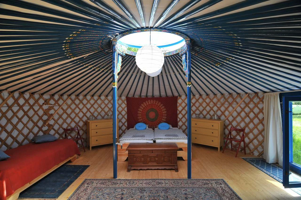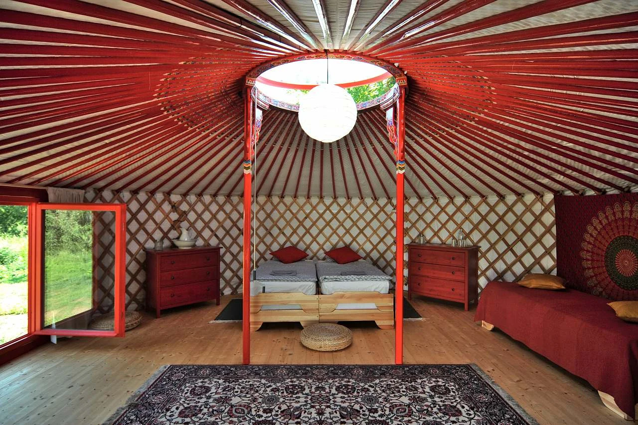 Nabízíme čtyři malované jurty v různých barvách (červená, zelená, modrá, oranžová), které pojmou 2 až 6 osob. Každá jurta má průměr 7 metrů a rozlohu přibližně 38 m², včetně vlastní dřevěné terasy. Navíc je k dispozici královská jurta s průměrem 9 metrů a celkovou plochou 66 m², která slouží jako zázemí Lesního klubu a je možné ji pronajímat od pátku do neděle, stejně jako během školních prázdnin.