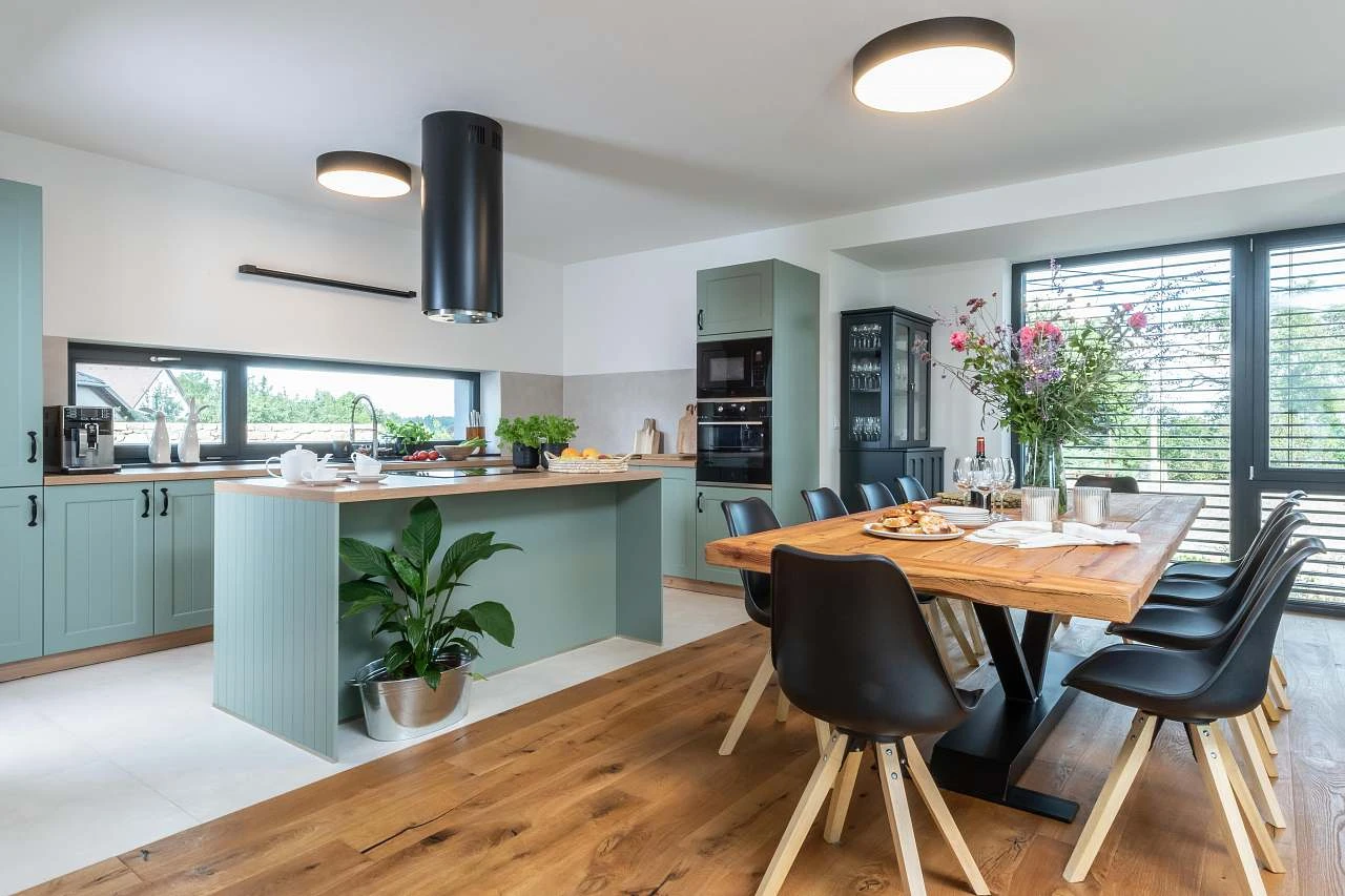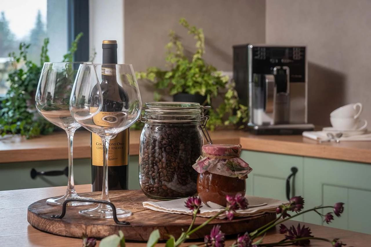 Kuchyně - myčka, ostrůvek s indukční deskou, trouba, mikrovlnka, varná konvice, automatický kávovar mlýnek na kávu a mléčným systémem, skleničky na bílé a červené víno, šampusky, skleničky na tvrdý alkohol a pivo, talířky, příbory, struhadlo, kuchyňská váha, utěrky, pánve, hrnce, mísy na saláty, formy na pečení, konvice na čaj, toustovač, ponorný mixér....